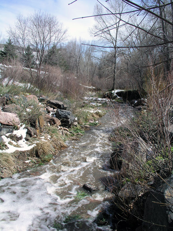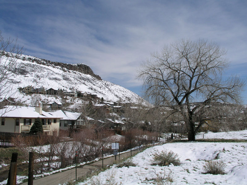 If you've had the pleasure (?) of following my photo album journals over the years, you know that I almost like taking pictures of the day after a snow storm more than I like taking pictures more than during a snow storm at night (blurry pictures of snow flakes at night from the early 90's not to be confused with blurry pictures of the moon at night....I have since discovered some sort of technology I hear is called a tri-pod.) Anyhow, we had three days of rain and snow. After 3 weeks of working almost 70 hours a week, I needed a good break from it all, so I took a walk to get some snow pictures....Colorado style, wearing a t-shirt (with all the walking, was too warm for a jacket).