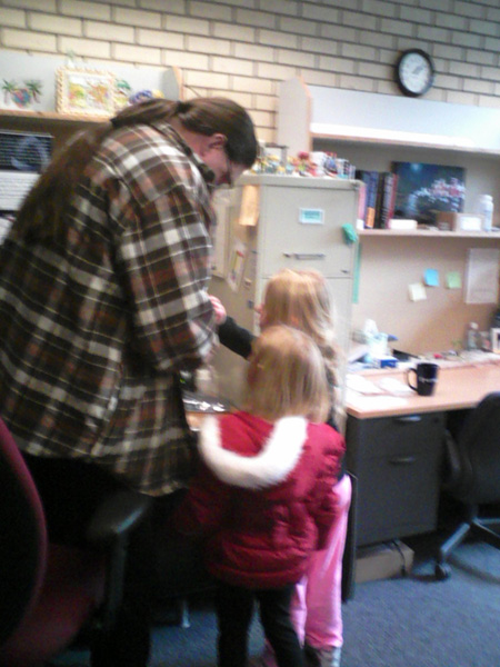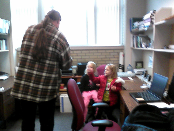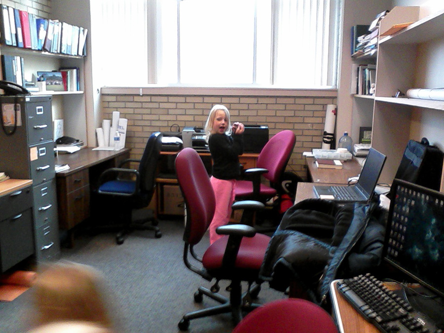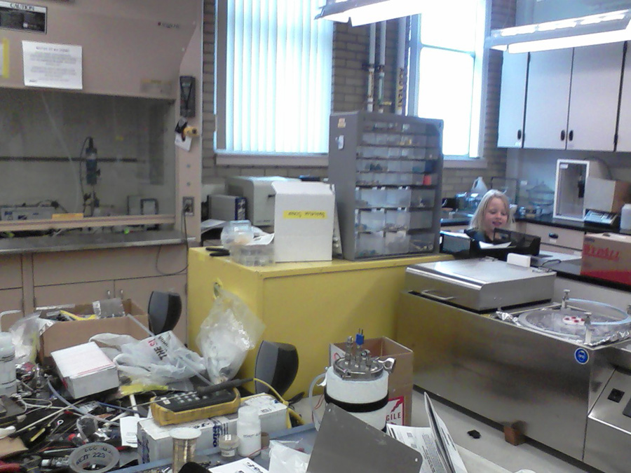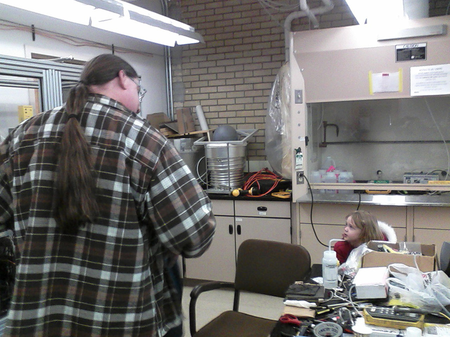 Exploring the lab. Val was very intersted in the setup and the ceramic tubes. Maddie was interested in
