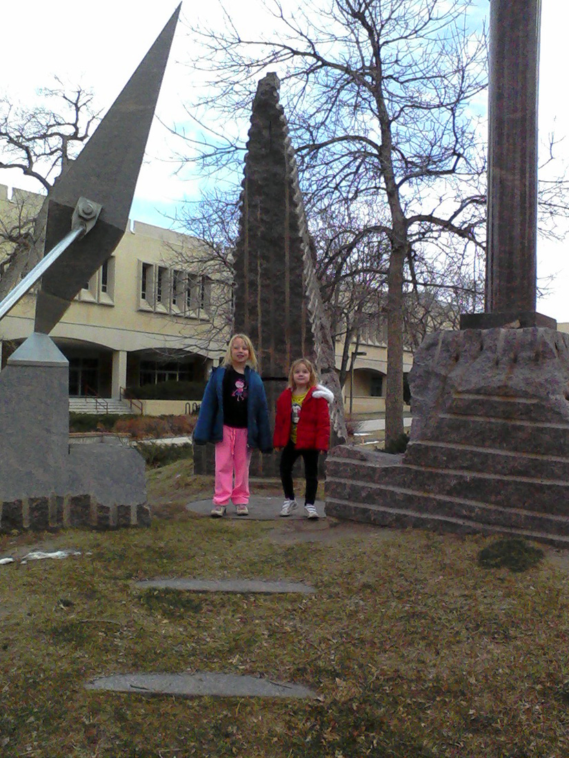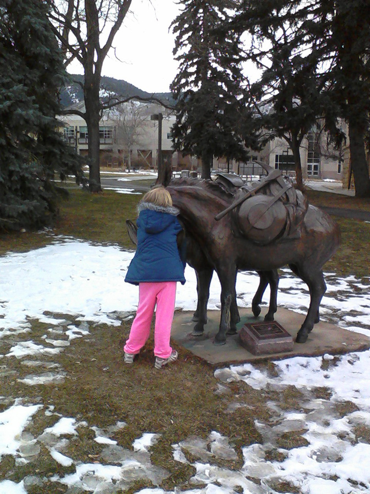 Exploring the sculpture in the school commons and meeting the statue of Blaster, the donkey (school mascot).