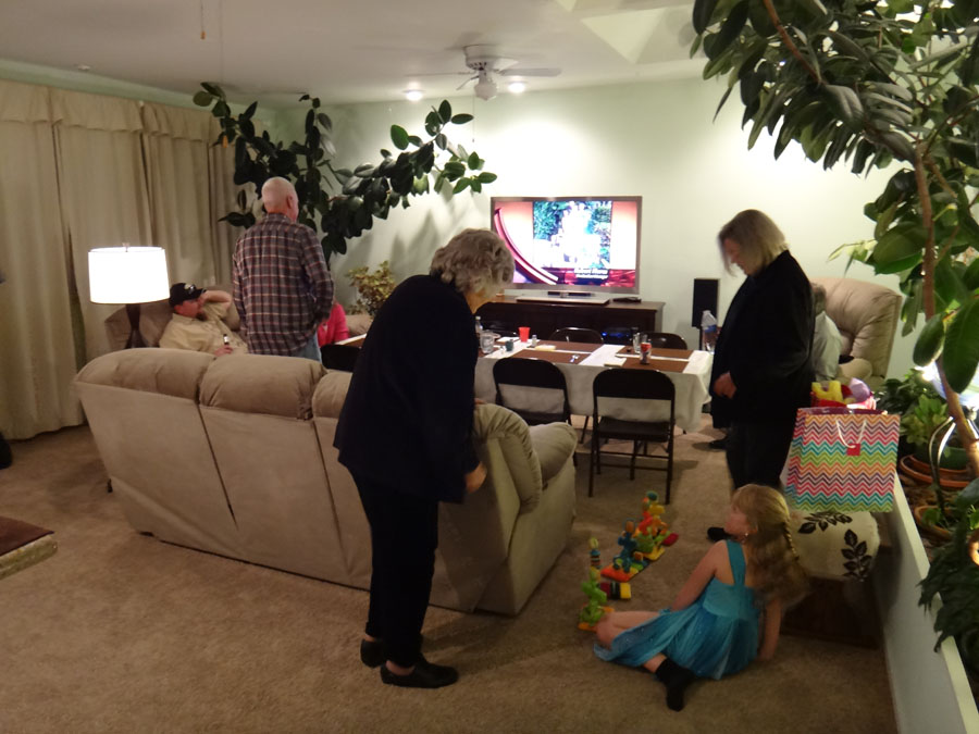 Grandma Kitty and Auntie Linda (Terry's mom and sister) looking at the train Maddie built: