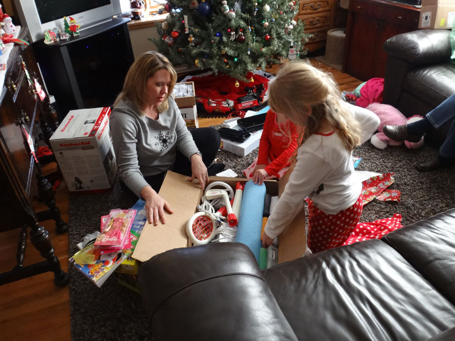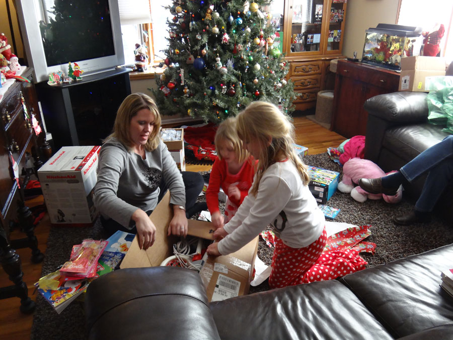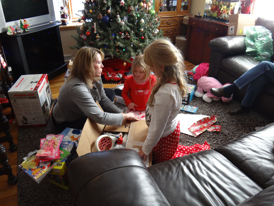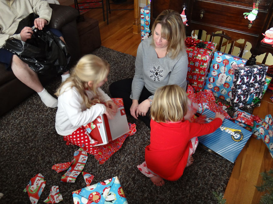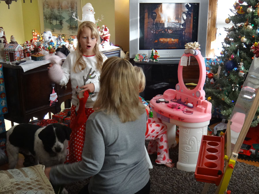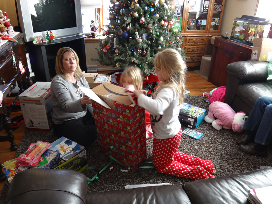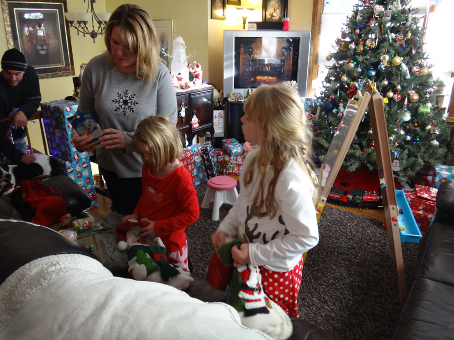 Rannae helps Maddie and Val with the two big gifts and stocking before breakfast.