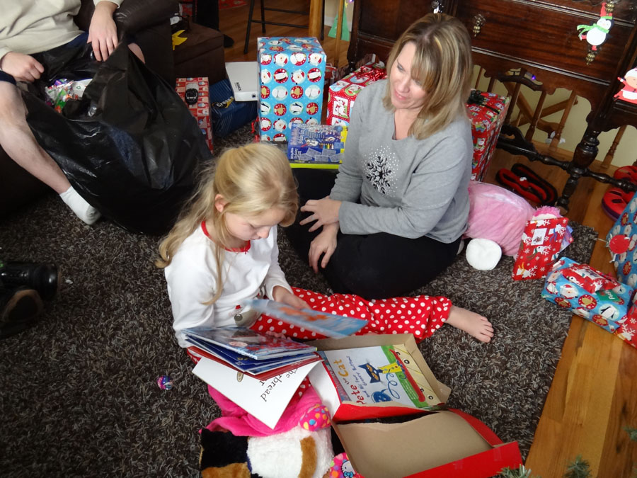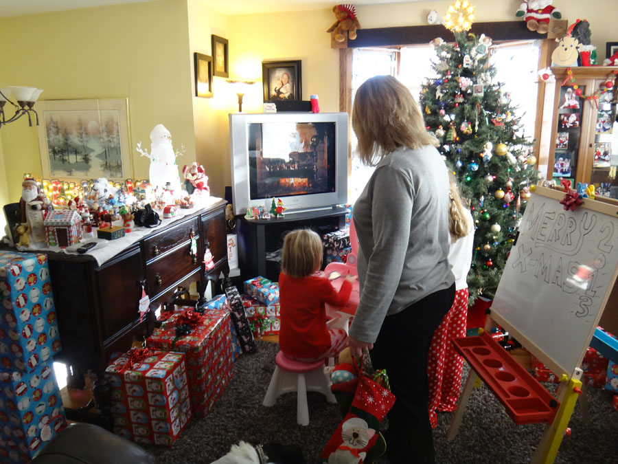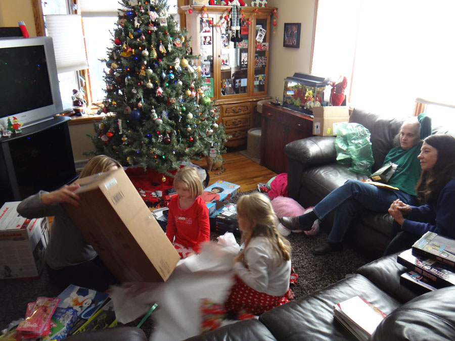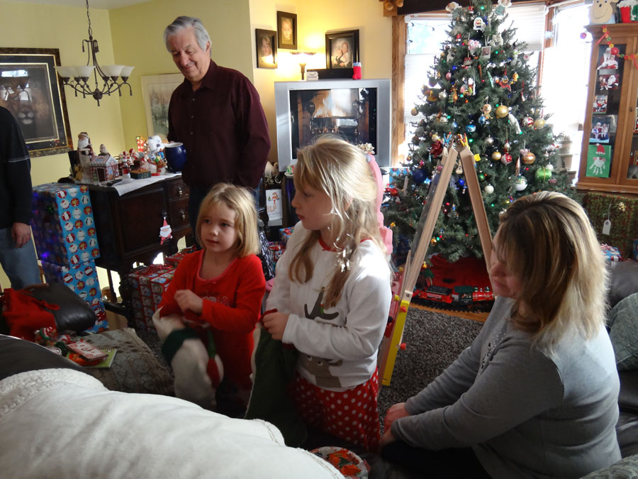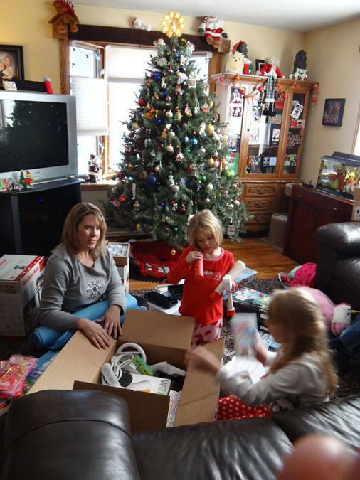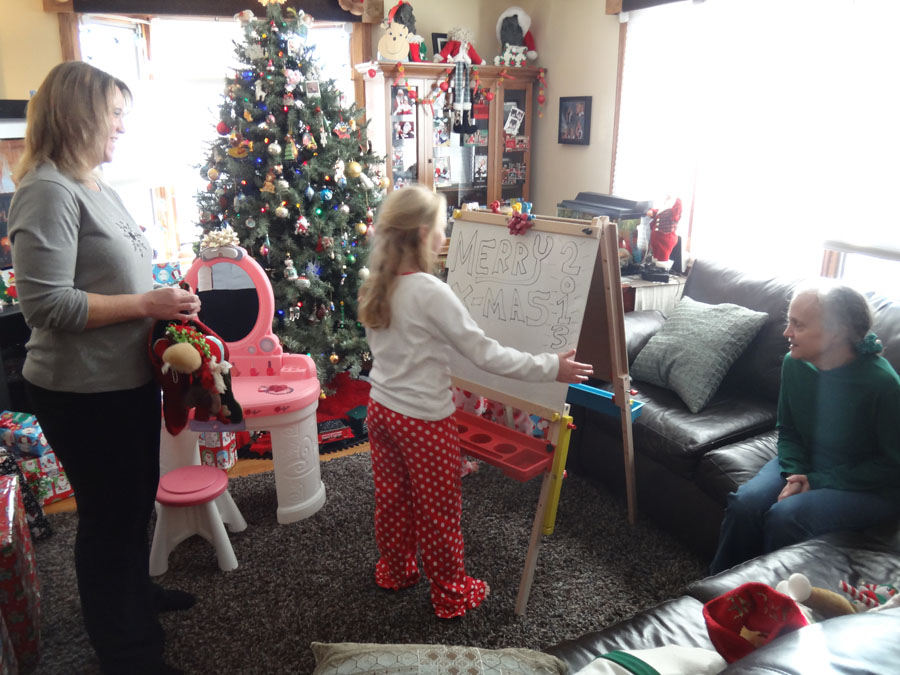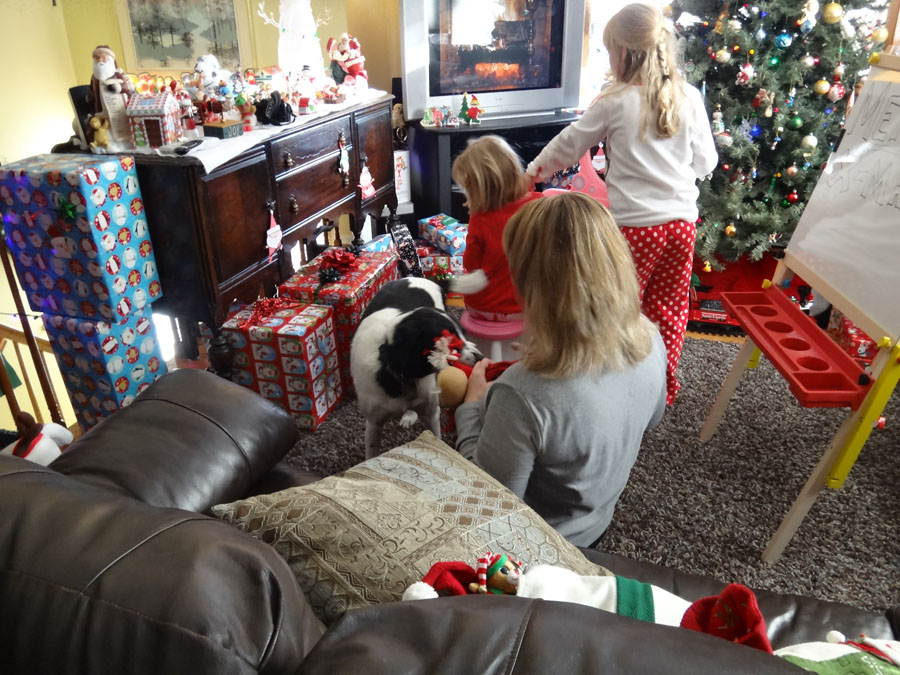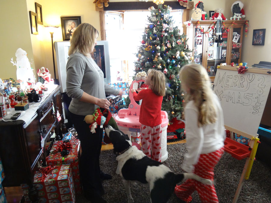 Rannae helps Maddie and Val with the two big gifts and stocking before breakfast.