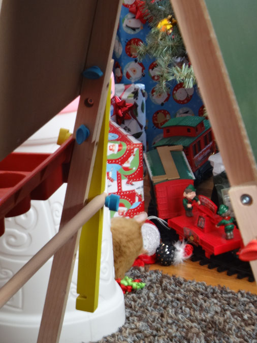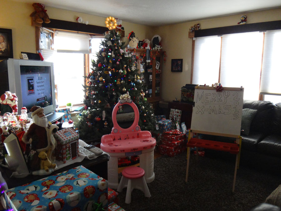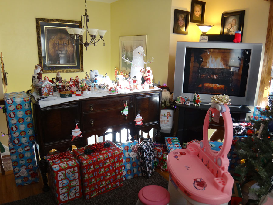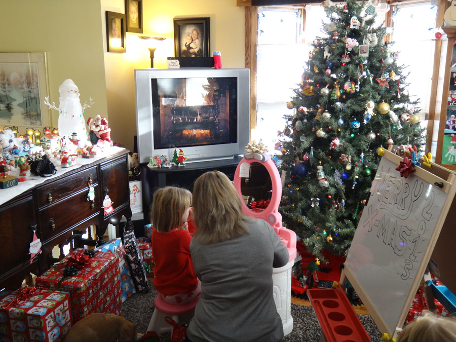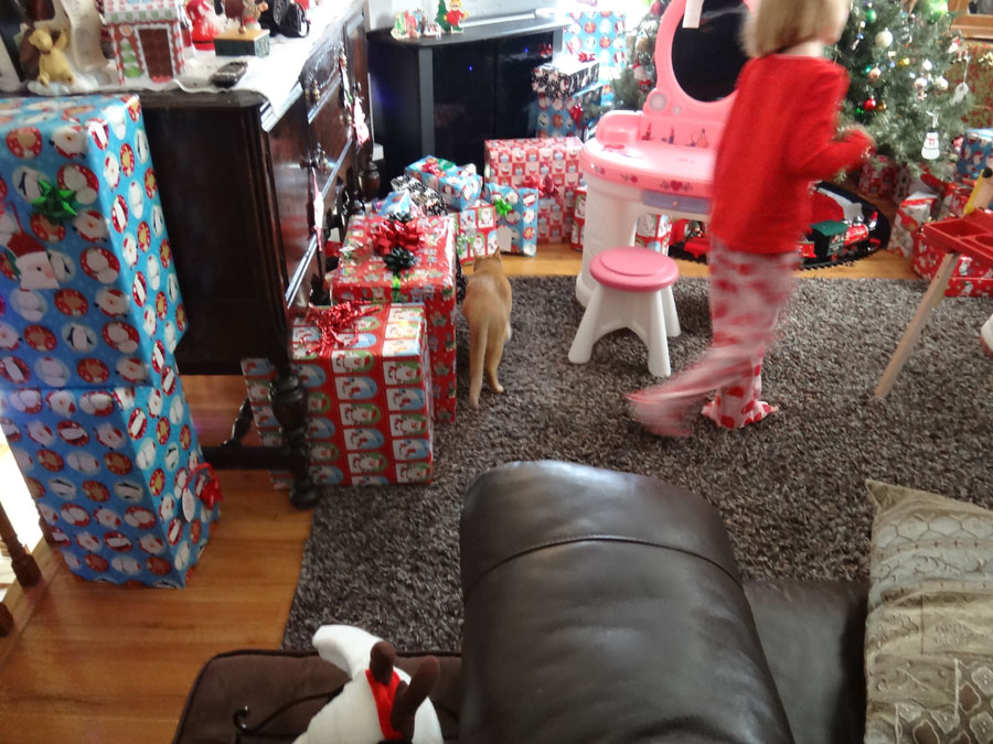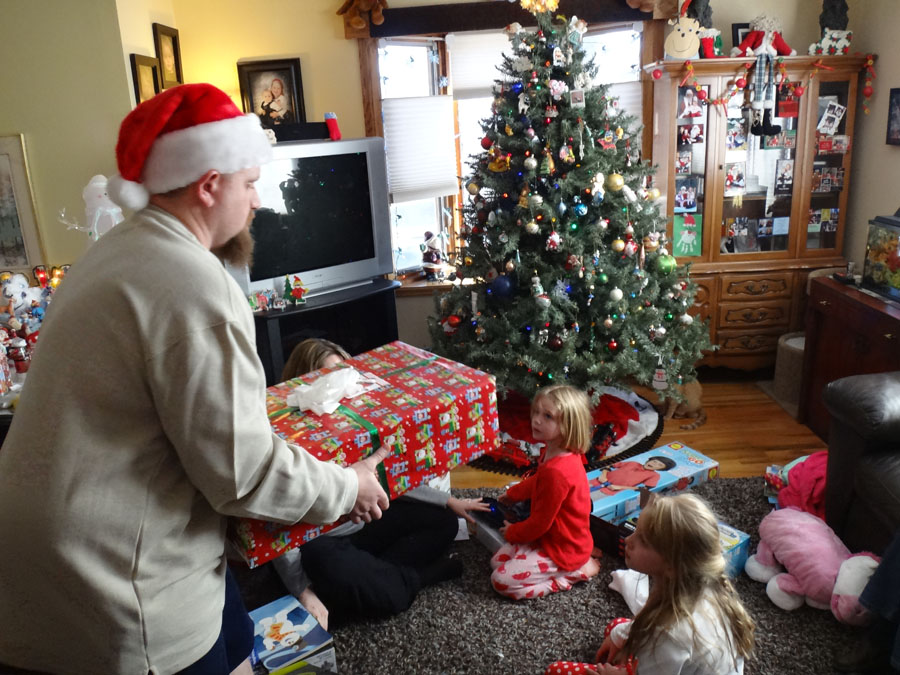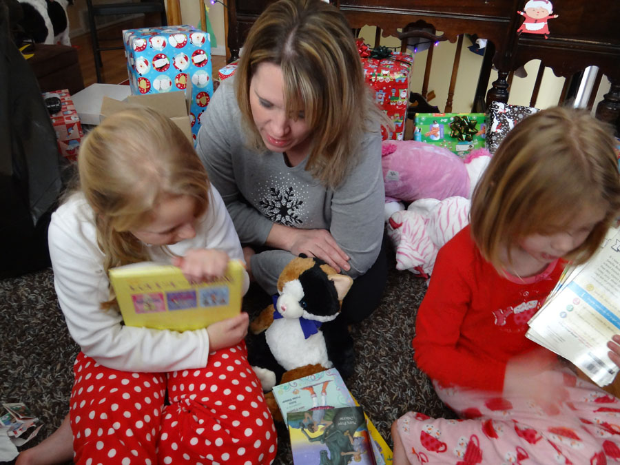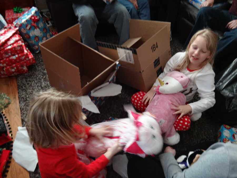 Rannae helps Maddie and Val with the two big gifts and stocking before breakfast.