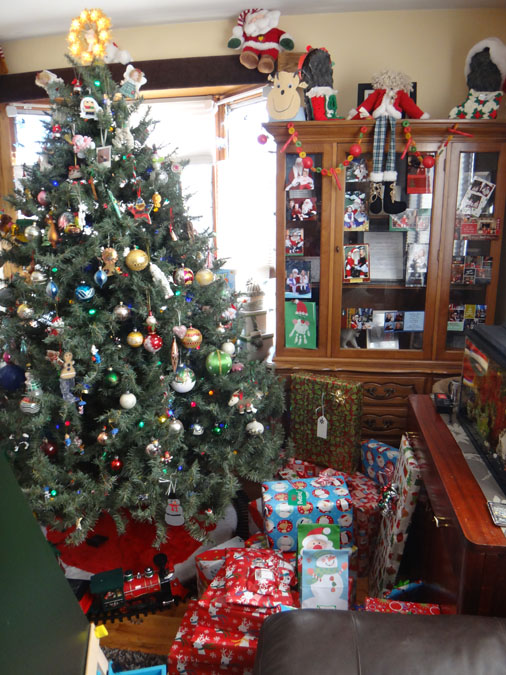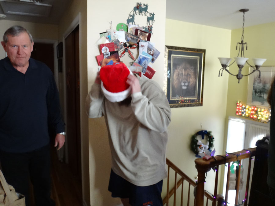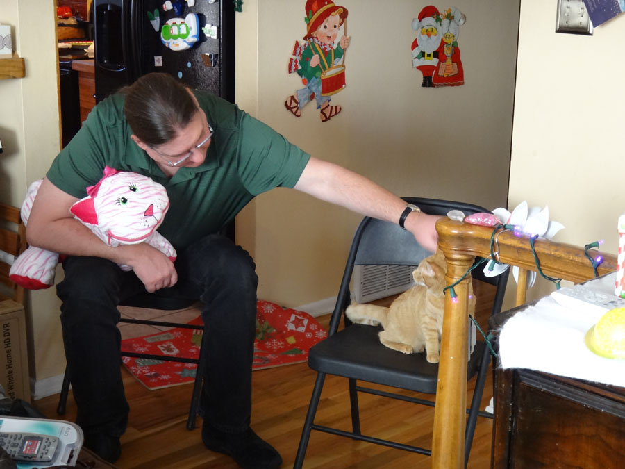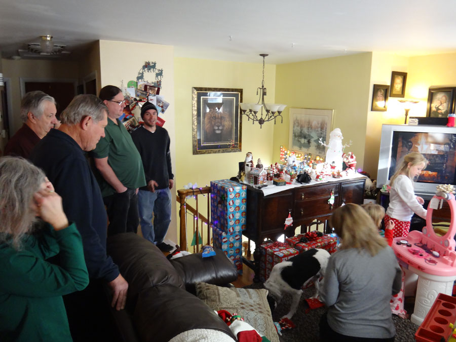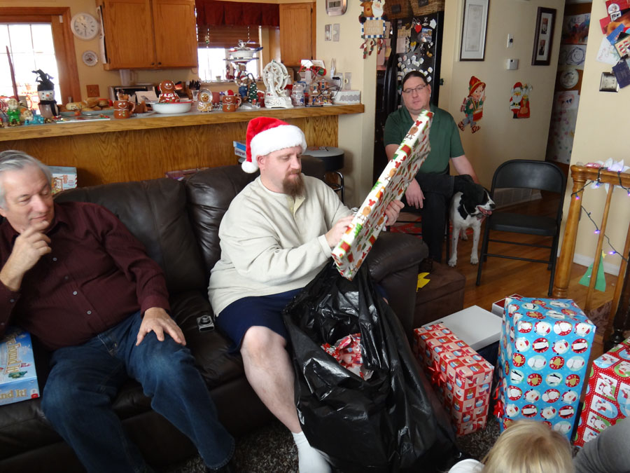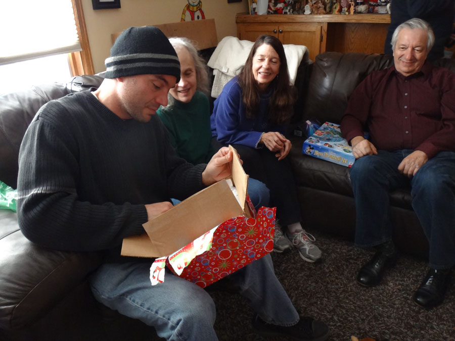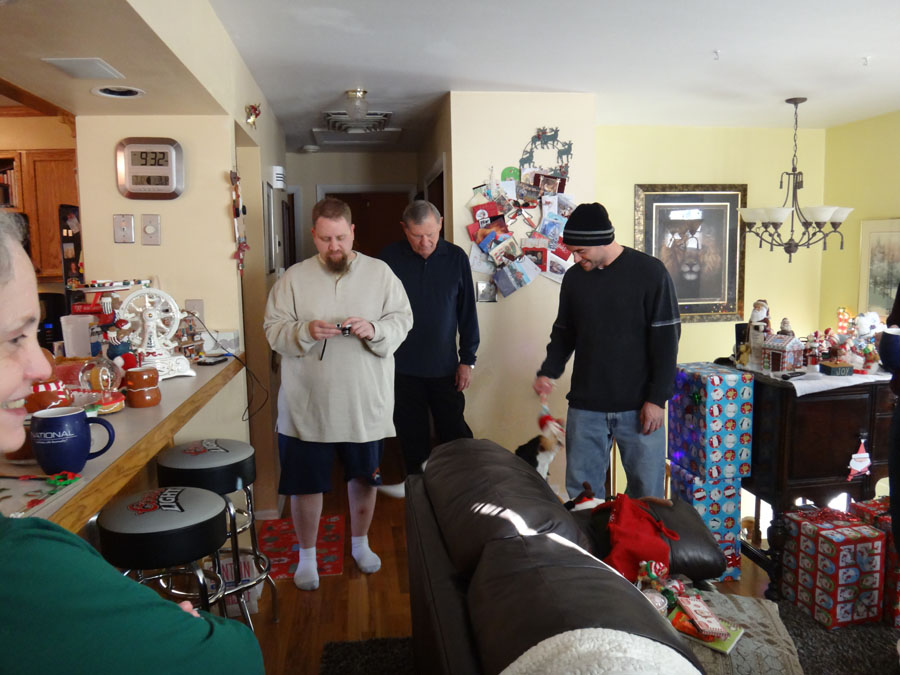 Peaches visits my bro and mom, Gwenn watches Maddie open gifts, Terry's happy, and Rob is hiding from me.