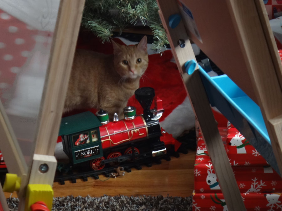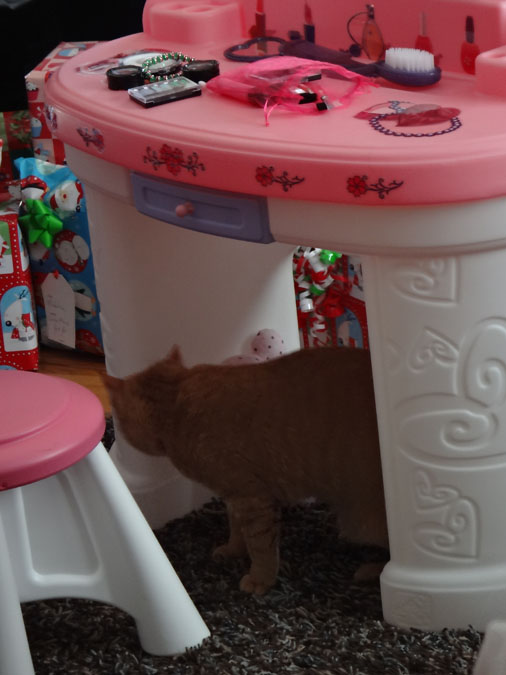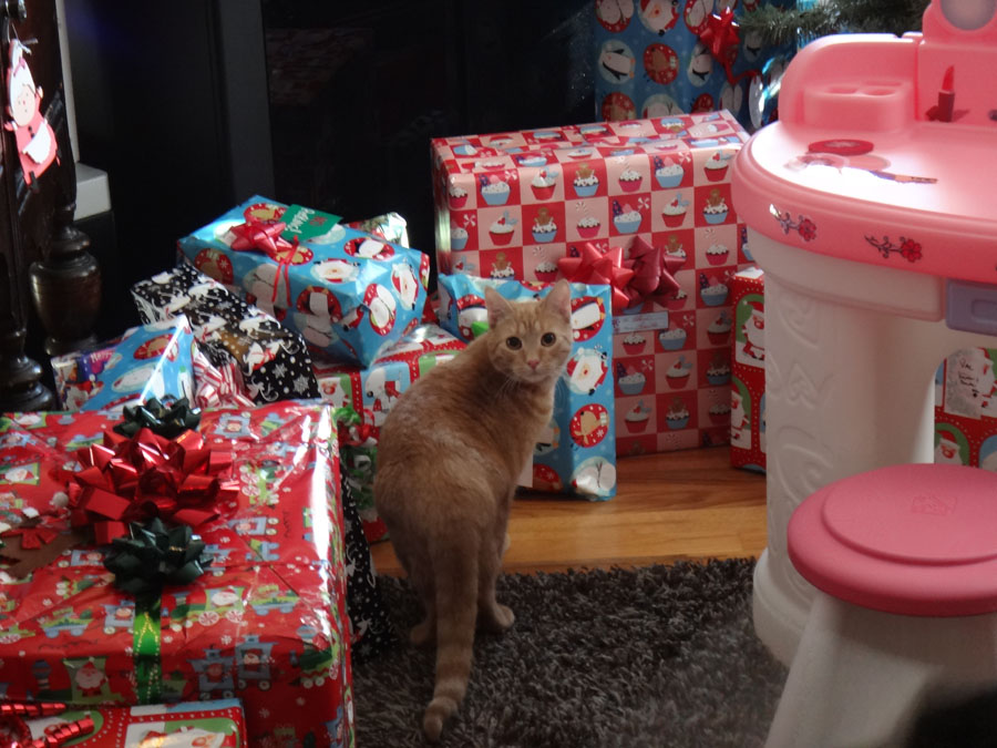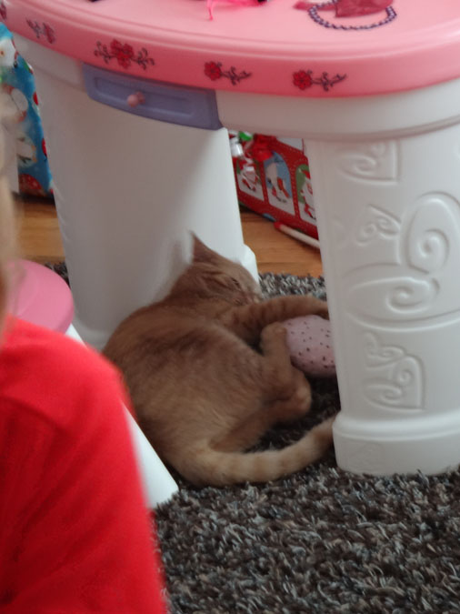 Peaches, the kitten Rannae got for her birthday, quietly enters the scene.