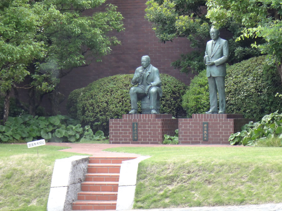 to the Hachi symbol (meaning 'eight') often found on the sake bottles the statues hold.
