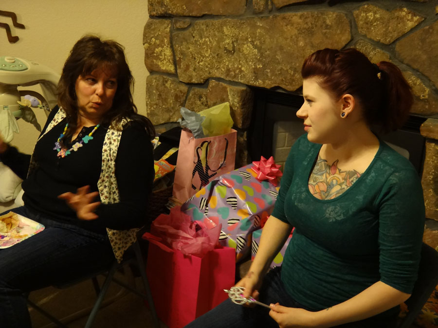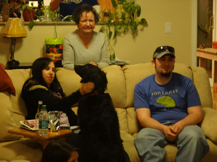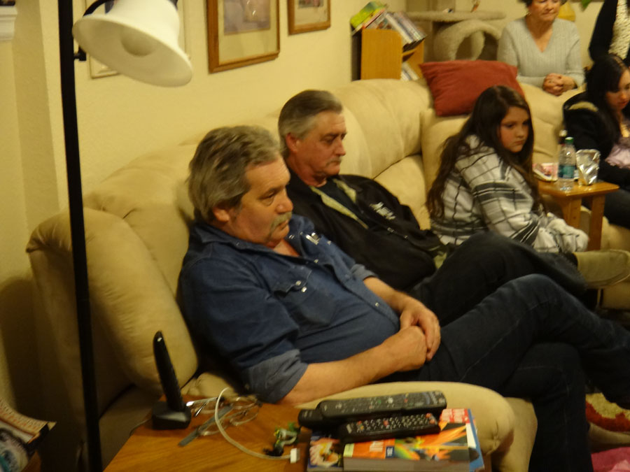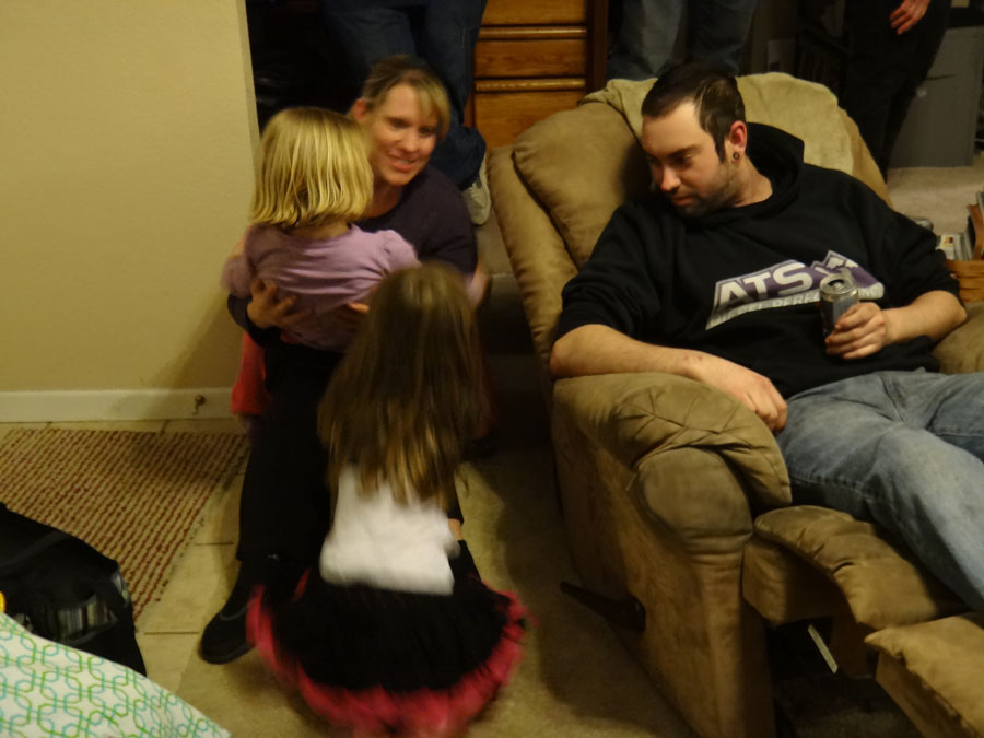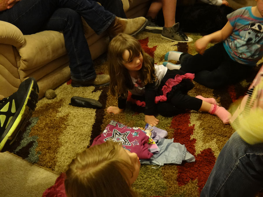 Clara sitting with her Aunt Sarah and Evan, while Pat and Erika's oldest granddaughter, Brooke, looks on.