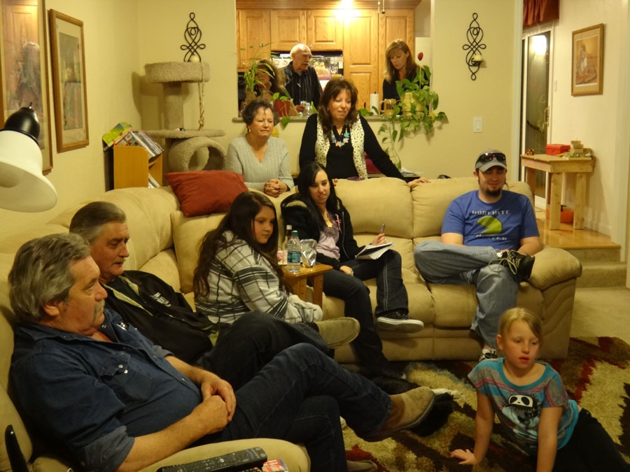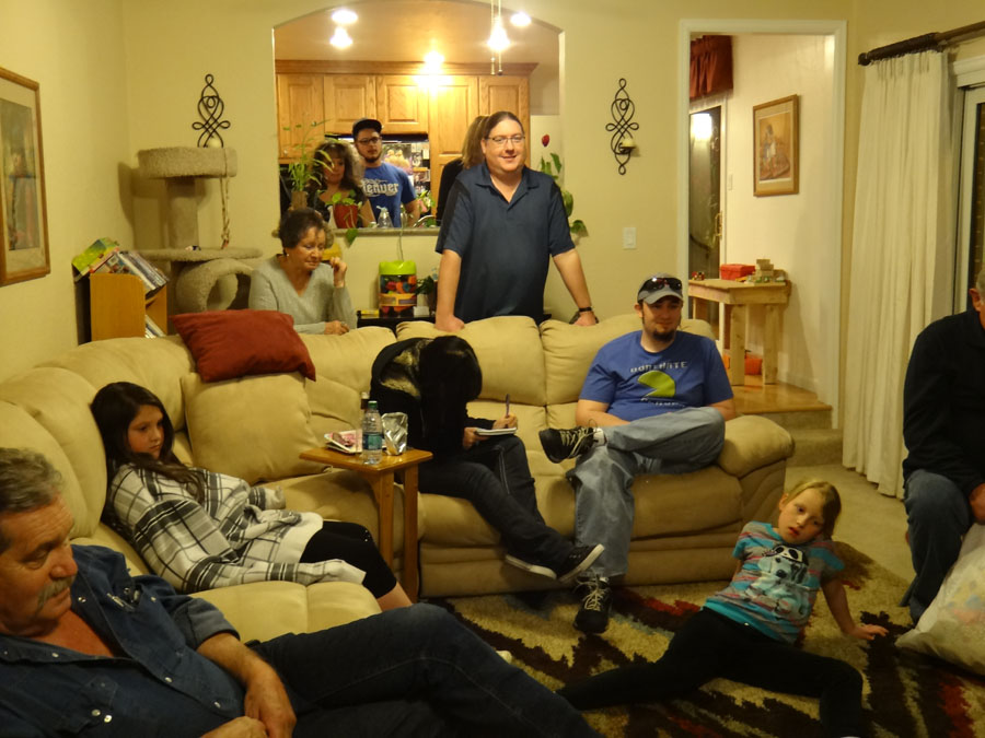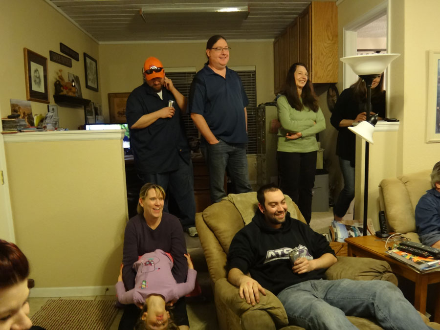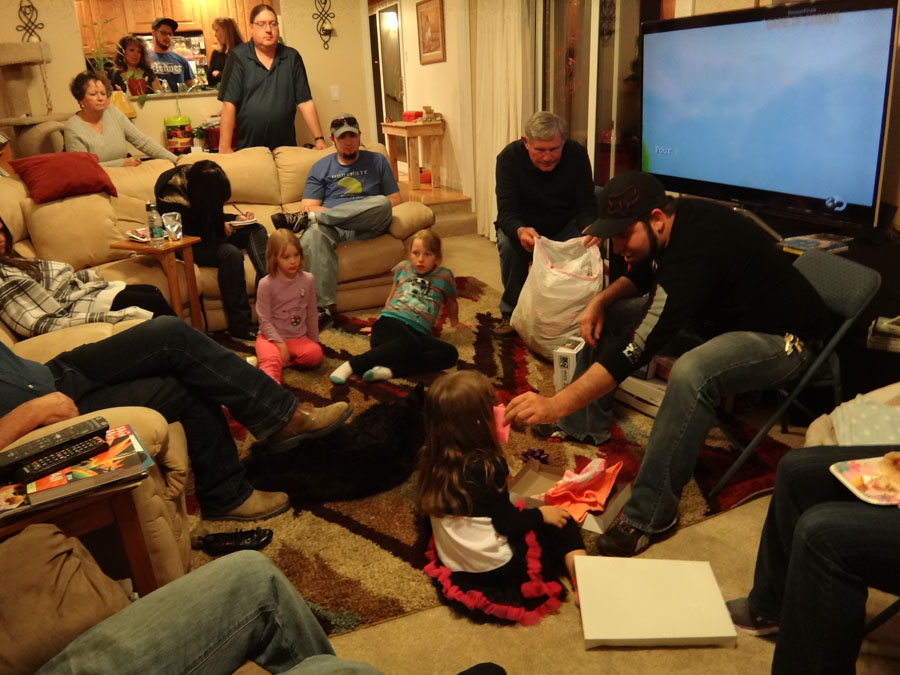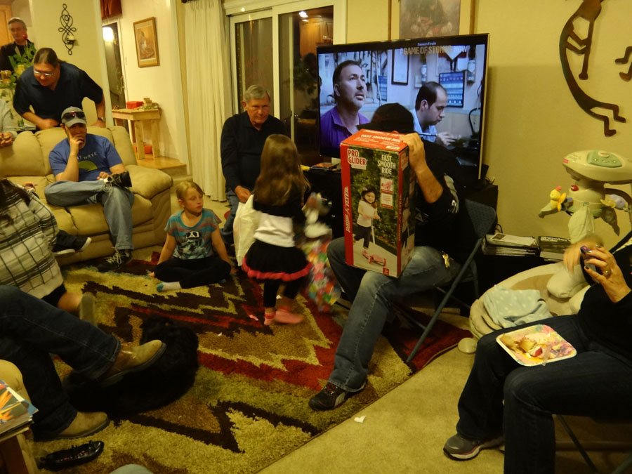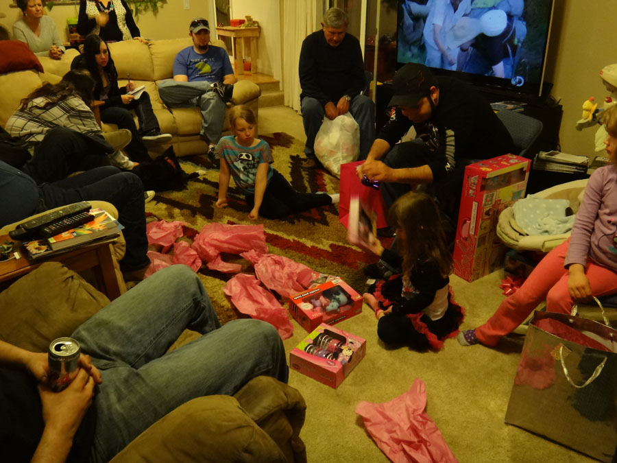 Clara sitting with her Aunt Sarah and Evan, while Pat and Erika's oldest granddaughter, Brooke, looks on.