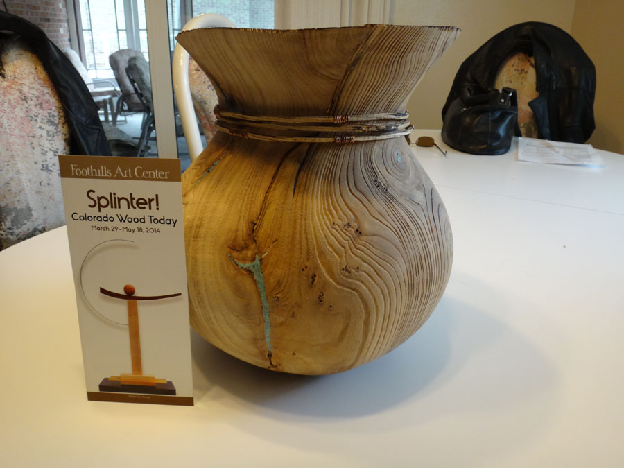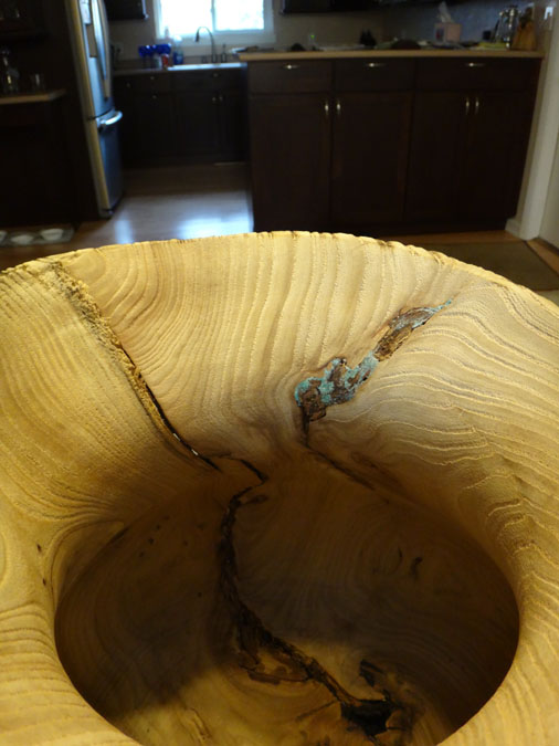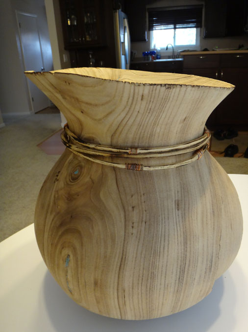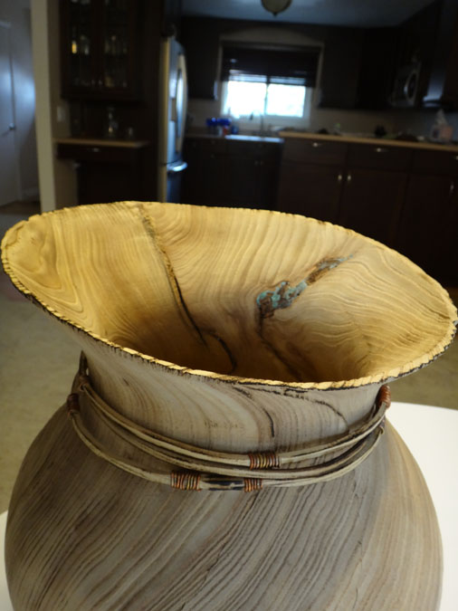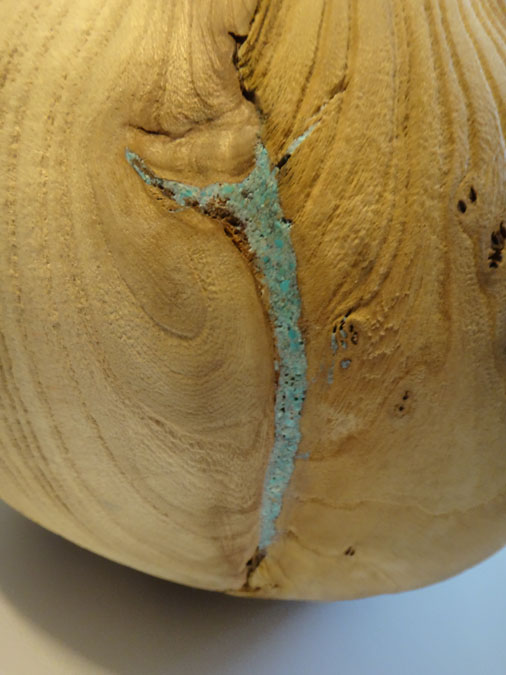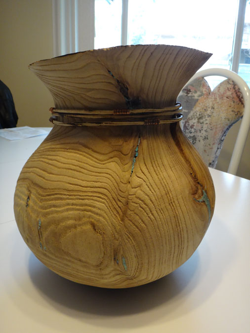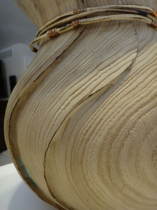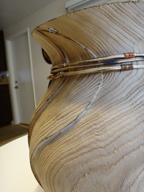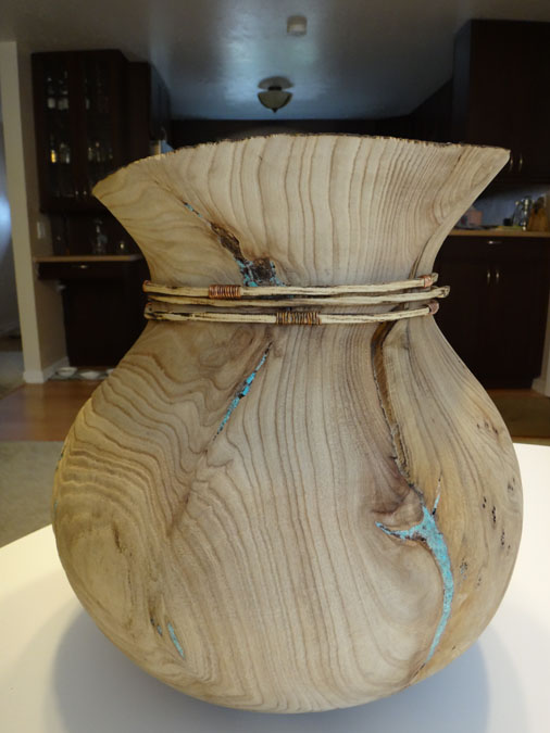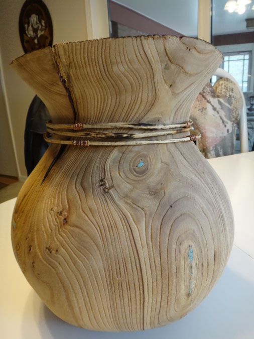 It is made of Elm (sandblasted and carved) with turquoise, bent wood, and copper. I really love the texture and the look of the ridges.