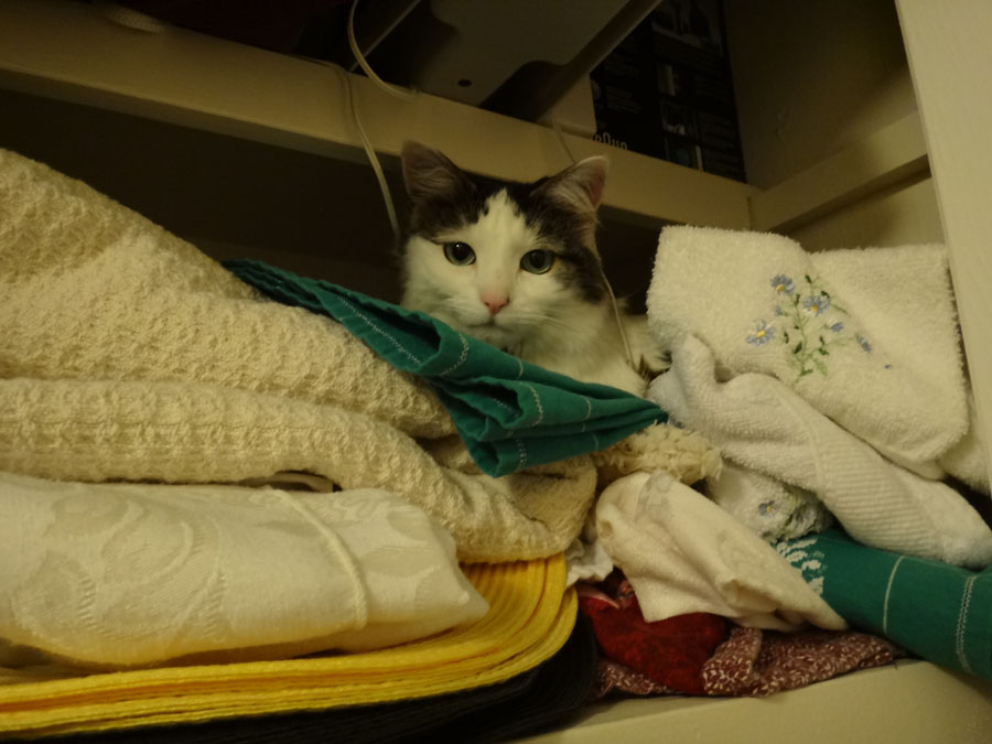 I took these pictures because she seemed so proud to have found her way to 4th shelf status.