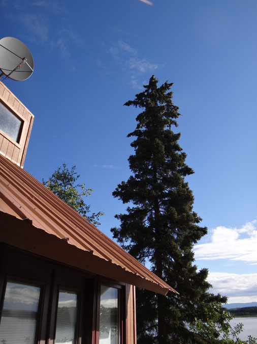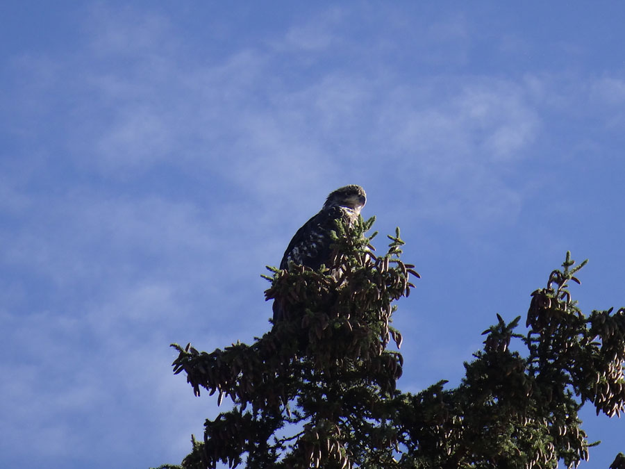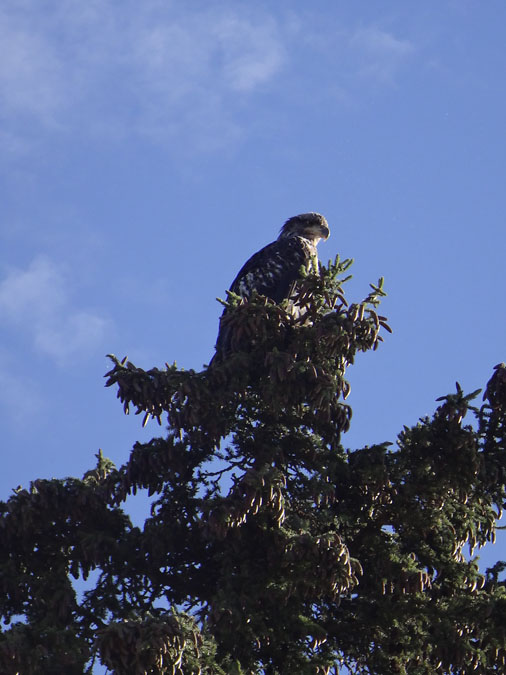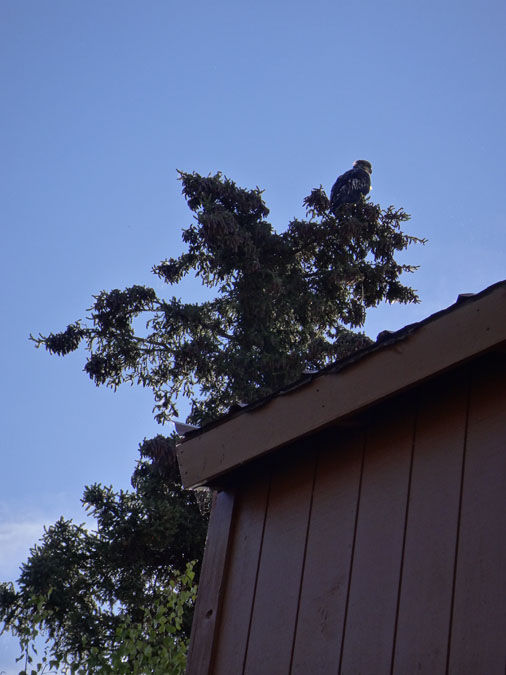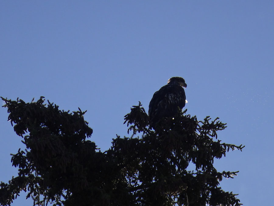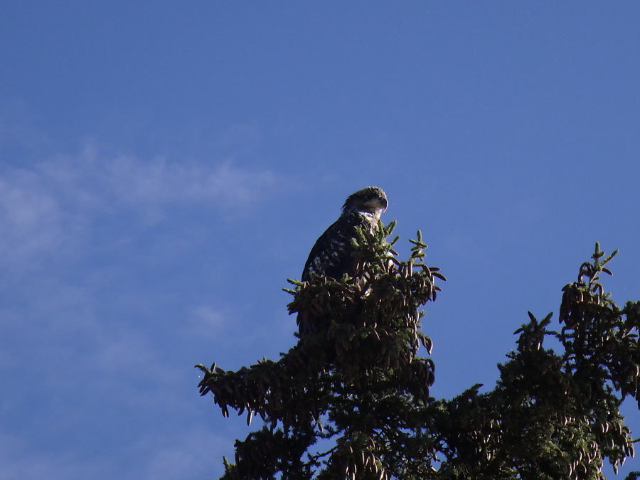 On the morning we were leaving, I found a younger bald eagle sitting right above the cabin Mike and I had been staying in.