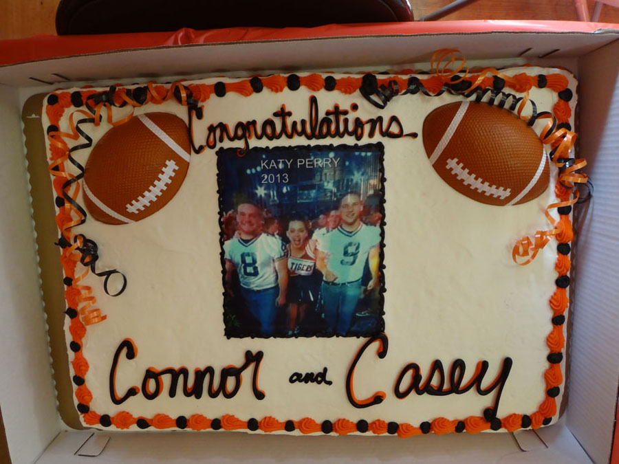 Casey and Connor graduated from high school! We went to their party after Valerie's birthday party. Here's the cake, commemorating when they met Katy Perry: Here's Casey with Mike, Gwenn, and Terry: