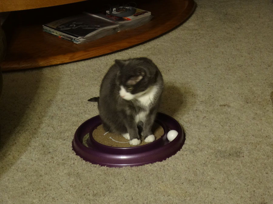 I finally got better pictures of Muggins on his hovercraft! He loves to sit on that thing,