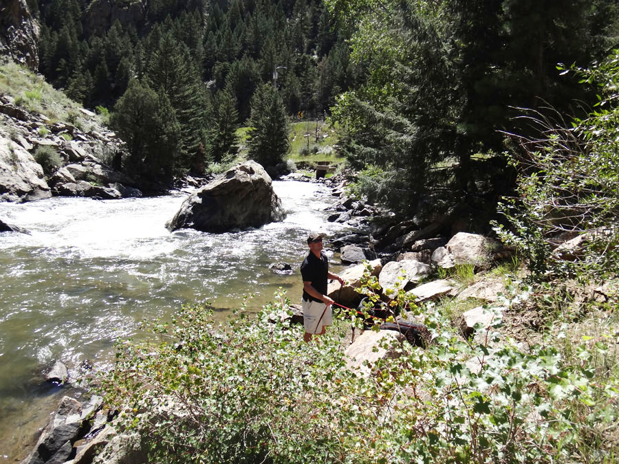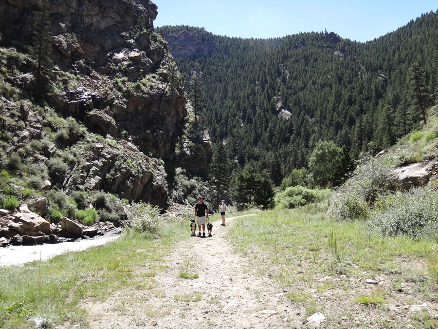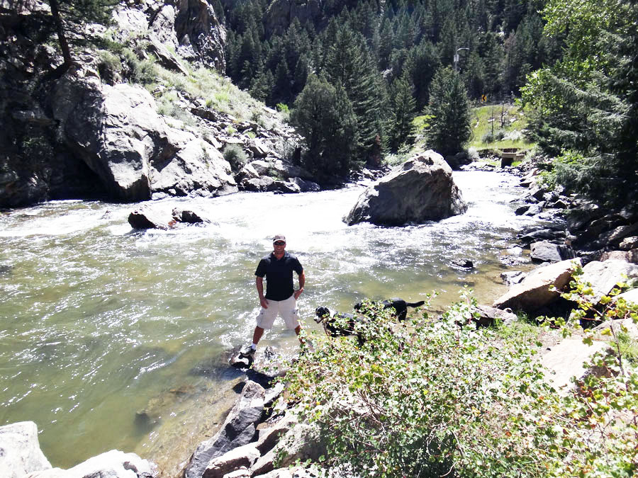 Road trip! 8 people and 3 dogs headed into the mountains.Here's my brother and his dogs along Clear Creek.
