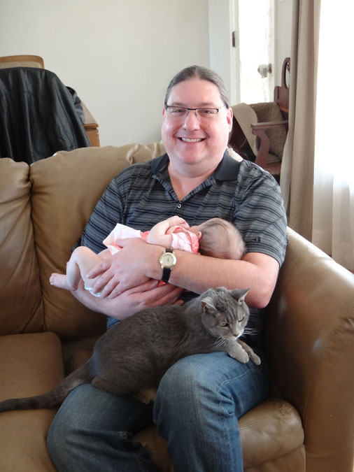 Here's Mike getting all the love in the world - with Josh White & Des' baby girl, Sylvia (born in January) and Des' cat, Lotus (who has more seniority than Josh).