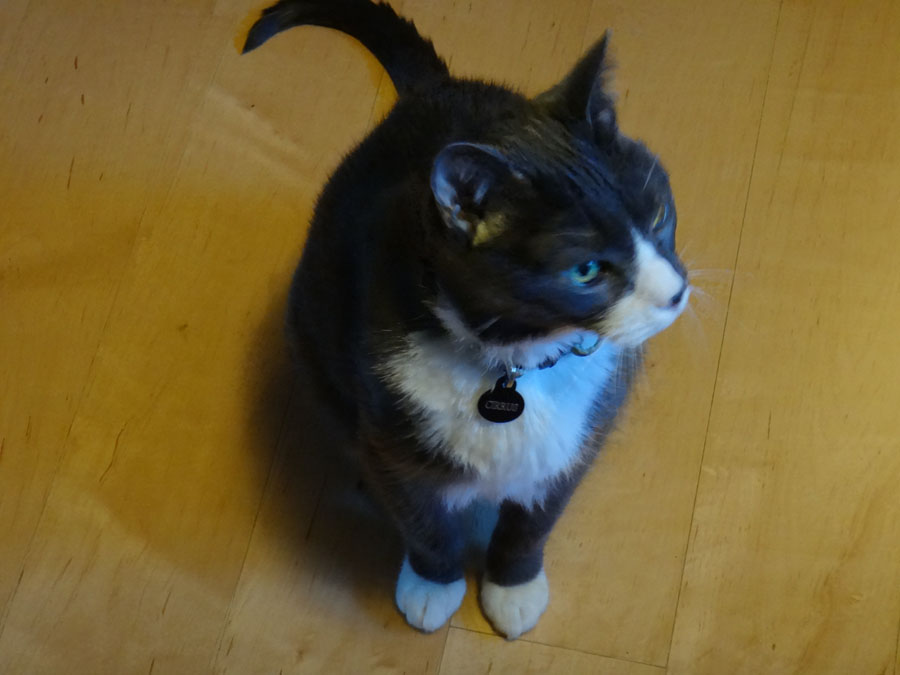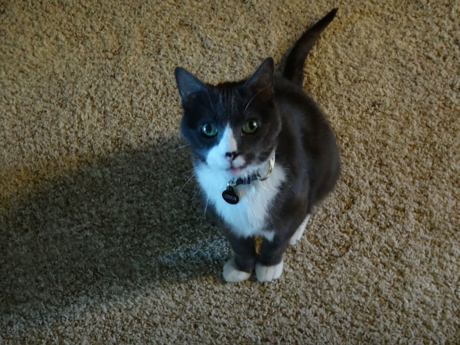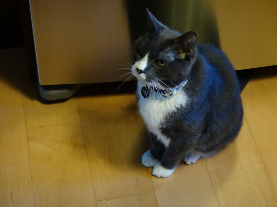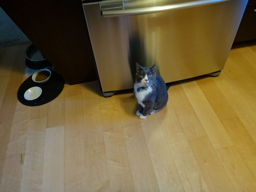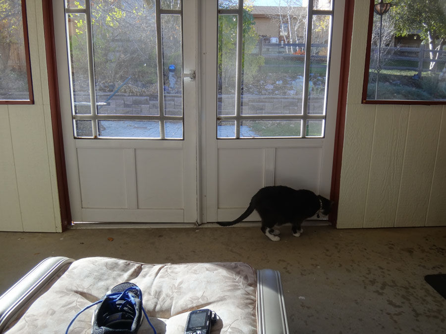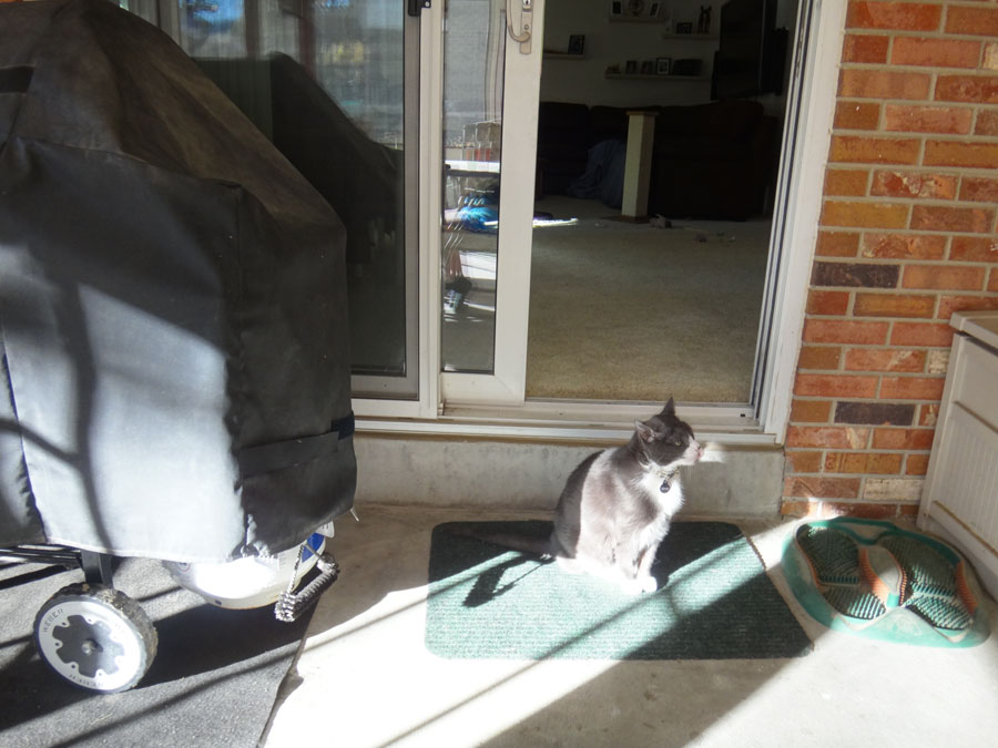 Too much activity makes Muggins sad and worried (Mike filled the wheelbarrow tire with air.)