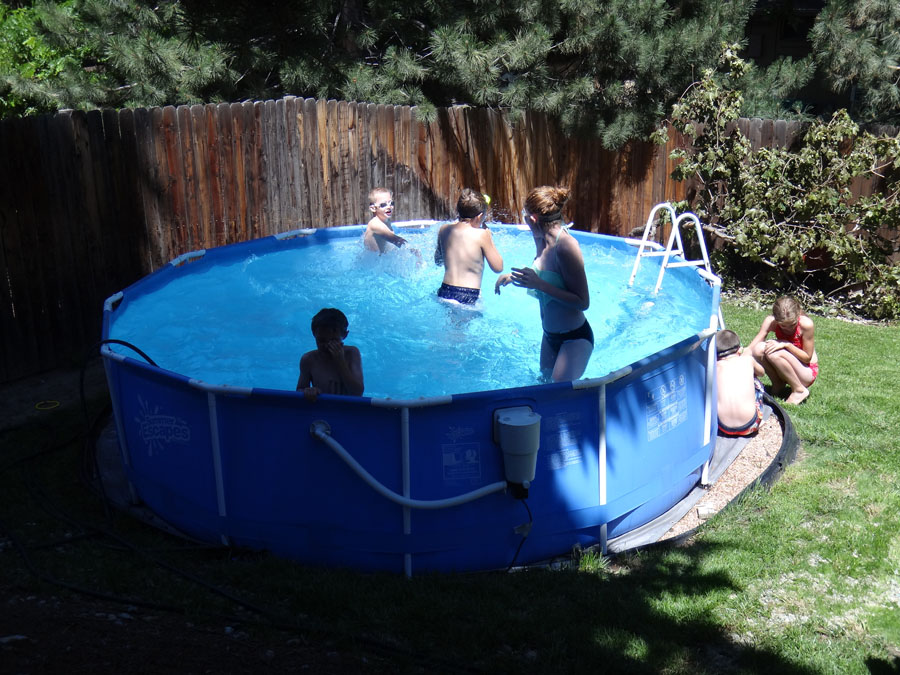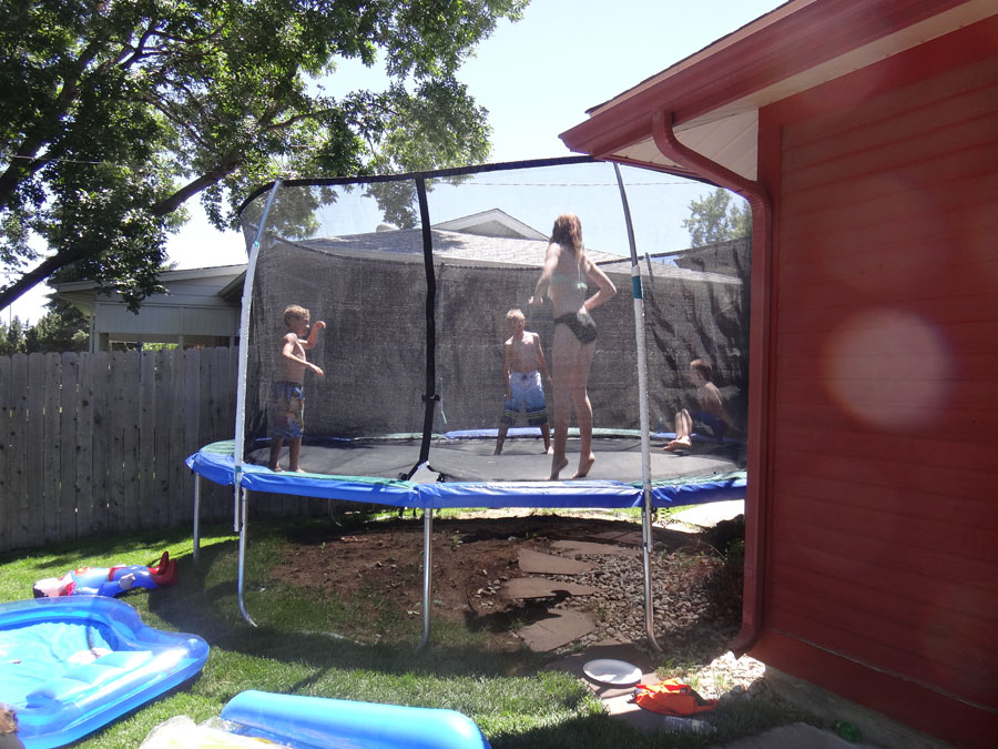 Will, Leah's kids, Alexia and Rory, and another kid on the trampoline