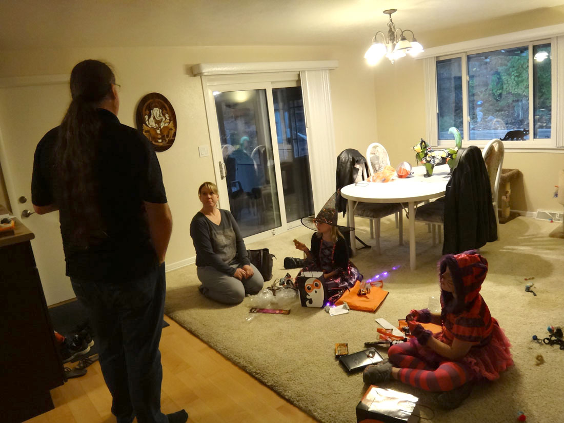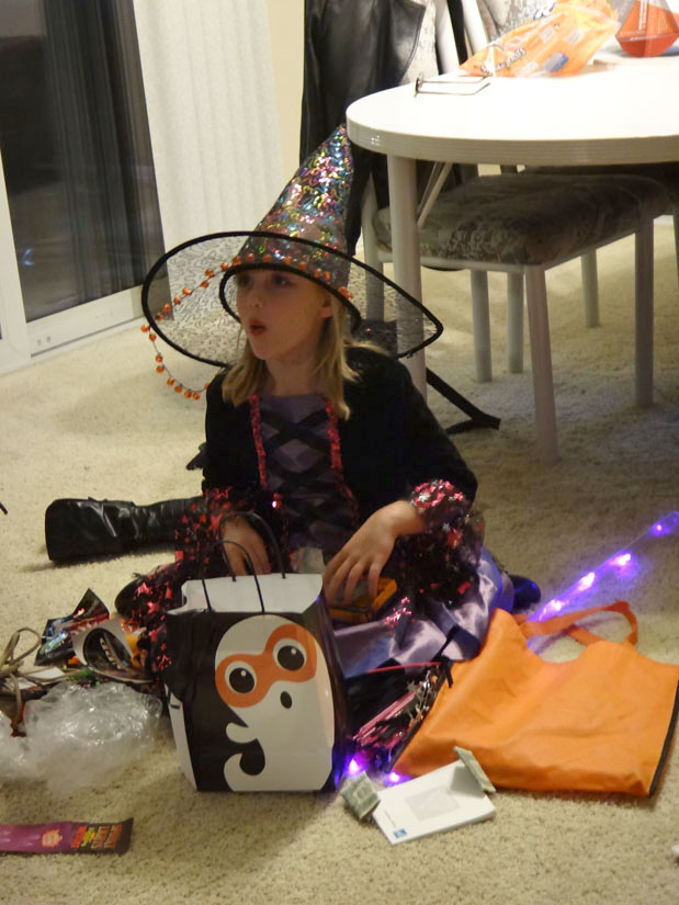Valerie, working on her glowsticks while waiting to give candy to trick or treaters: