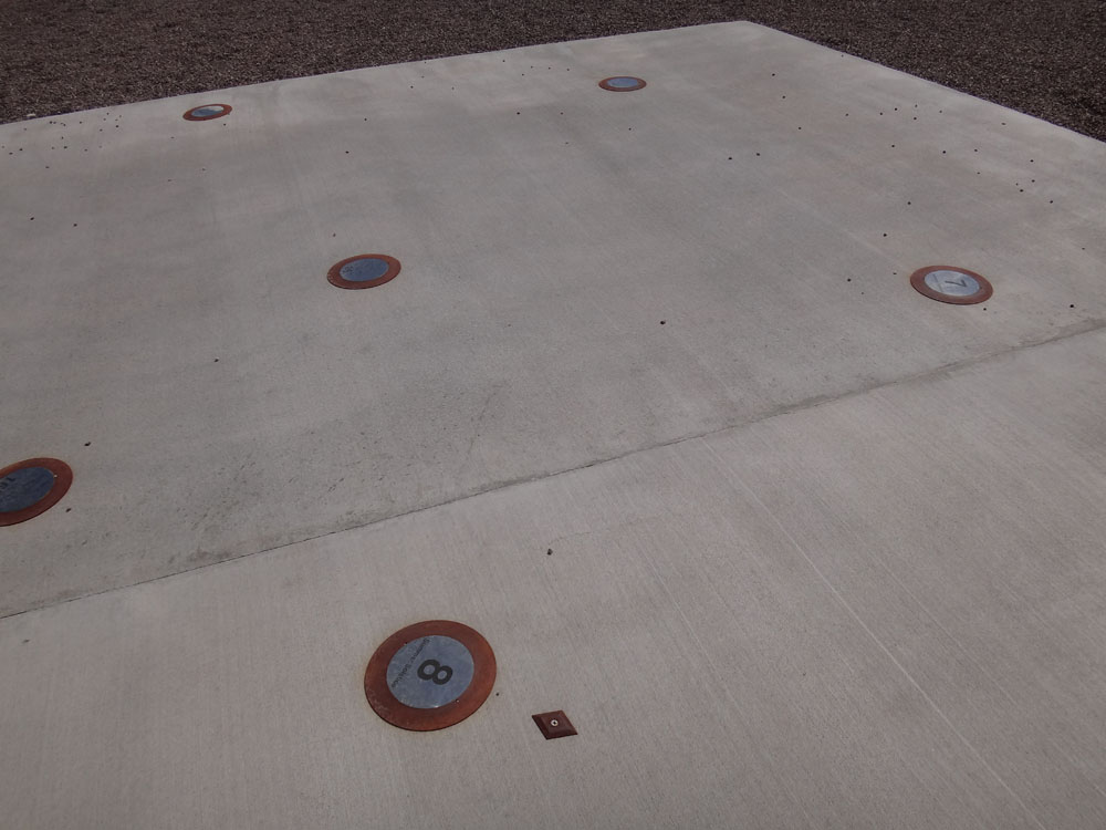 trace a line toward one of the concrete piers.The markers for the Summer Solstice are closest to the central sphere and its post, with the markers for the Winter Solstice the farthest, and the ones