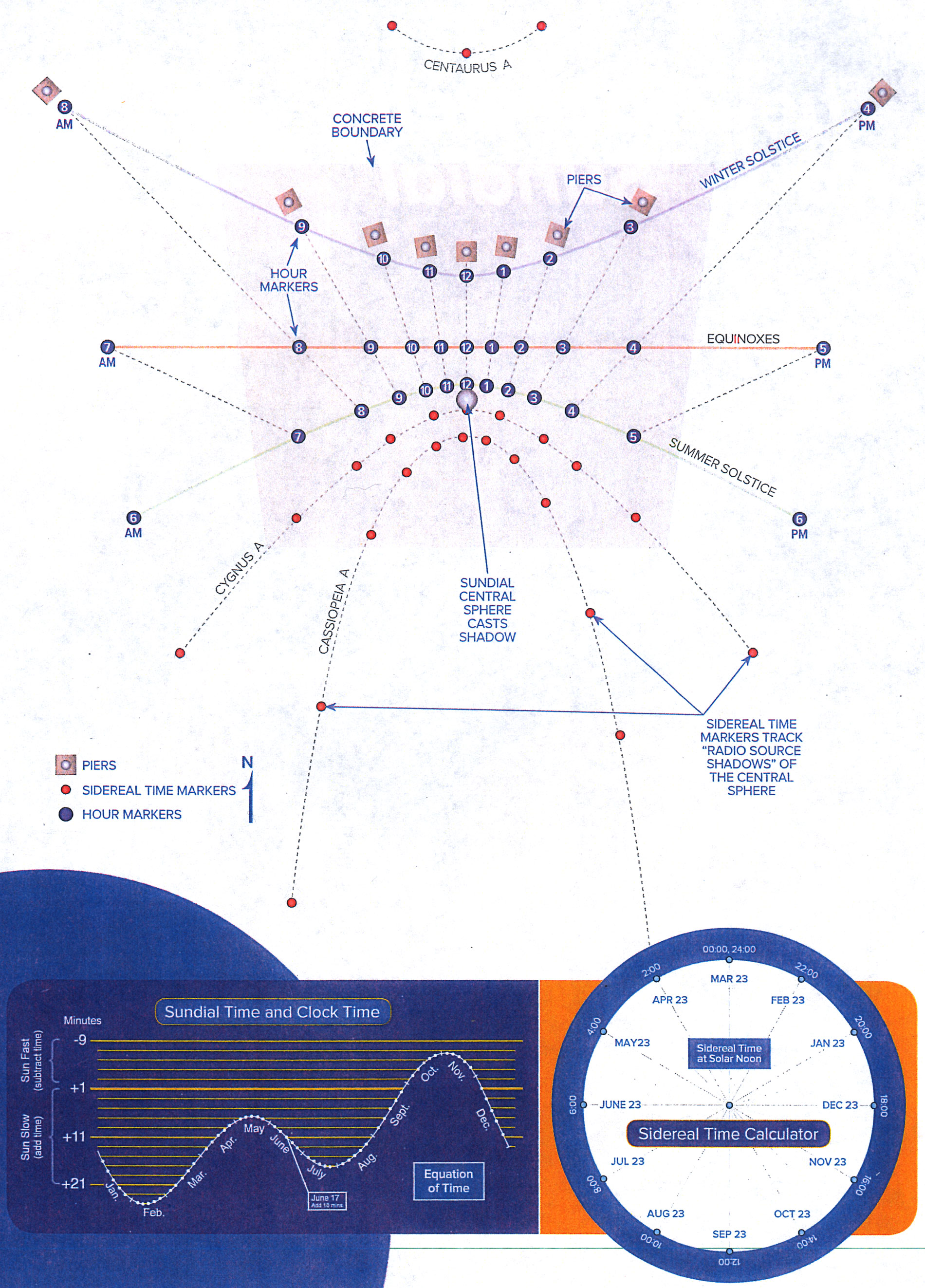 Centaurus A are north of the main portion of the sundial, while those for Cygnus A and Cassiopeia A are south of the sundial's main area.To find the location of these objects in the sky, you first must determine the local sidereal time, or star time, which differs from the