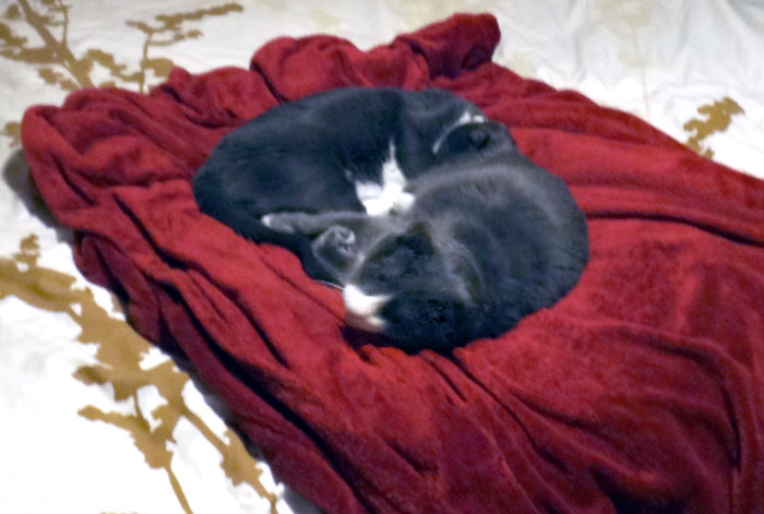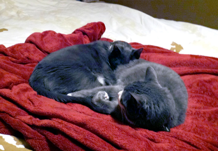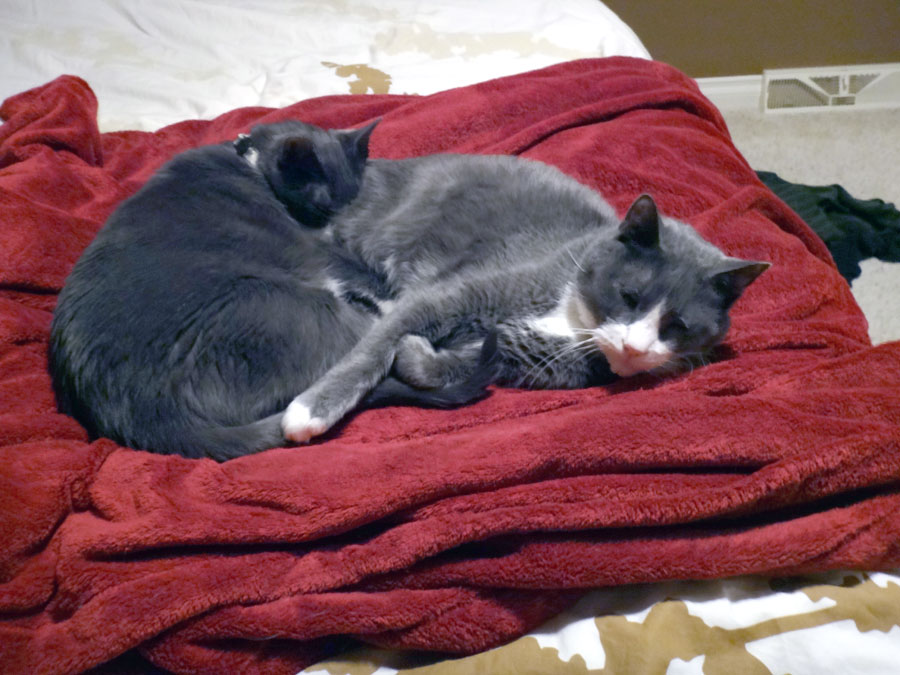 Cirrus looks so blissfully happy, but Muggins seems to wish he would pick some other part of him to use as a pillow.