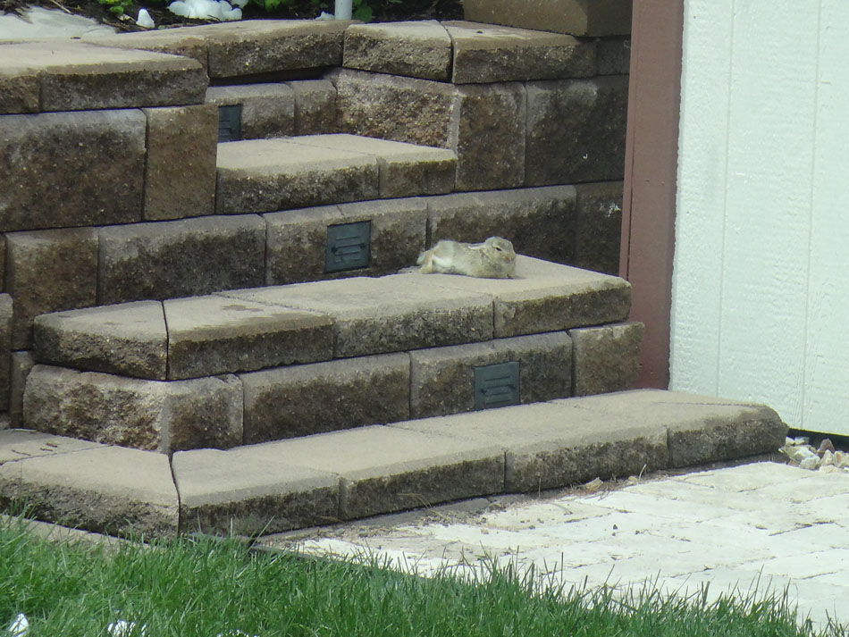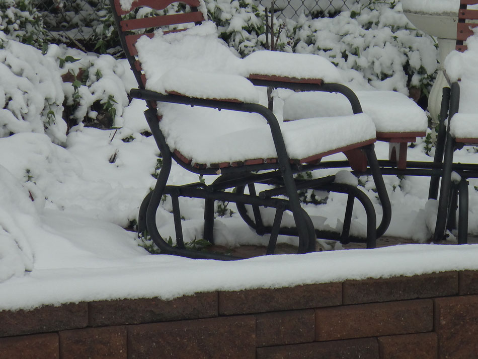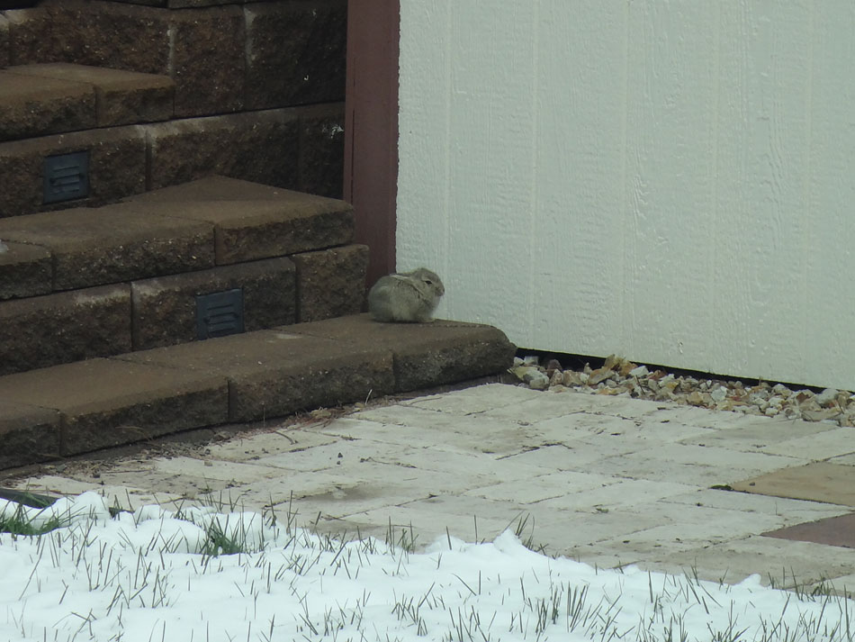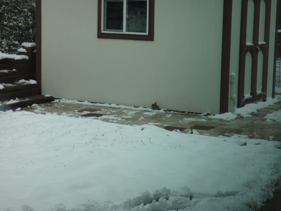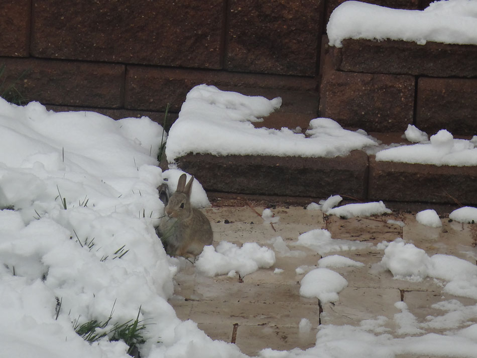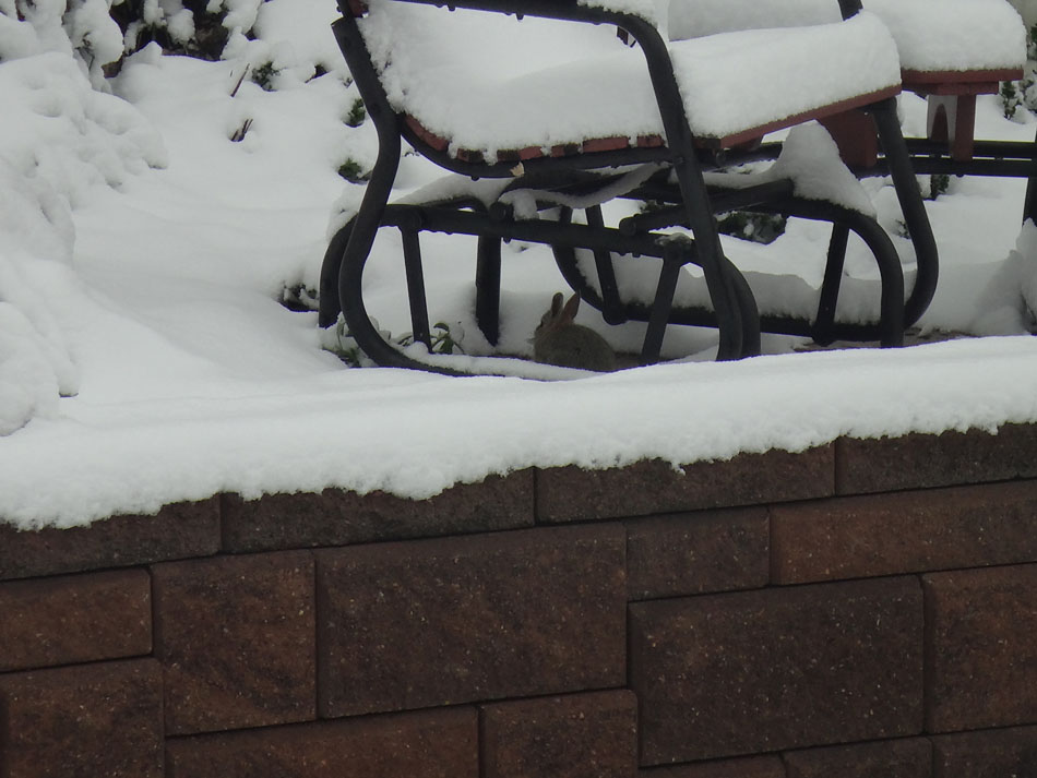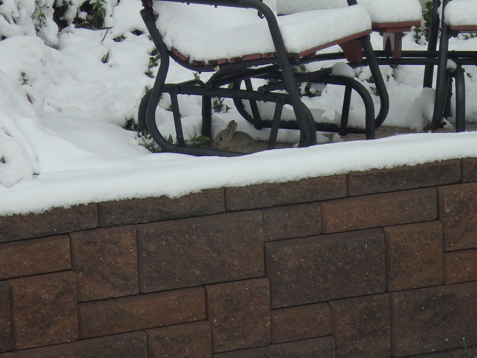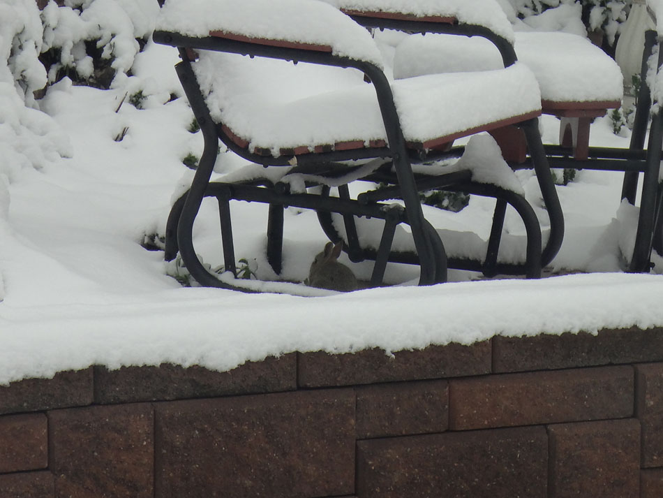 Sunday morning, there was less accumulation than we had expected, but it was enough to drive a baby bunny under the chair for shelter: