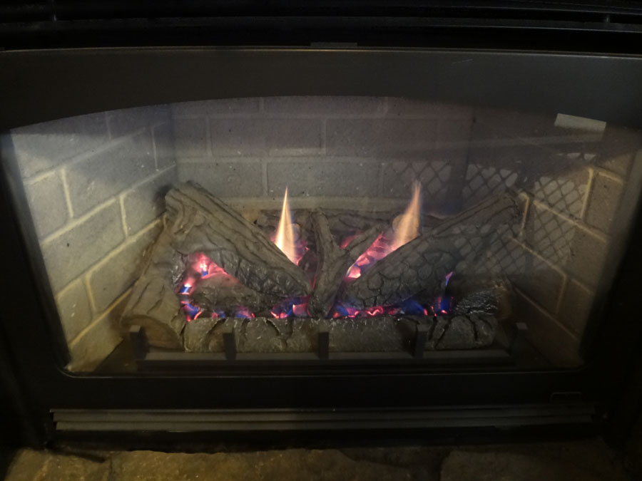 A warm fire in the fireplace: