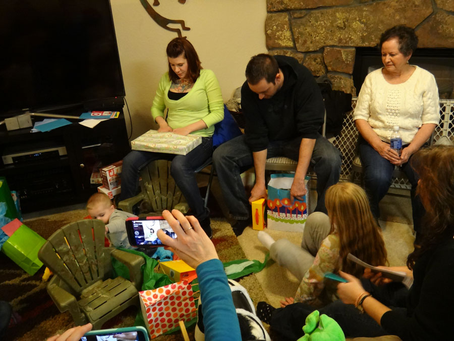 Opening gifts from my parents (Linda and Tony Rawluk):