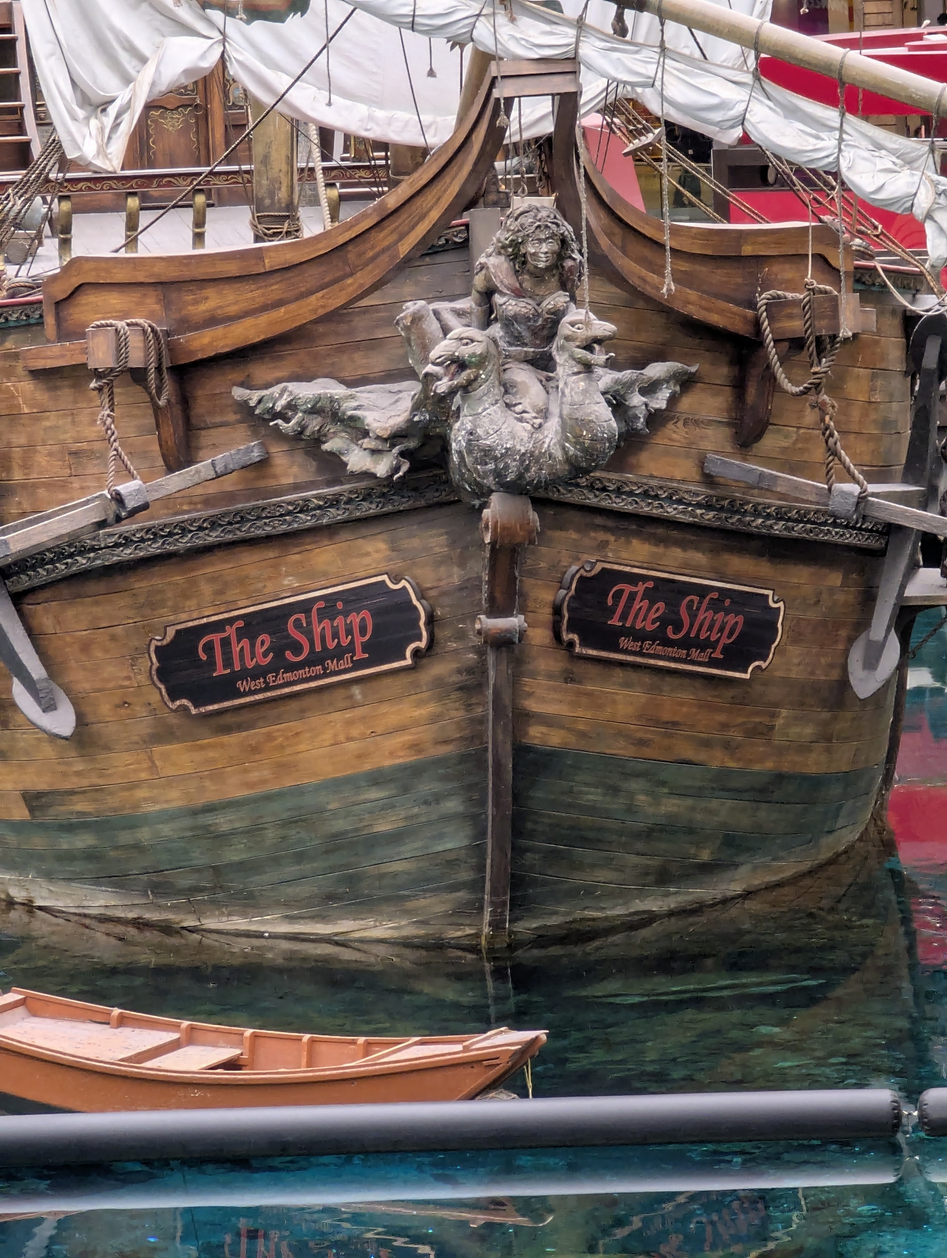 A large lake with full-size ships in the mall: