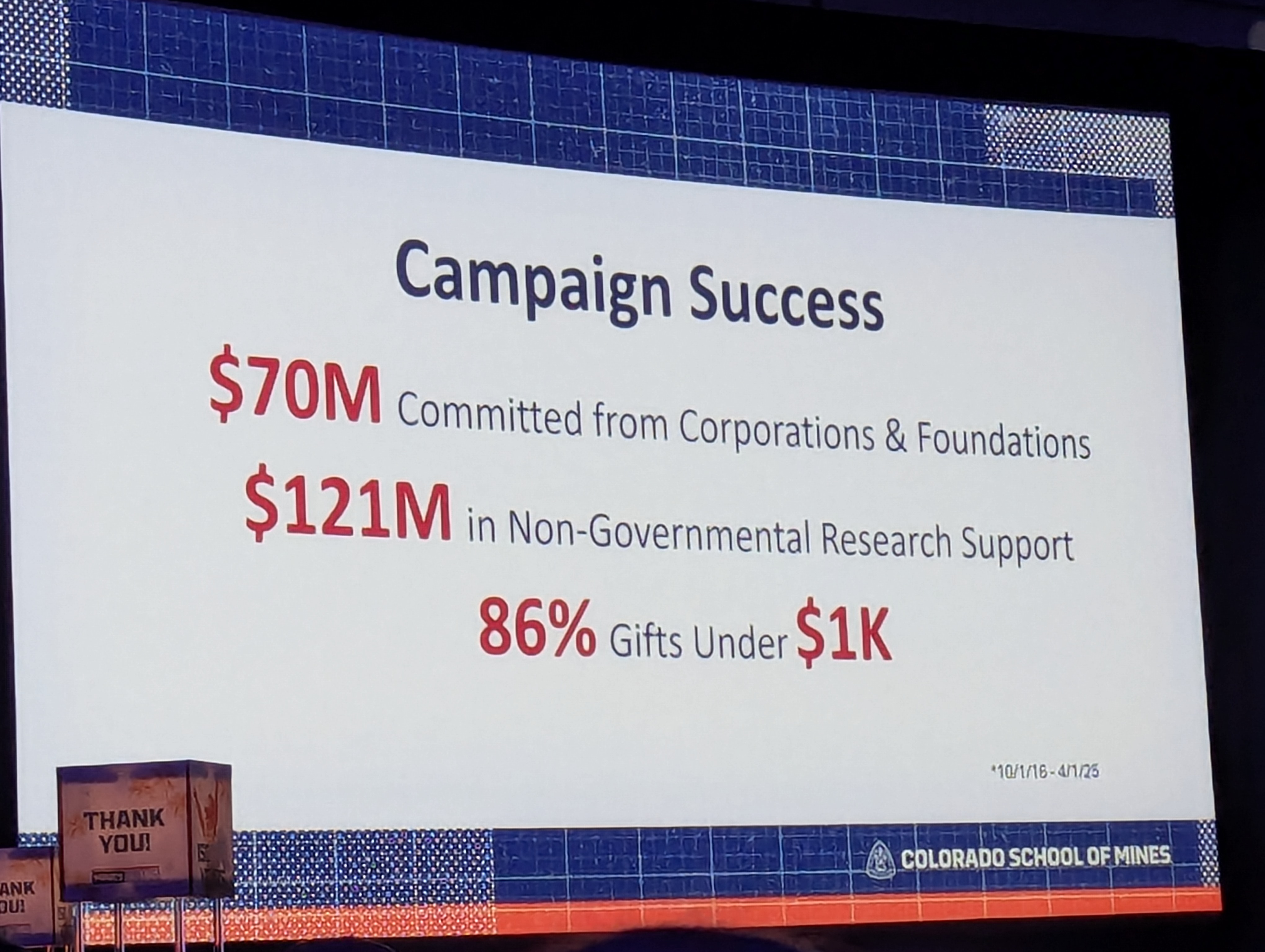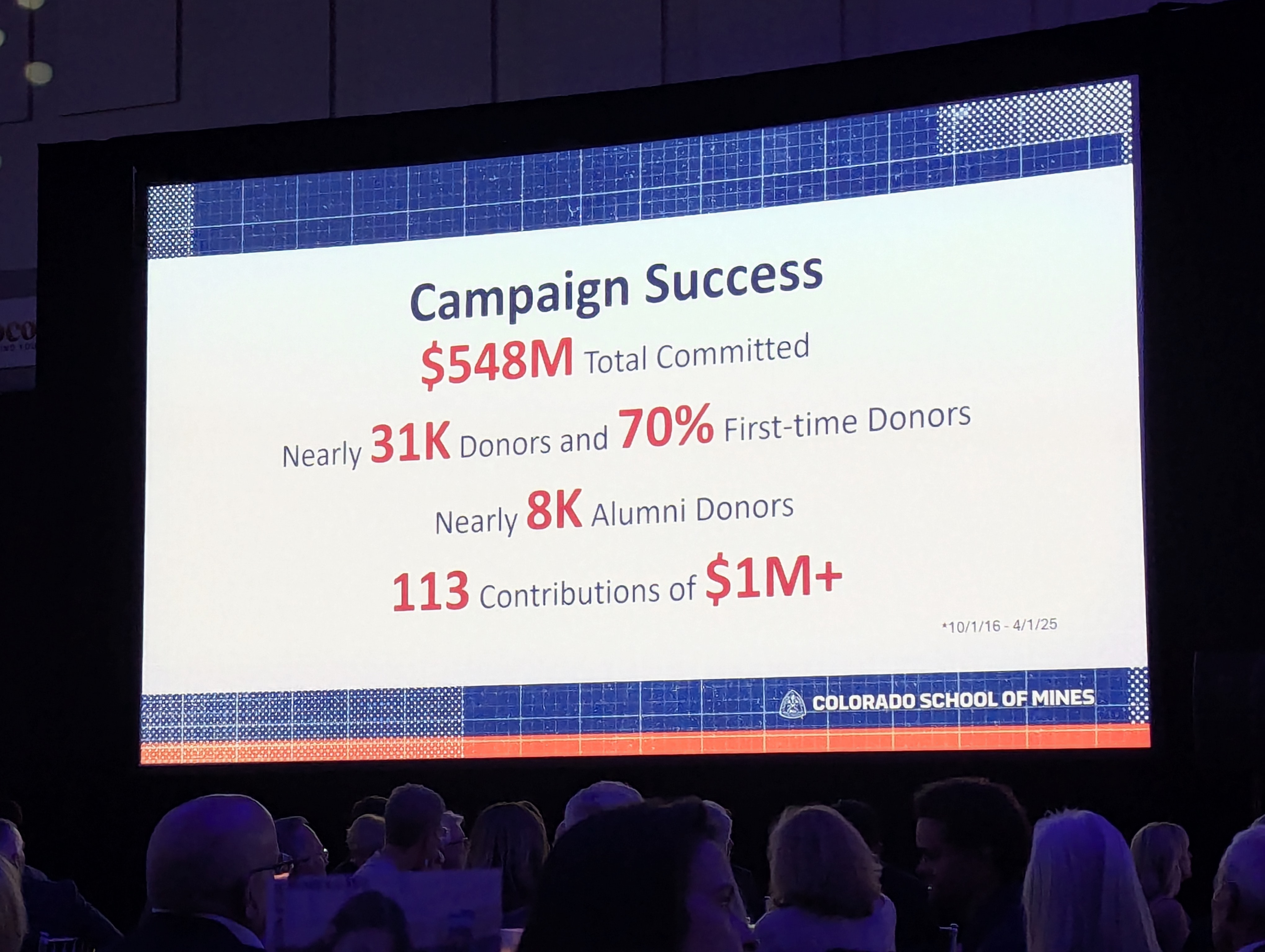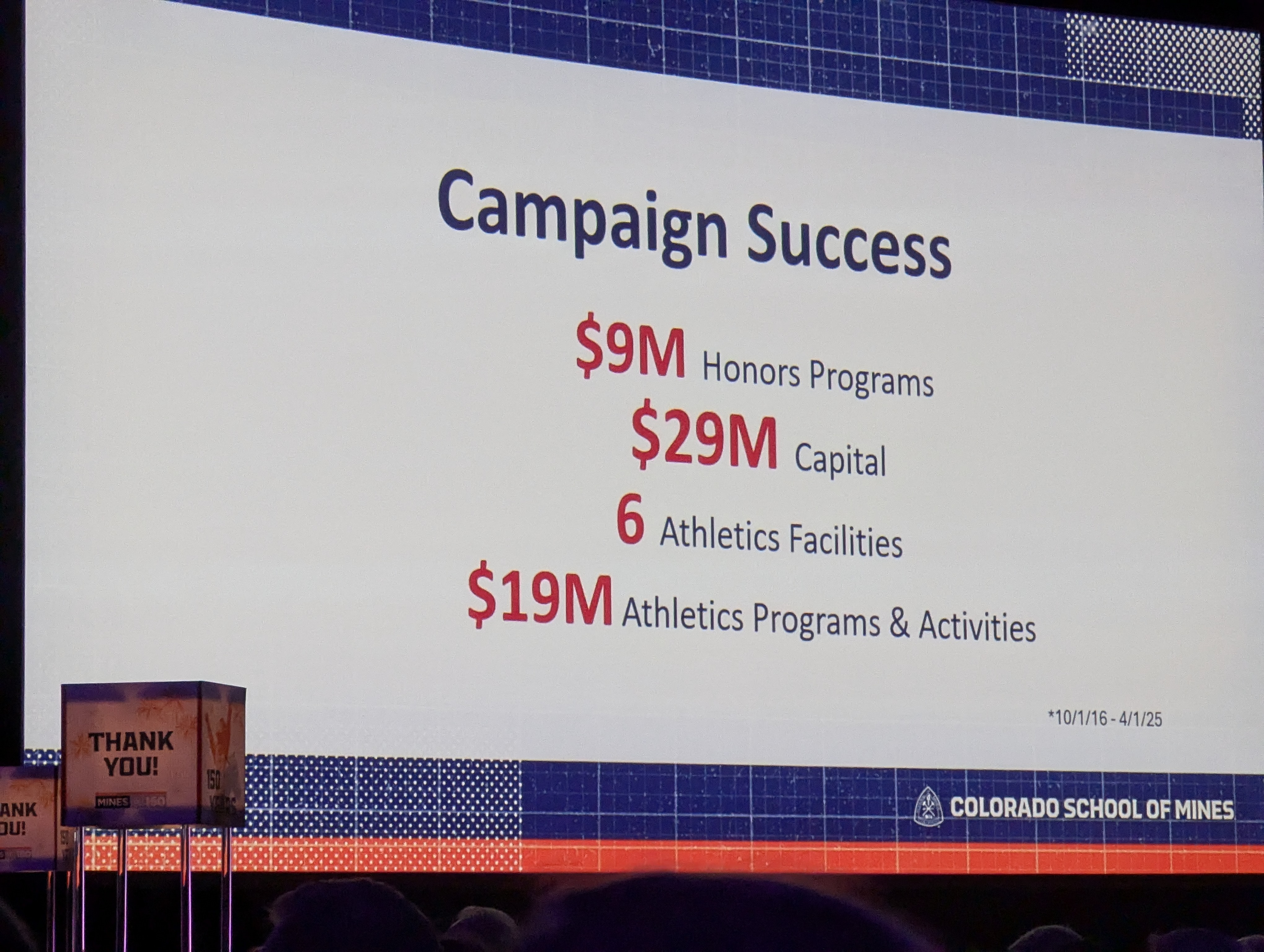 The Colorado School of Mines hosted an evening dinner event to celebrate the success of the fundraising event, "Mines@150", which was started in honor of the school's 150th year of existence. We