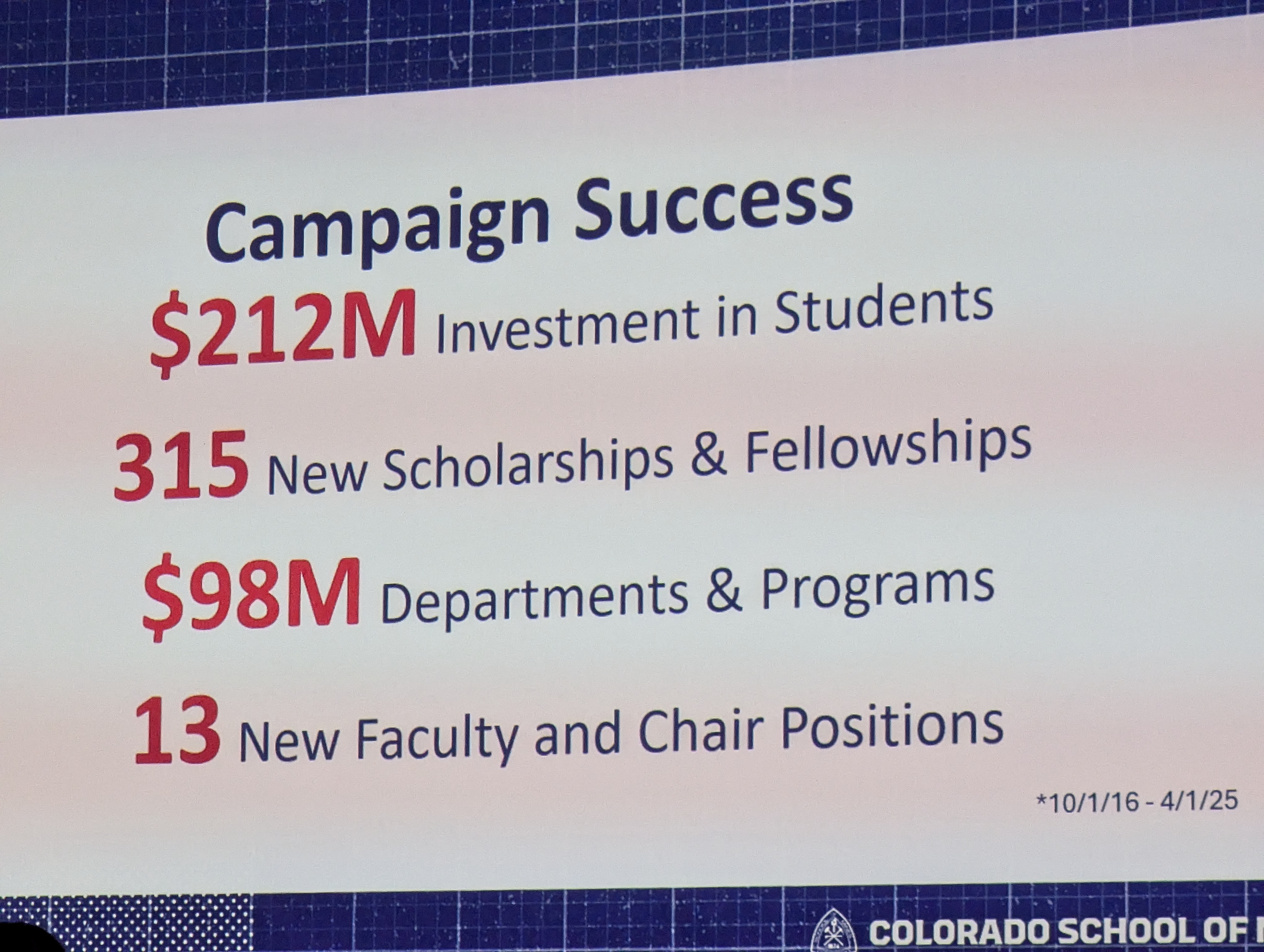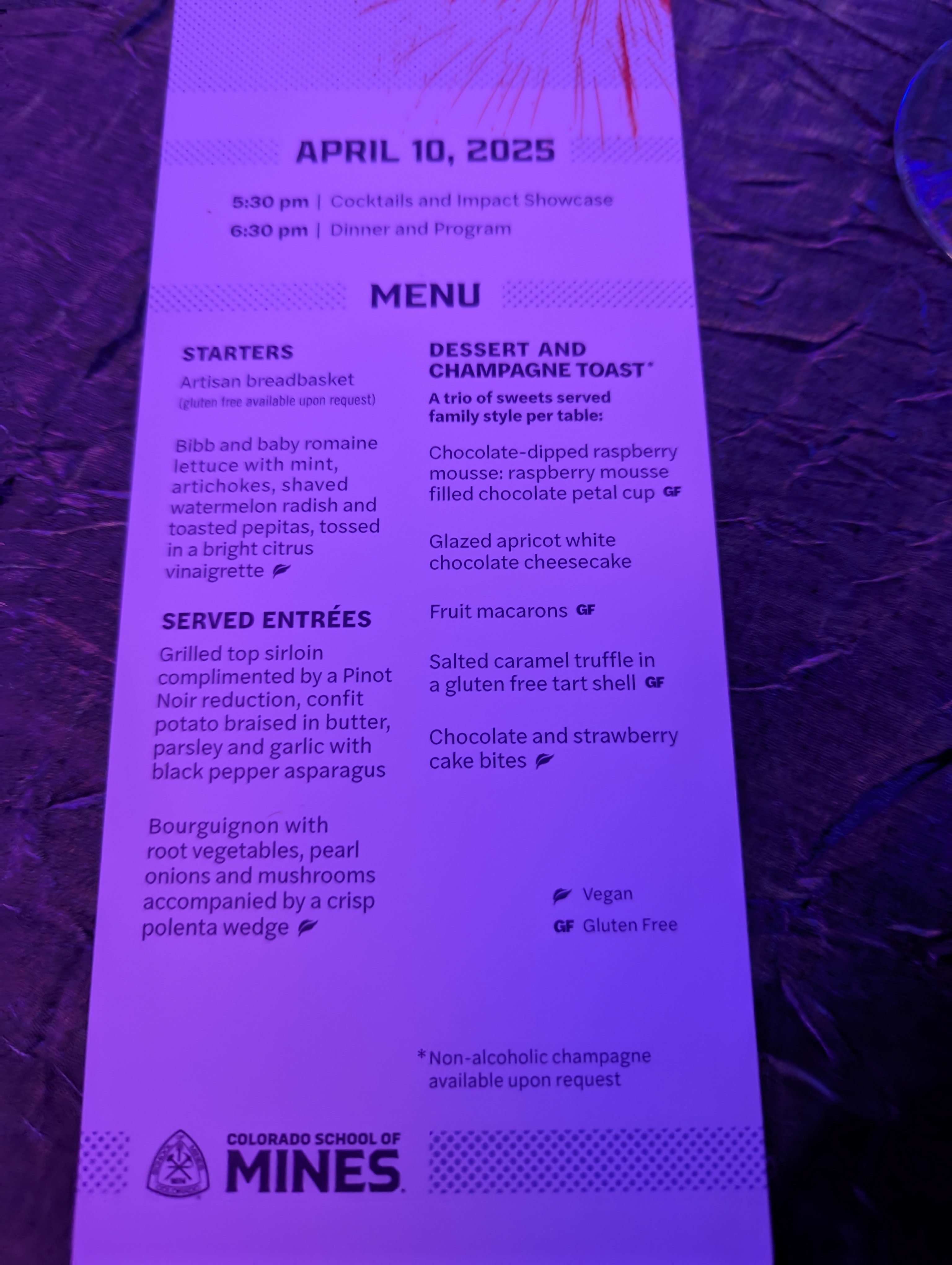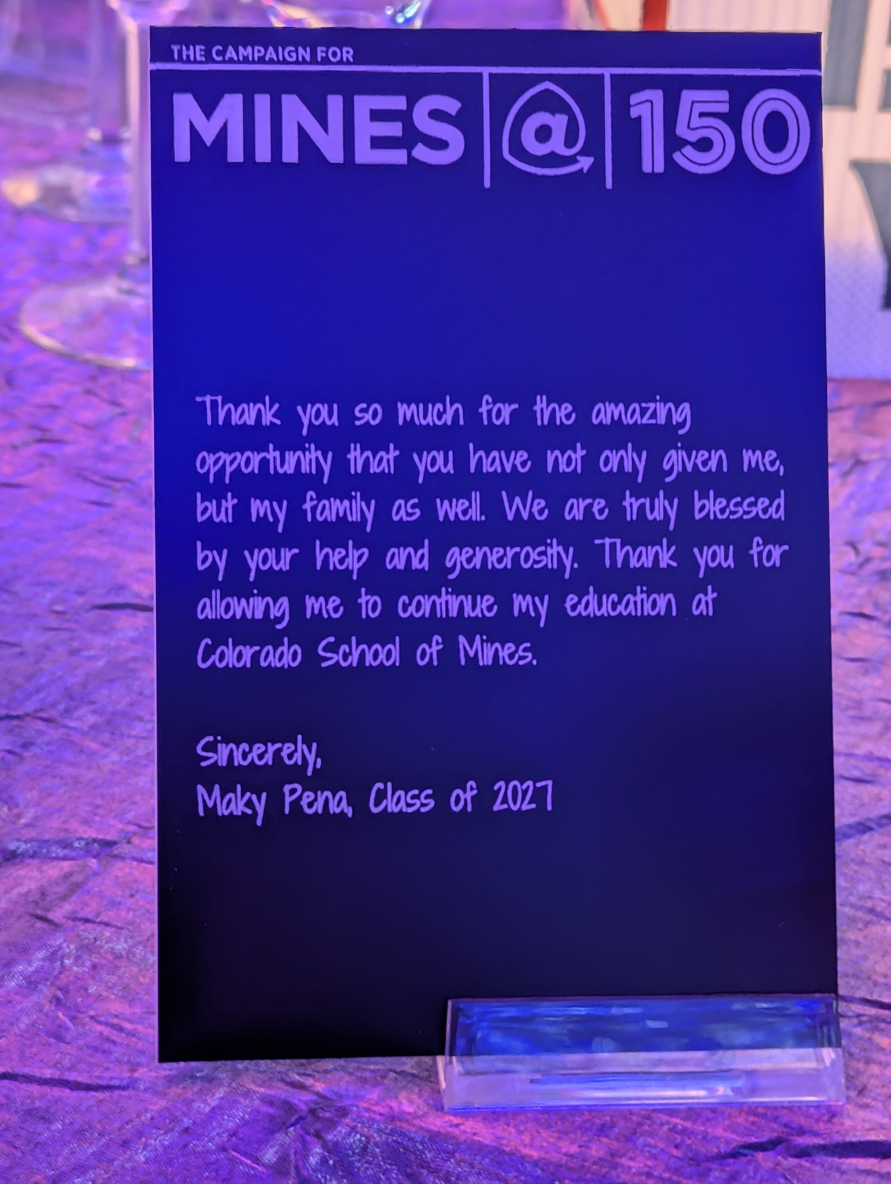 The Colorado School of Mines hosted an evening dinner event to celebrate the success of the fundraising event, "Mines@150", which was started in honor of the school's 150th year of existence. We