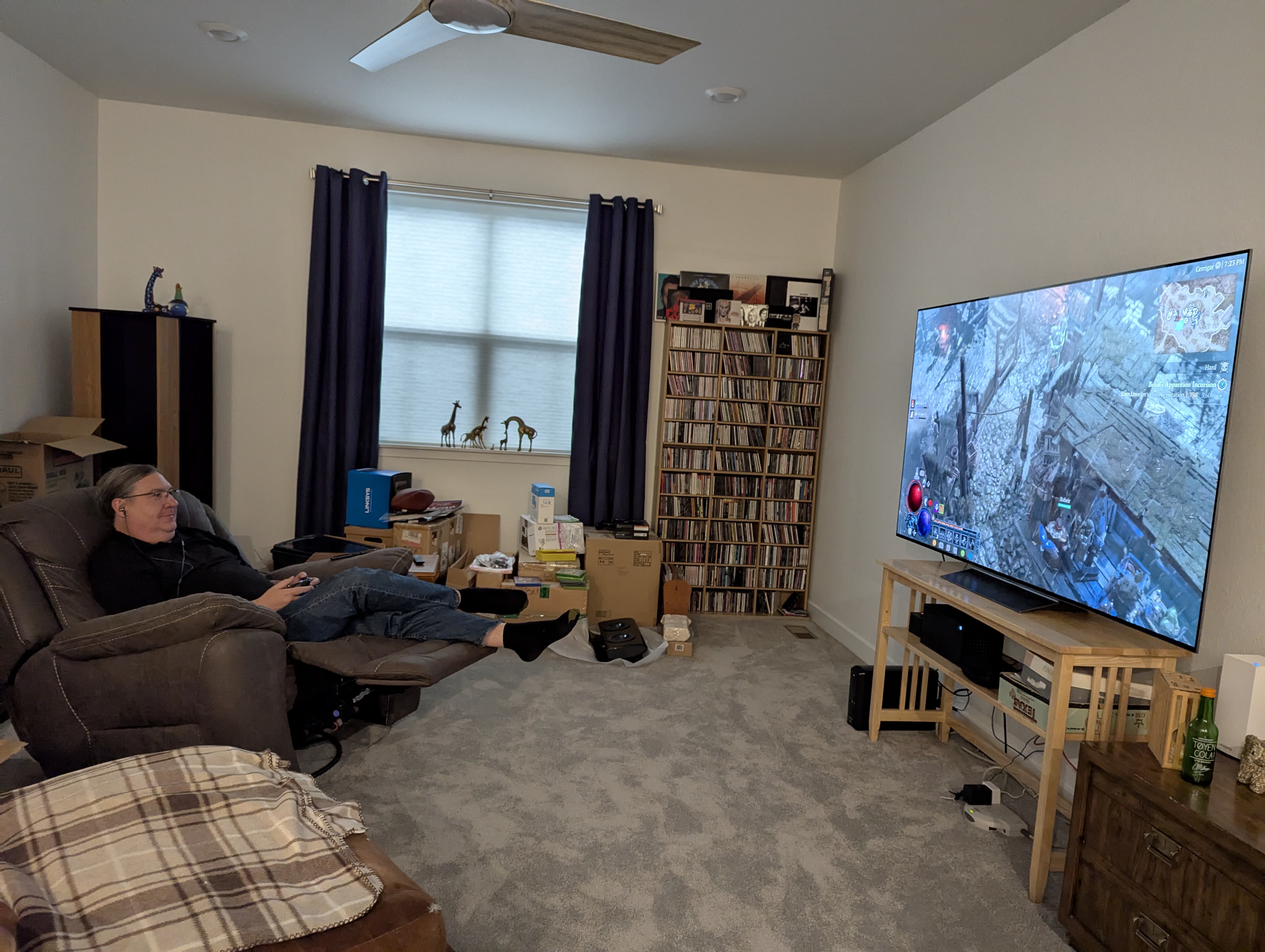 New TV! We got a new TV and moved the other one up to Mike's loft. It's nice for gaming - at closer distance, he can see more details.