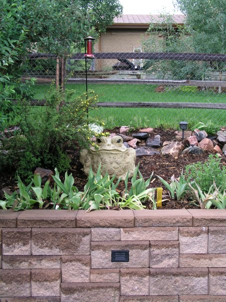 With all of our stormy weather, I had been worried about him blowing away, so Mike constructed a Super Toad anchoring system. And here he is!