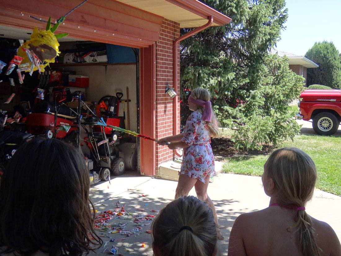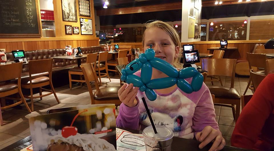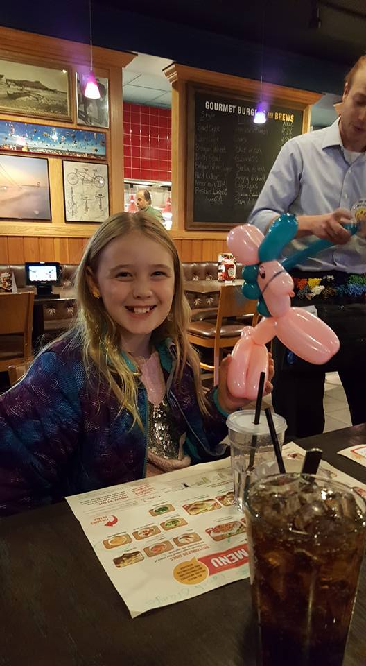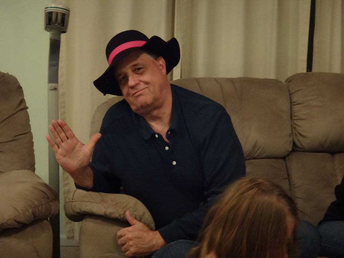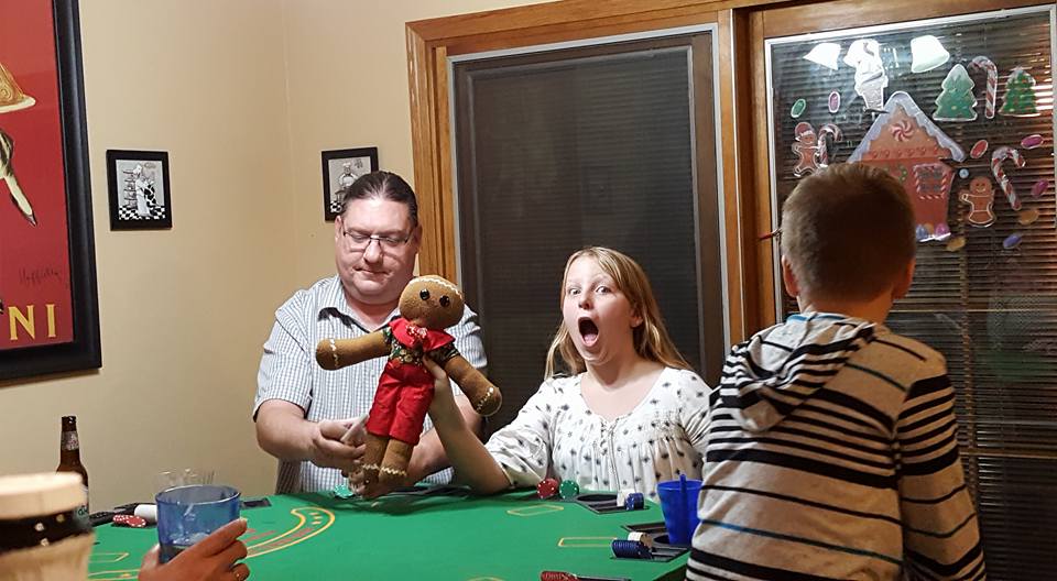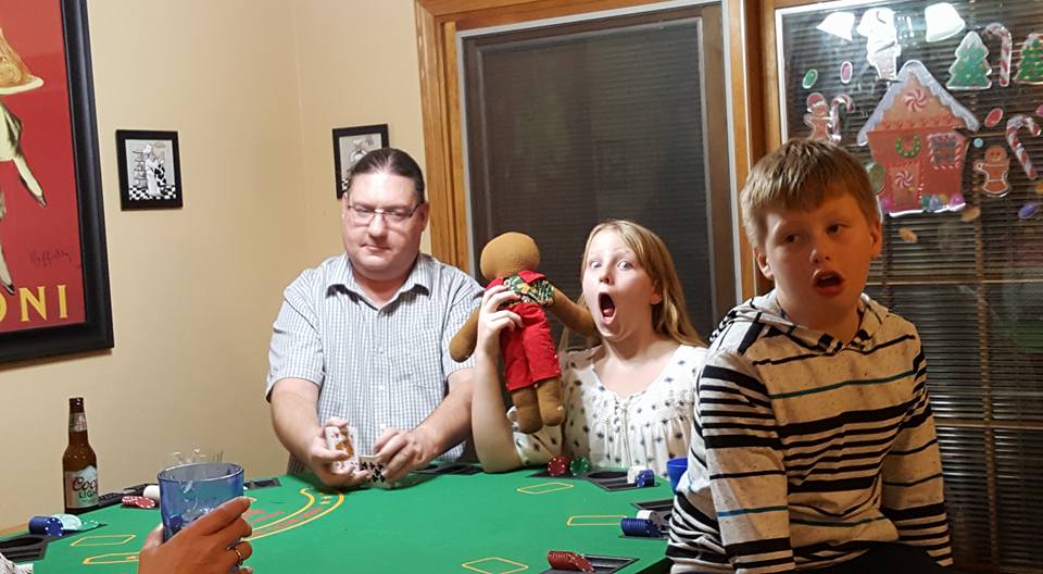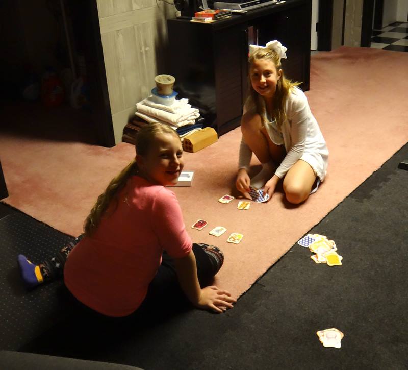 Maddie - being a goofball while Mike shuffles the cards
