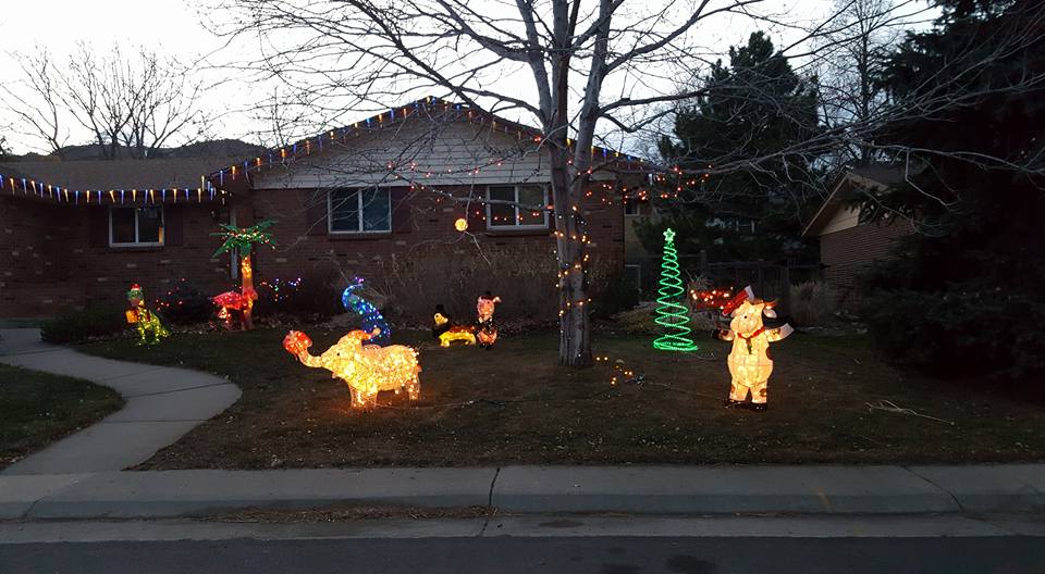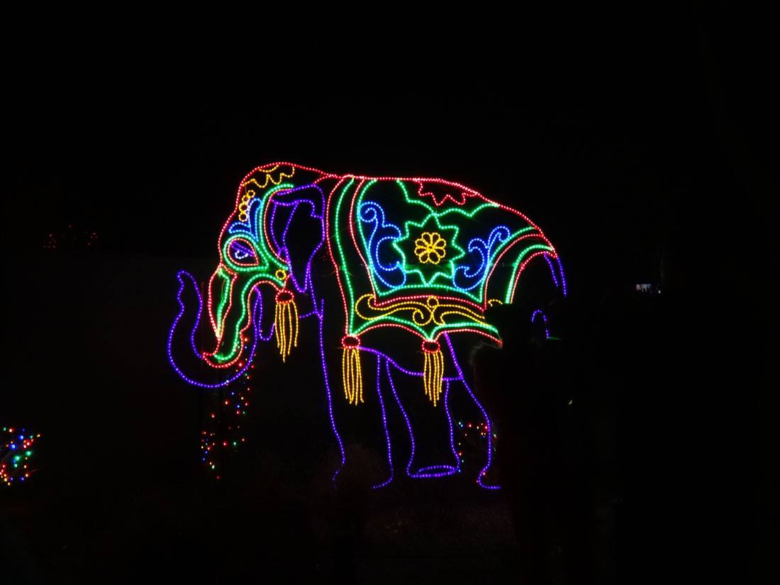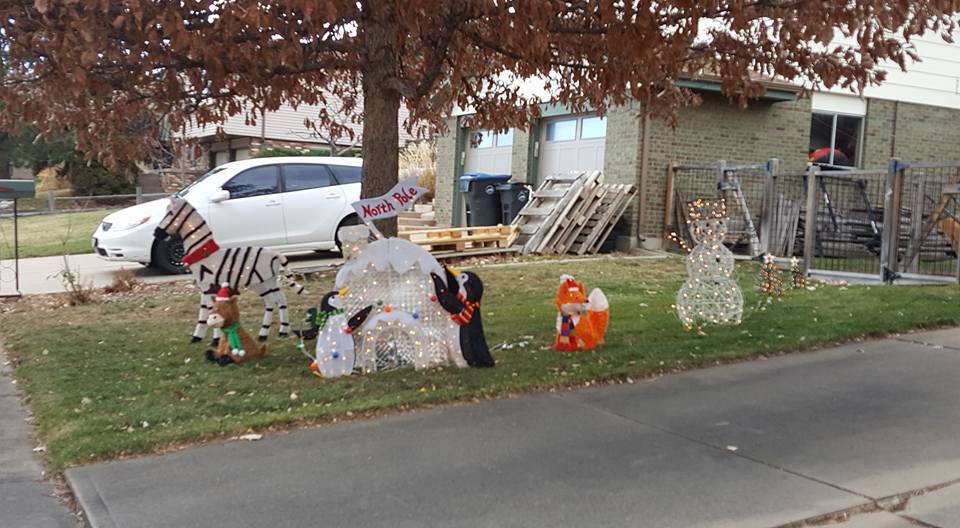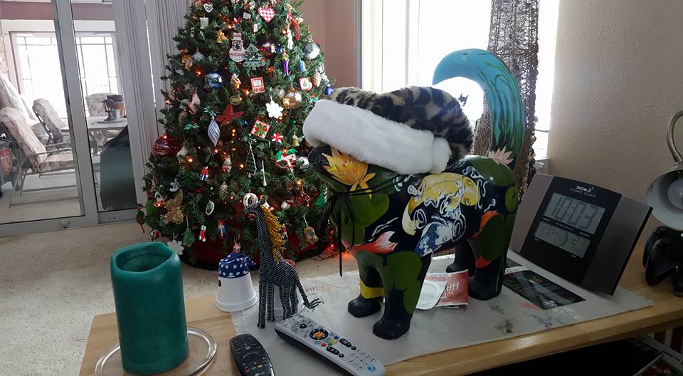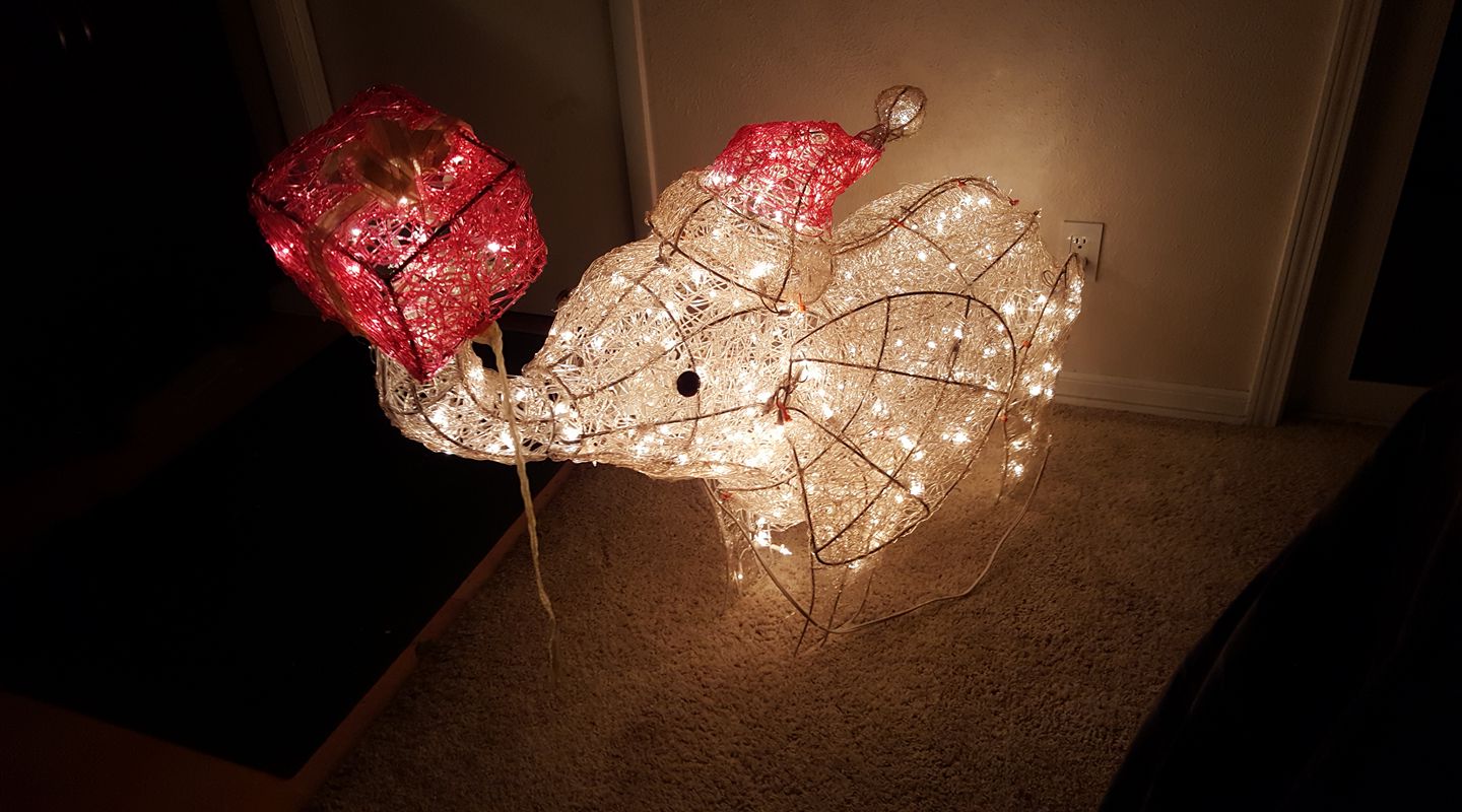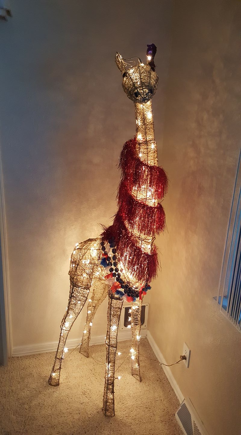 The giraffe is ready for New Year's! and the elephant is inside. The rest of the zoo is in the attic.