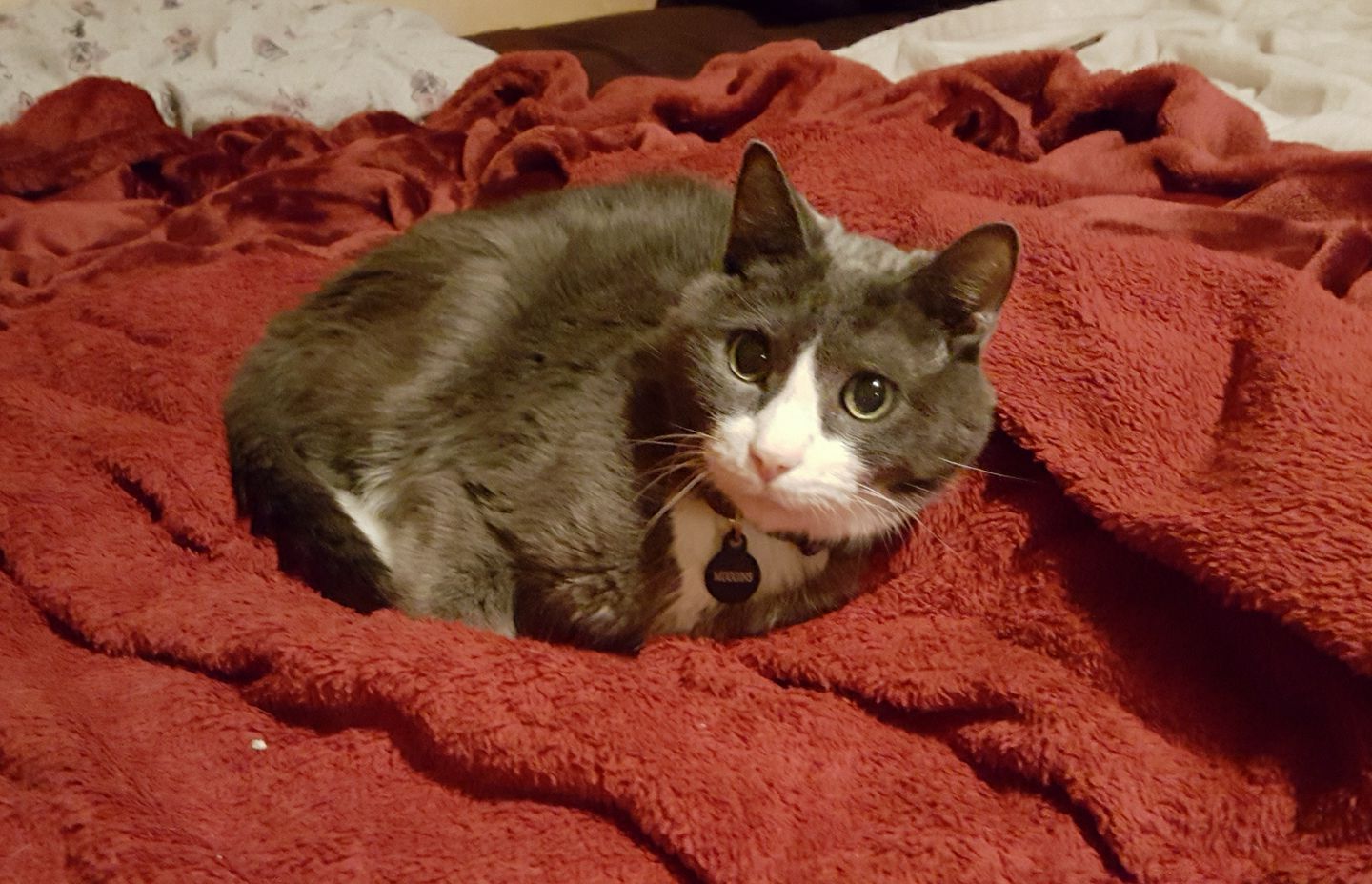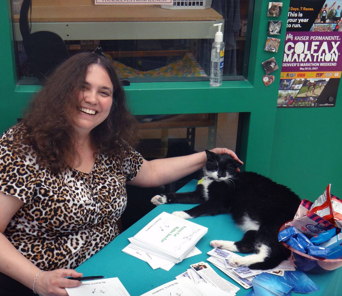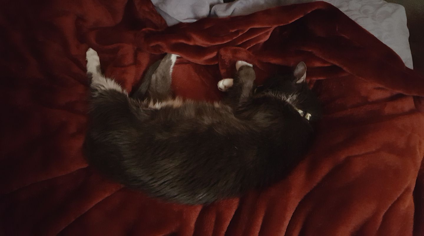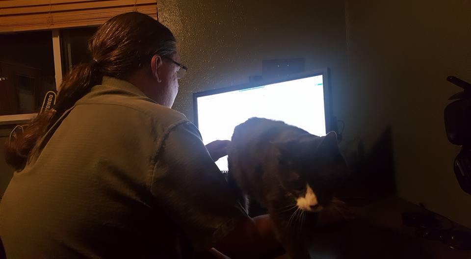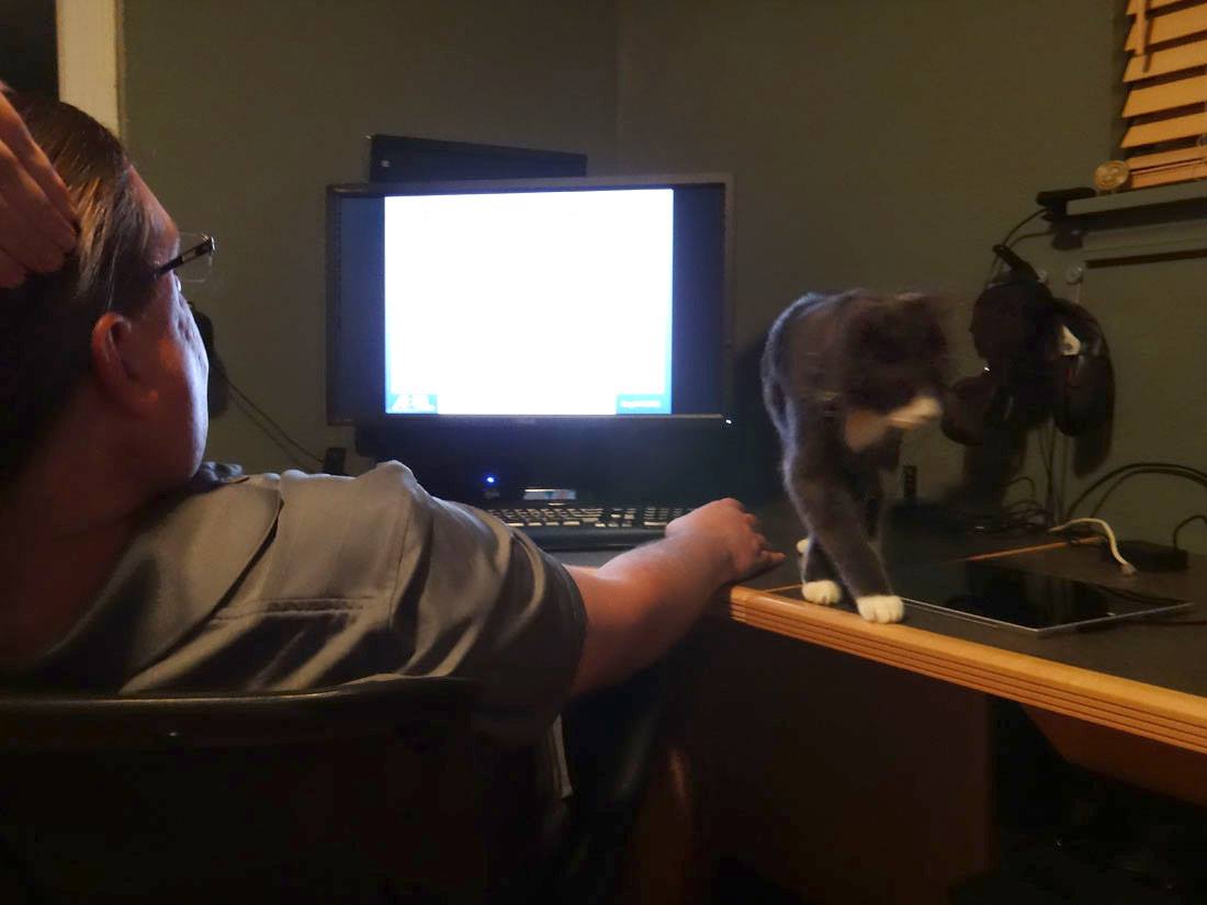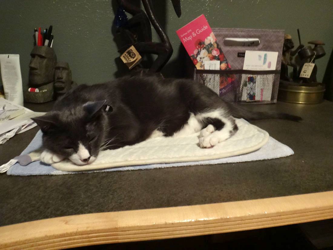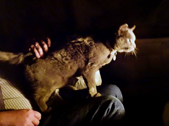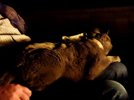It's so cute having a cat who talks. I am working to add book information to my web site, and Mike is watching "The Walking Dead". There was a very loud scene, after which I heard a quite voice in the bedroom - "hello?" "hello?" I turned on the light to find a very wide-eyed Muggins, who just wanted some snuggles.