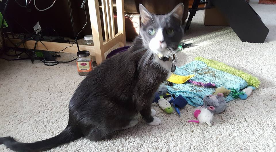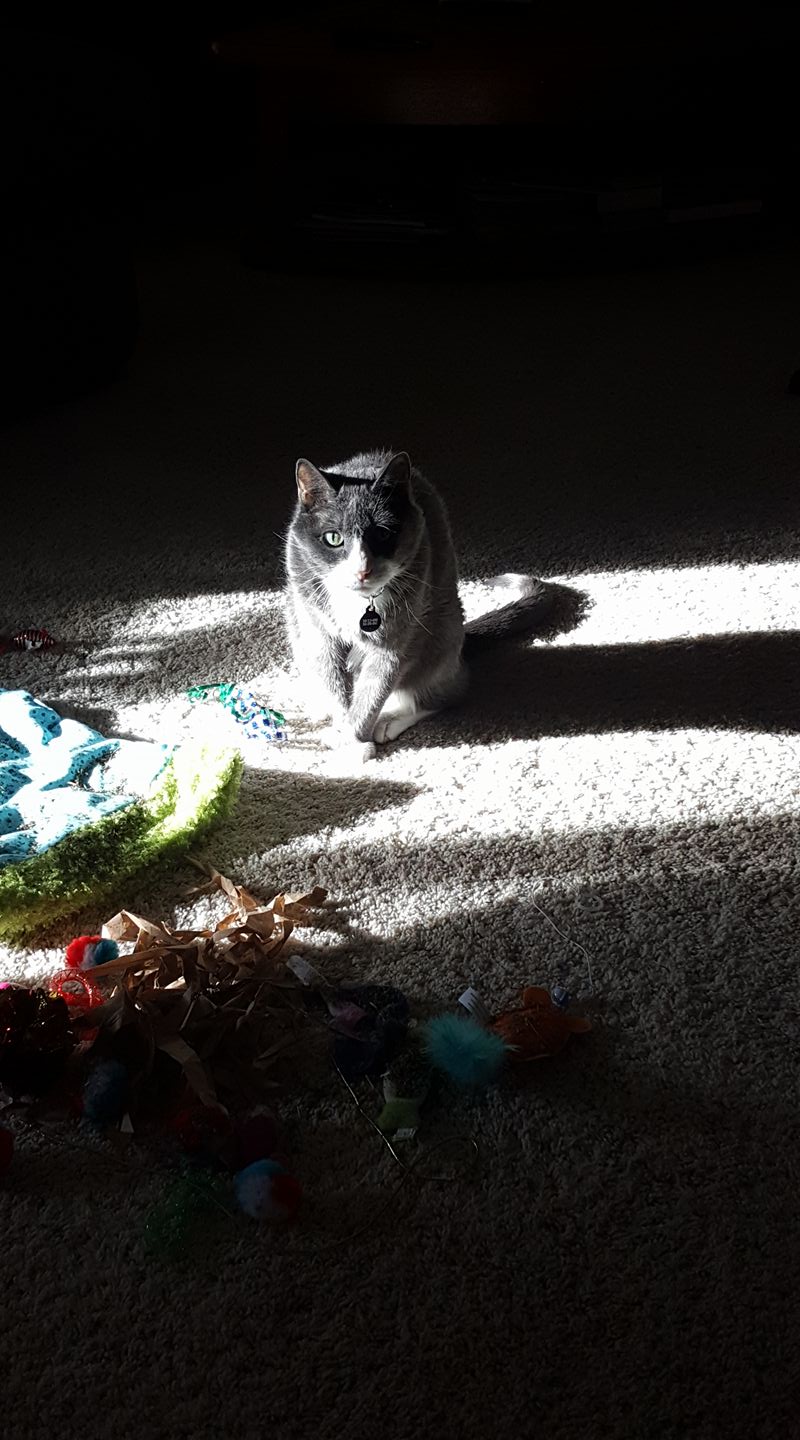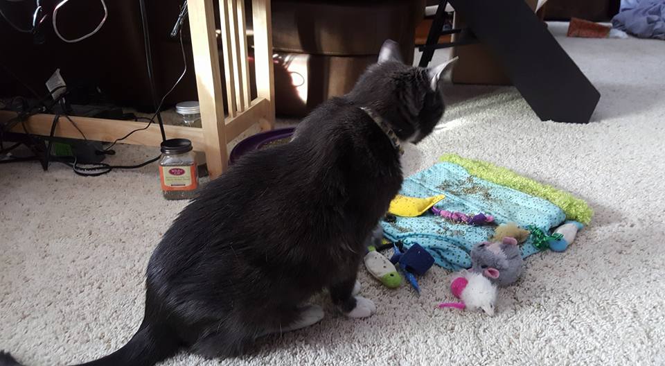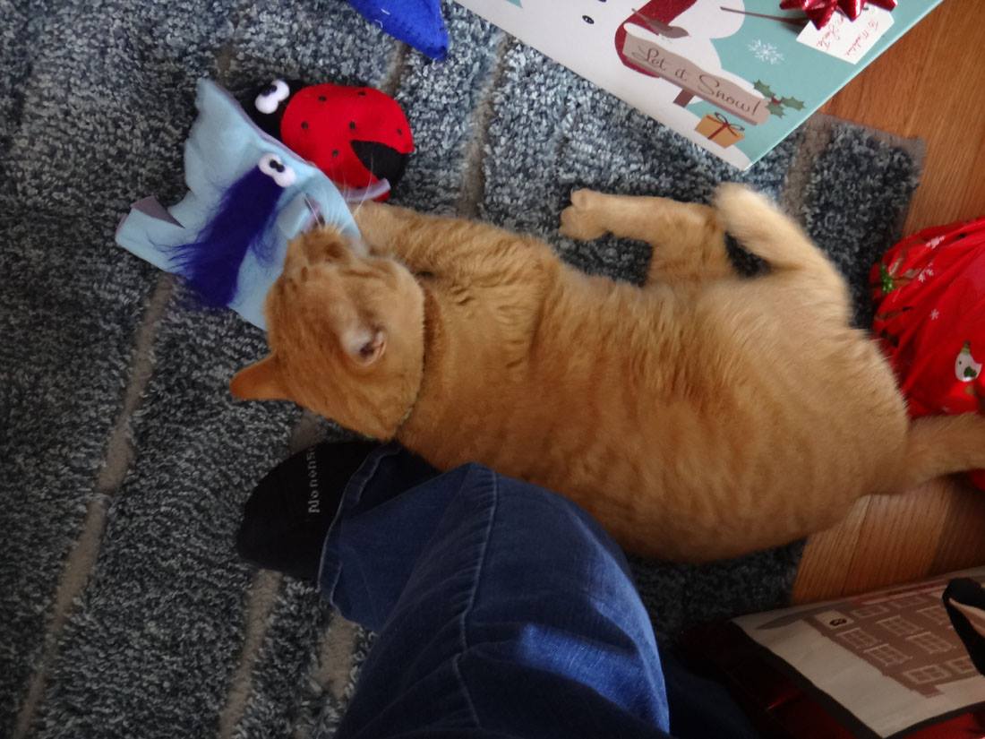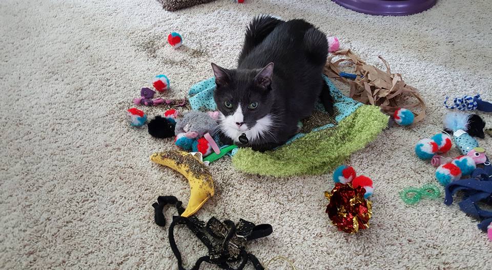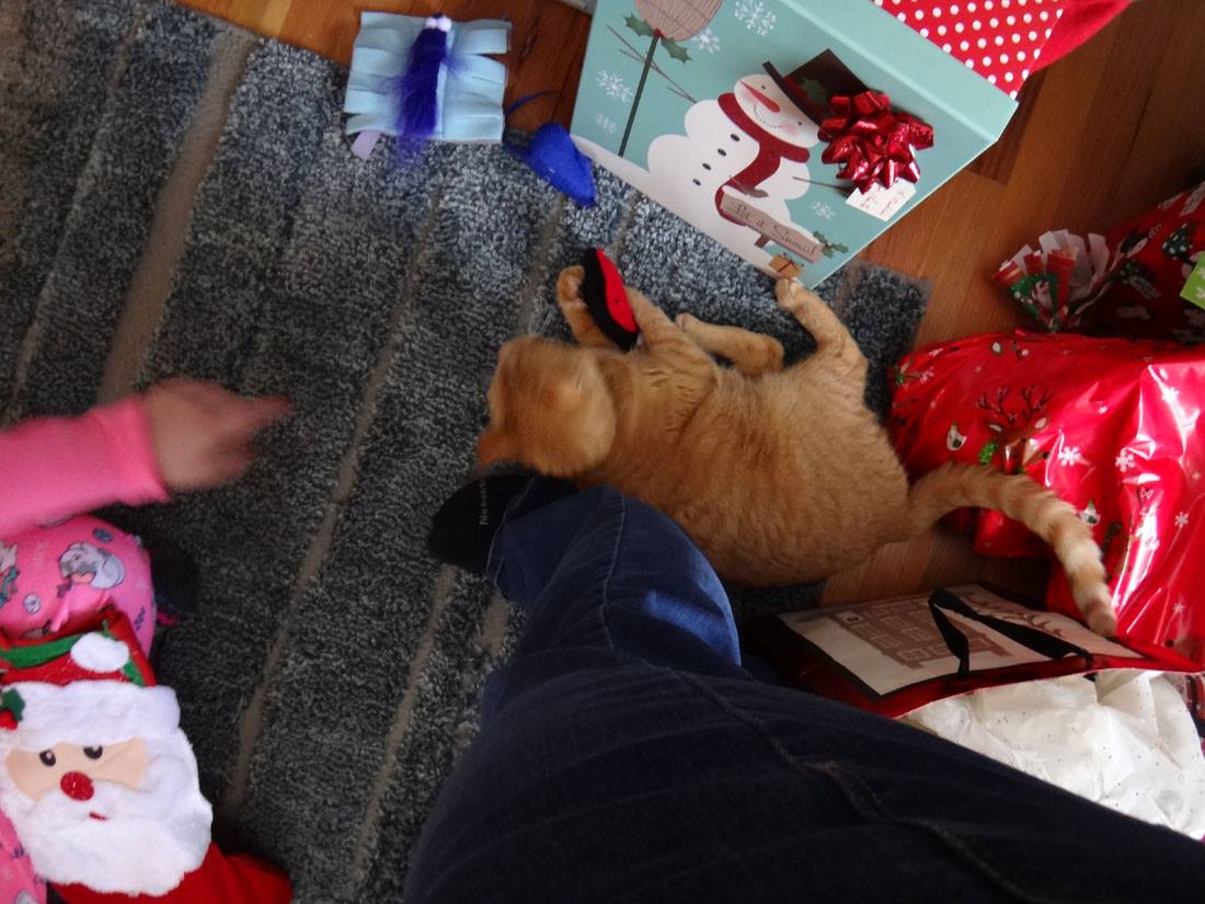 Yesterday morning, she was so happy to get toys from The Cat Care Society's Santa Paws festival as well as to have a dog free area to play. (because they were jumping on people, the dogs found themselves locked in the kitchen)