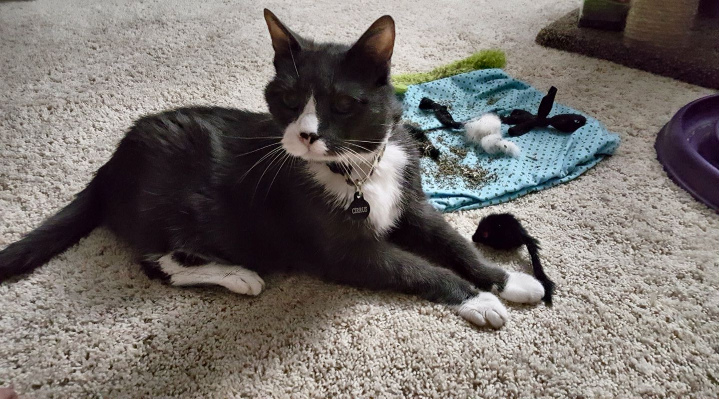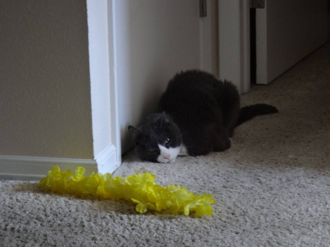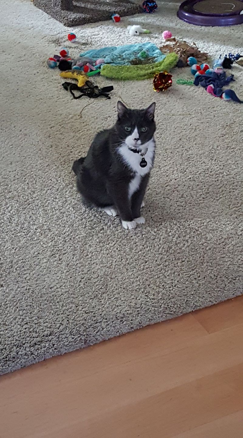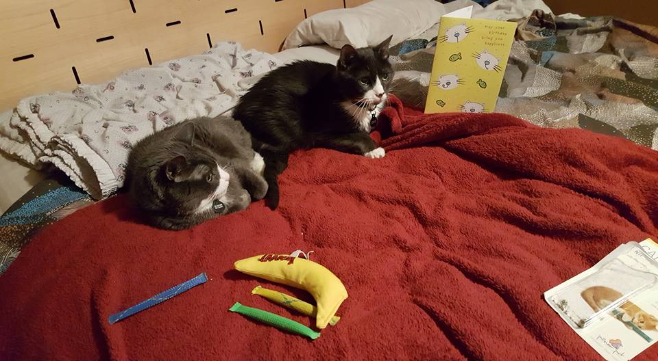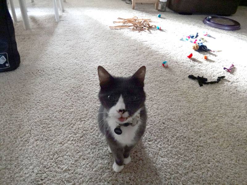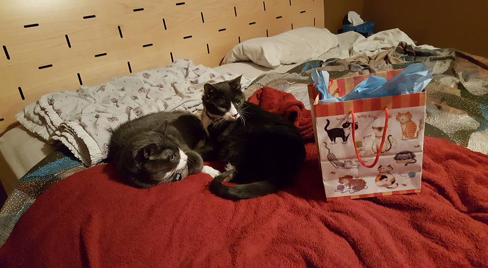 Yesterday morning, she was so happy to get toys from The Cat Care Society's Santa Paws festival as well as to have a dog free area to play. (because they were jumping on people, the dogs found themselves locked in the kitchen)