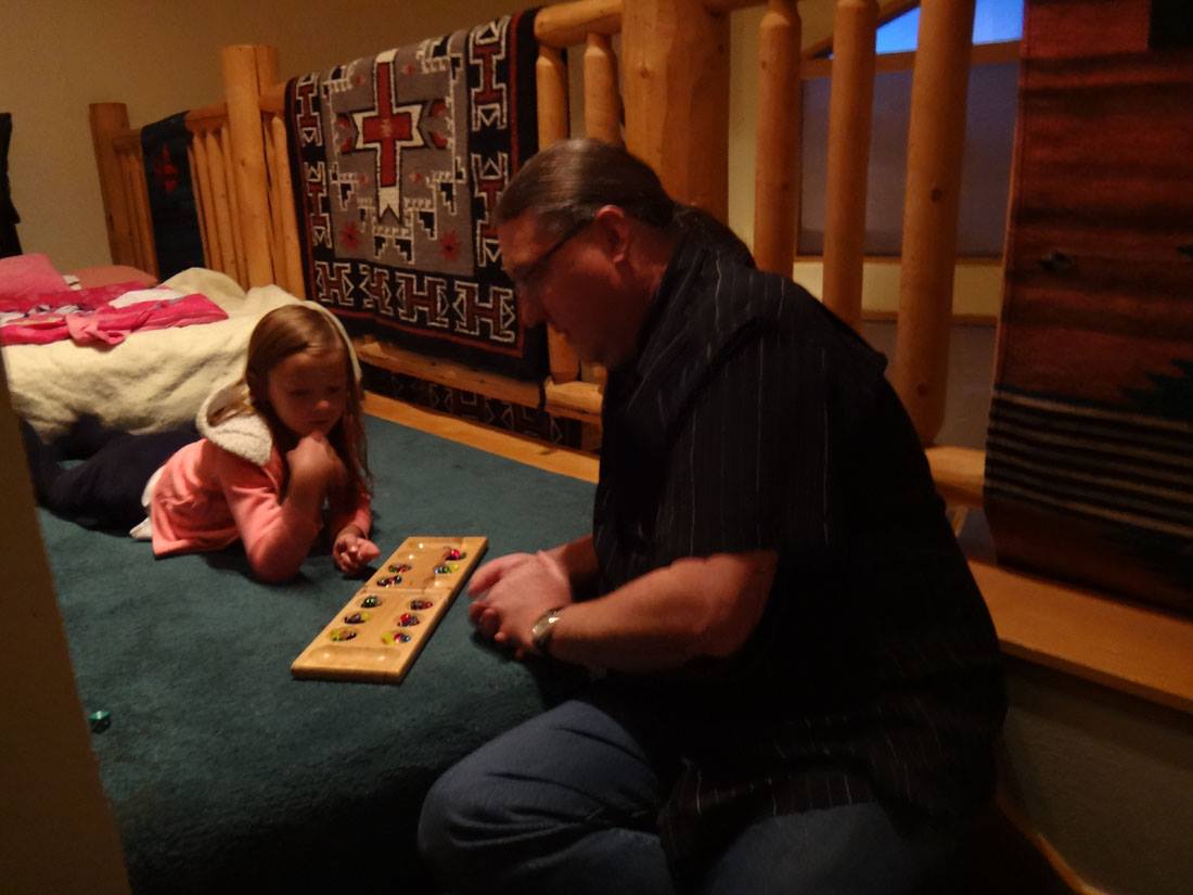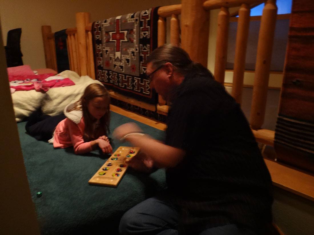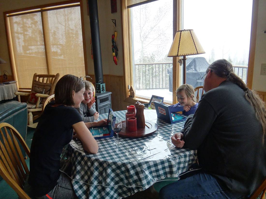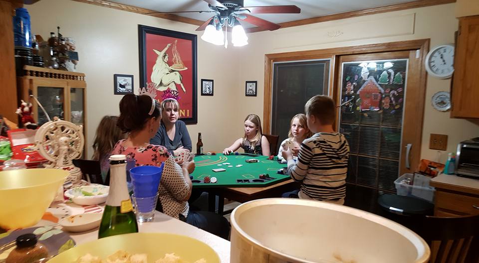 Rannae and Danielle taught the kids a little bit about playing poker. (Hannah is next to Danielle; Valerie, Maddie, and Will are on the other side of the table)