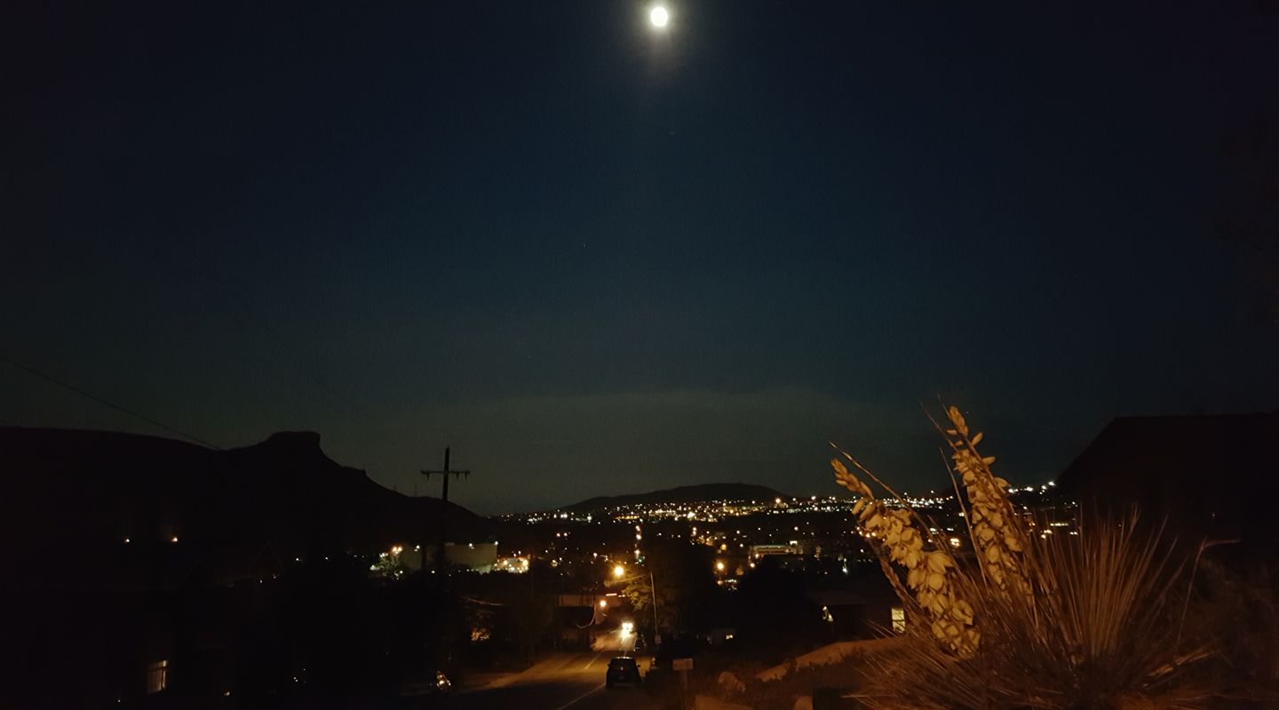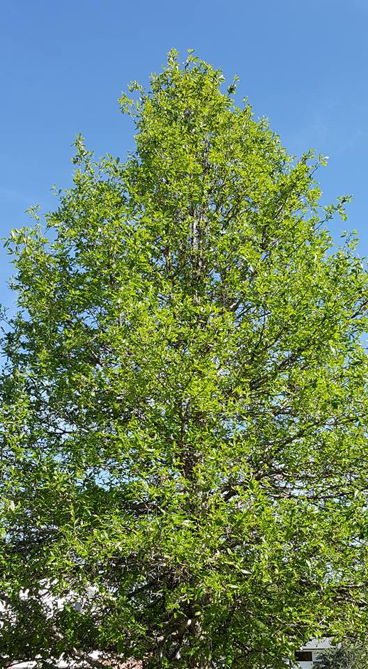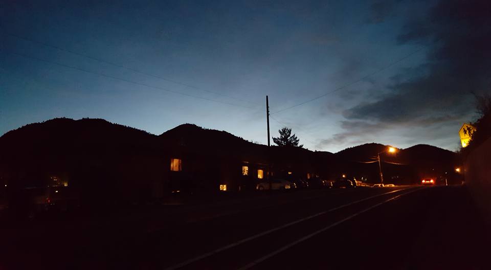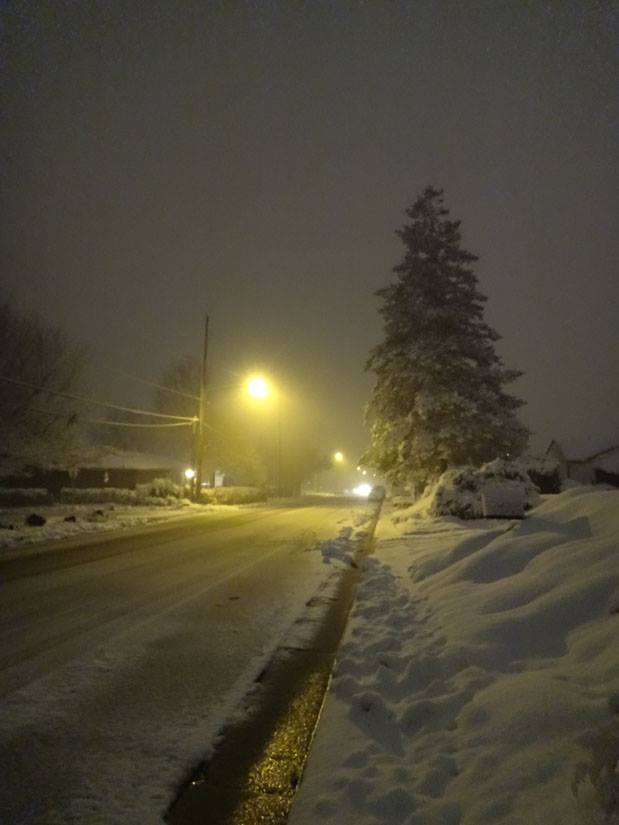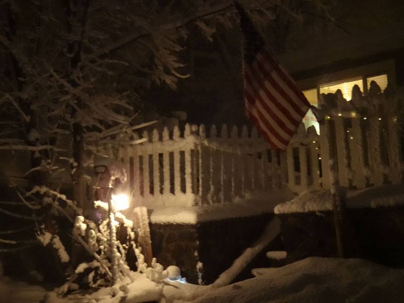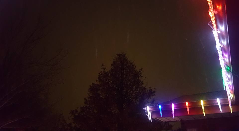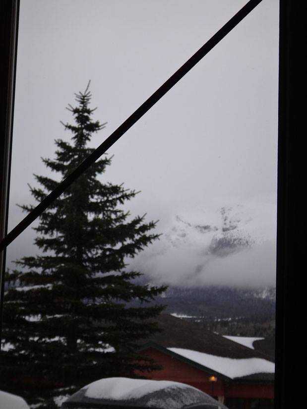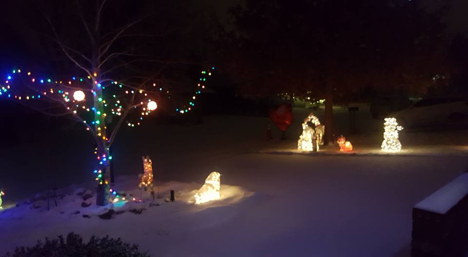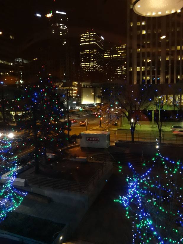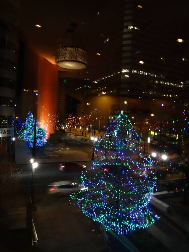 view outside the window - love that the lights are still on the trees