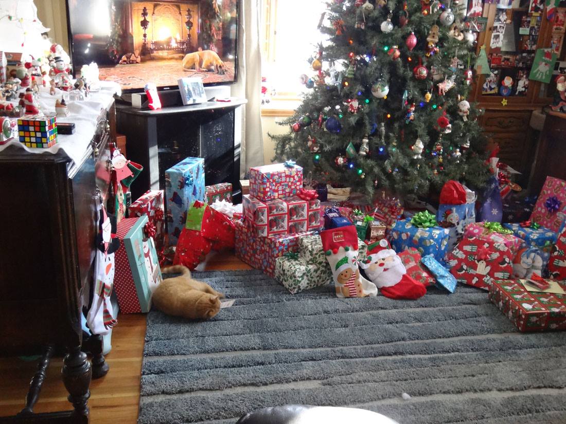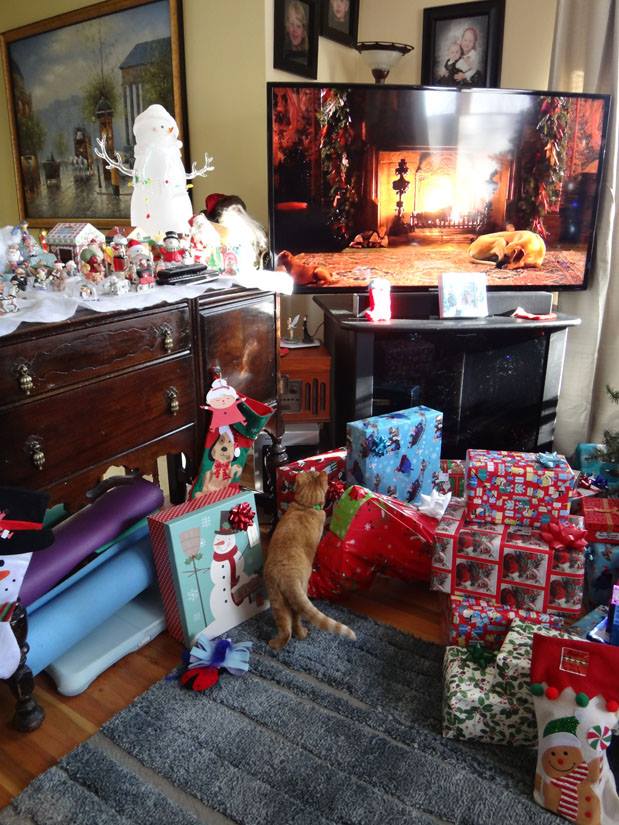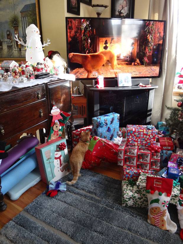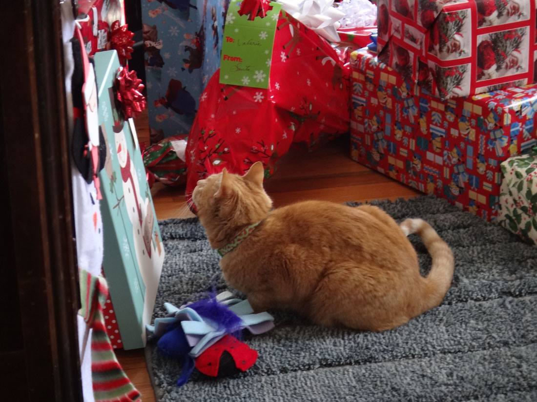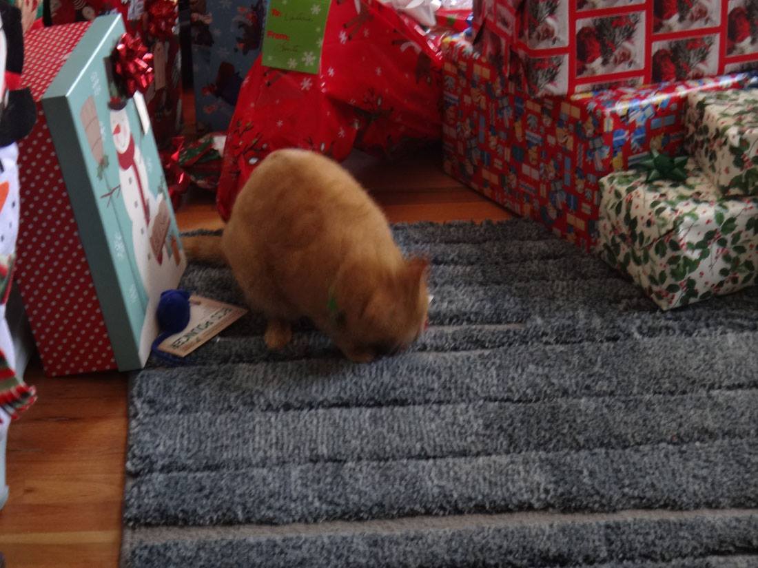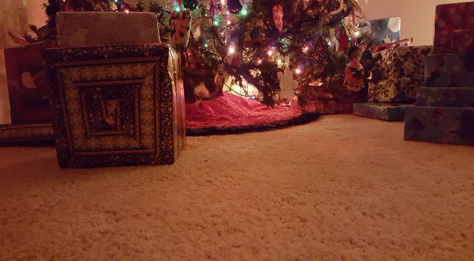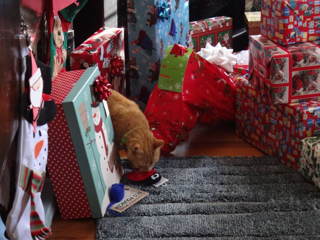 Peaches, looking for a package for herself under the tree