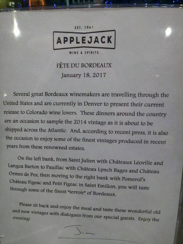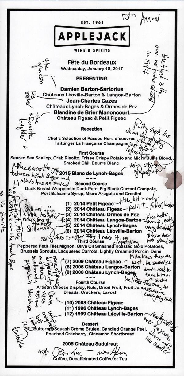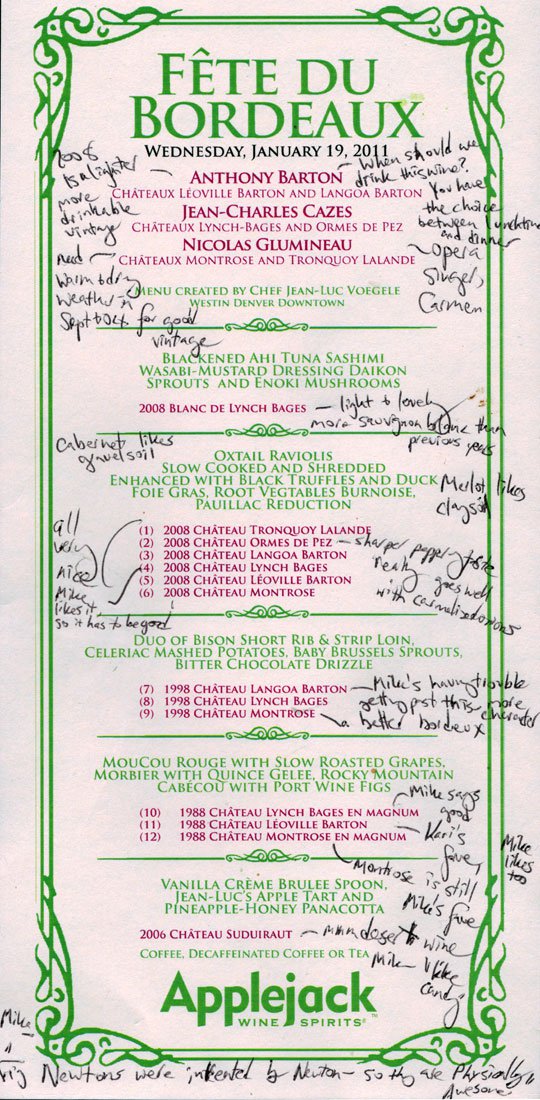menu from Wednesday's Fete du Bordeaux dinner... lots of notes. It was an odd year. It was the first year without our fabulous chef, Jean-Luc. His replacement, Adam, did quite well (especially on the appetizers!)... but we could tell something was different. It was also the first year where Lynch-Bages was not always tops on Mike's list - there are notes on that.