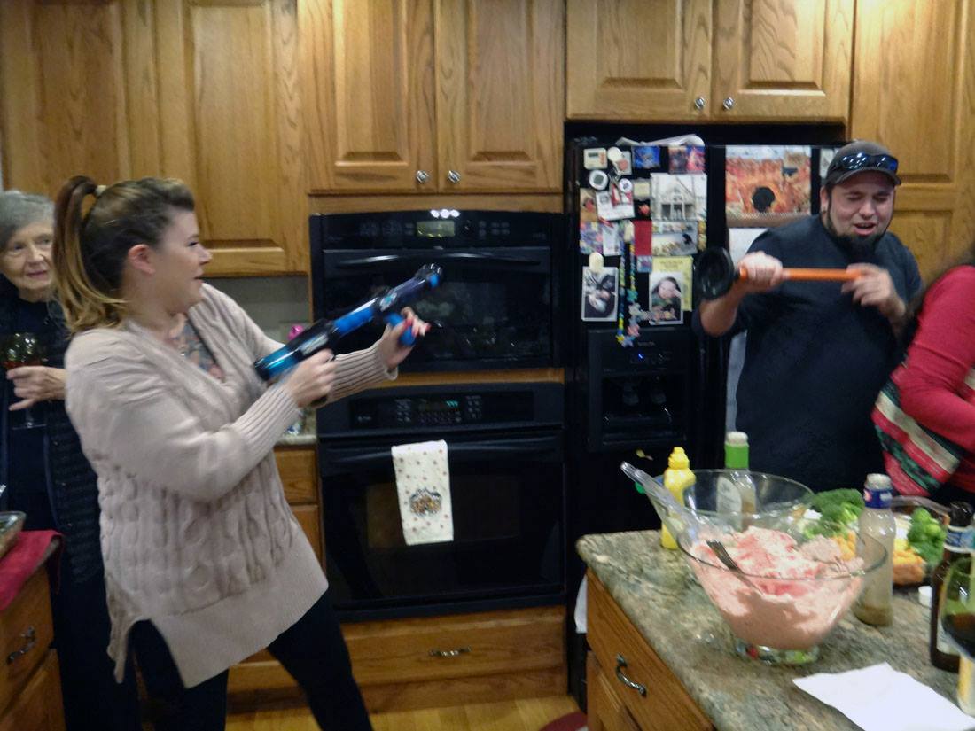 onlookers are relieved to see the plunger/nerf gun war move into the living room