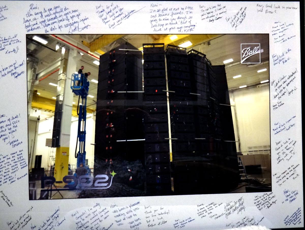 what a week! Fete du Bordeaux, contract negotiations, my going away party from Ball, and I got my going-away picture! too cool! This is the speaker stack for acoustic testing of my spacecraft...the people are on the crane to the left. :) good times... I've been in a melancholy mood all day after learning the bad spot my peeps are in after I left the company - not that I could have done anything to help, but it's just hard to think about in contrast to how well things are going in my new job. But looking at the speaker stack does bring back many happier memories. :)