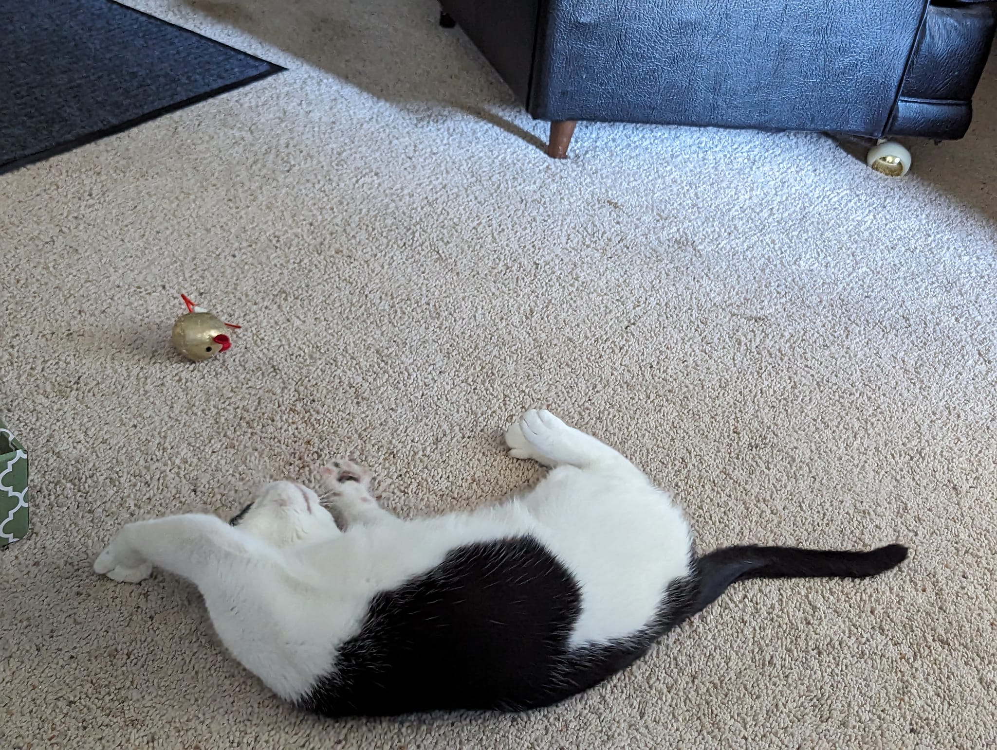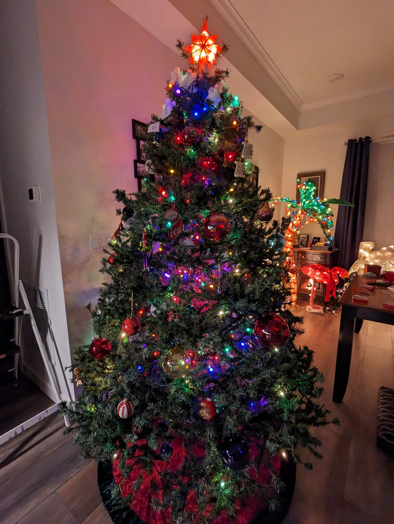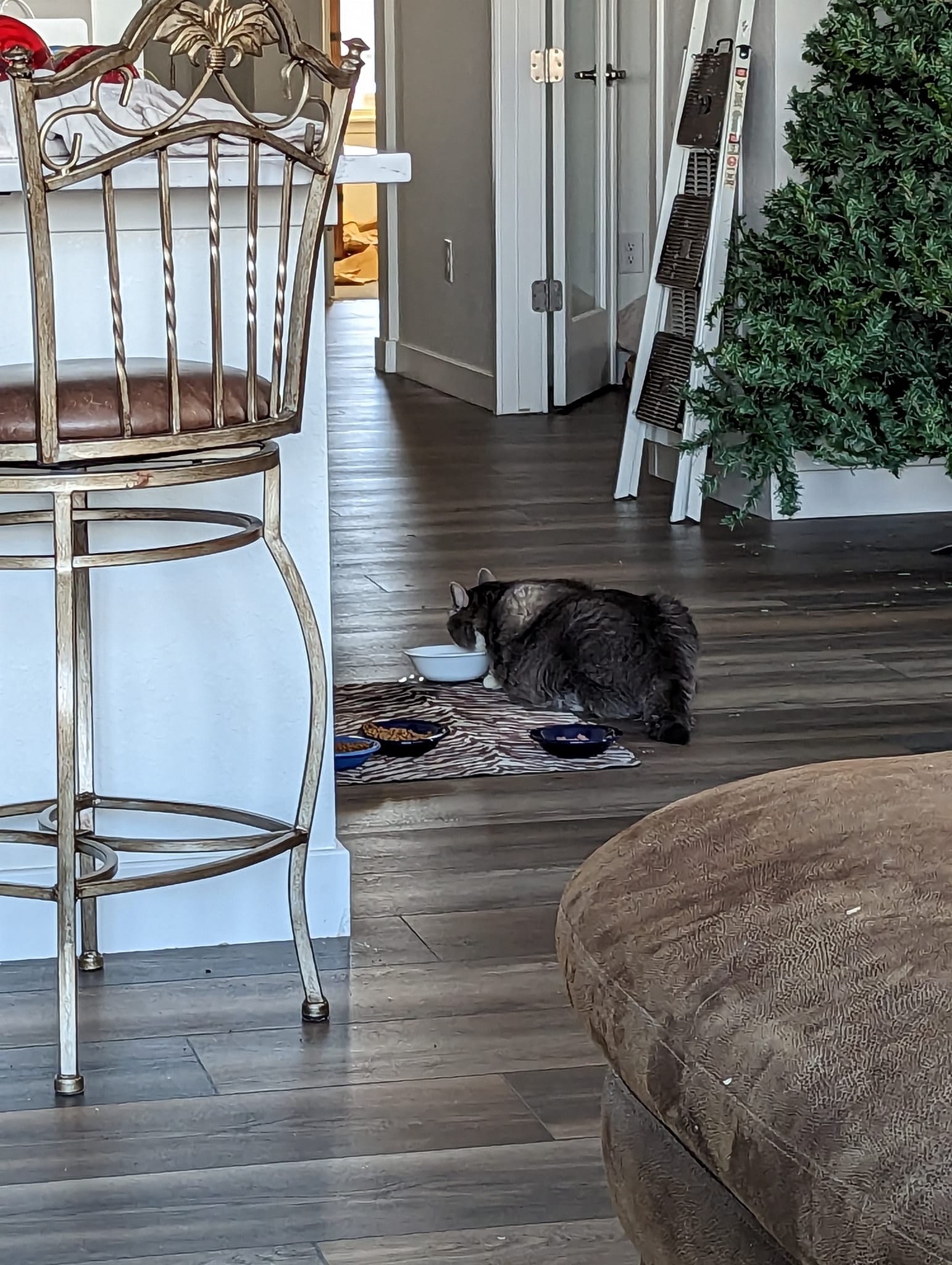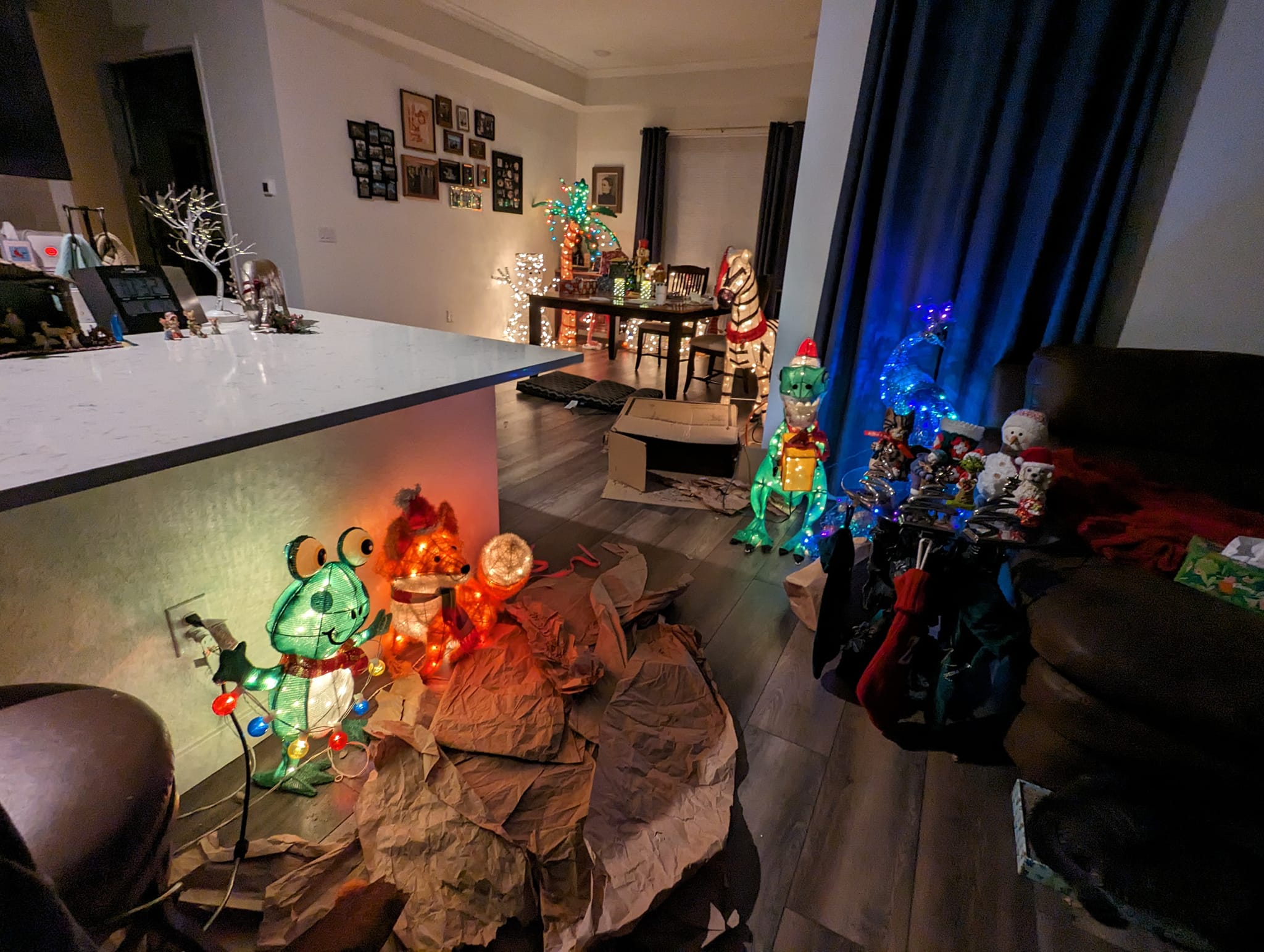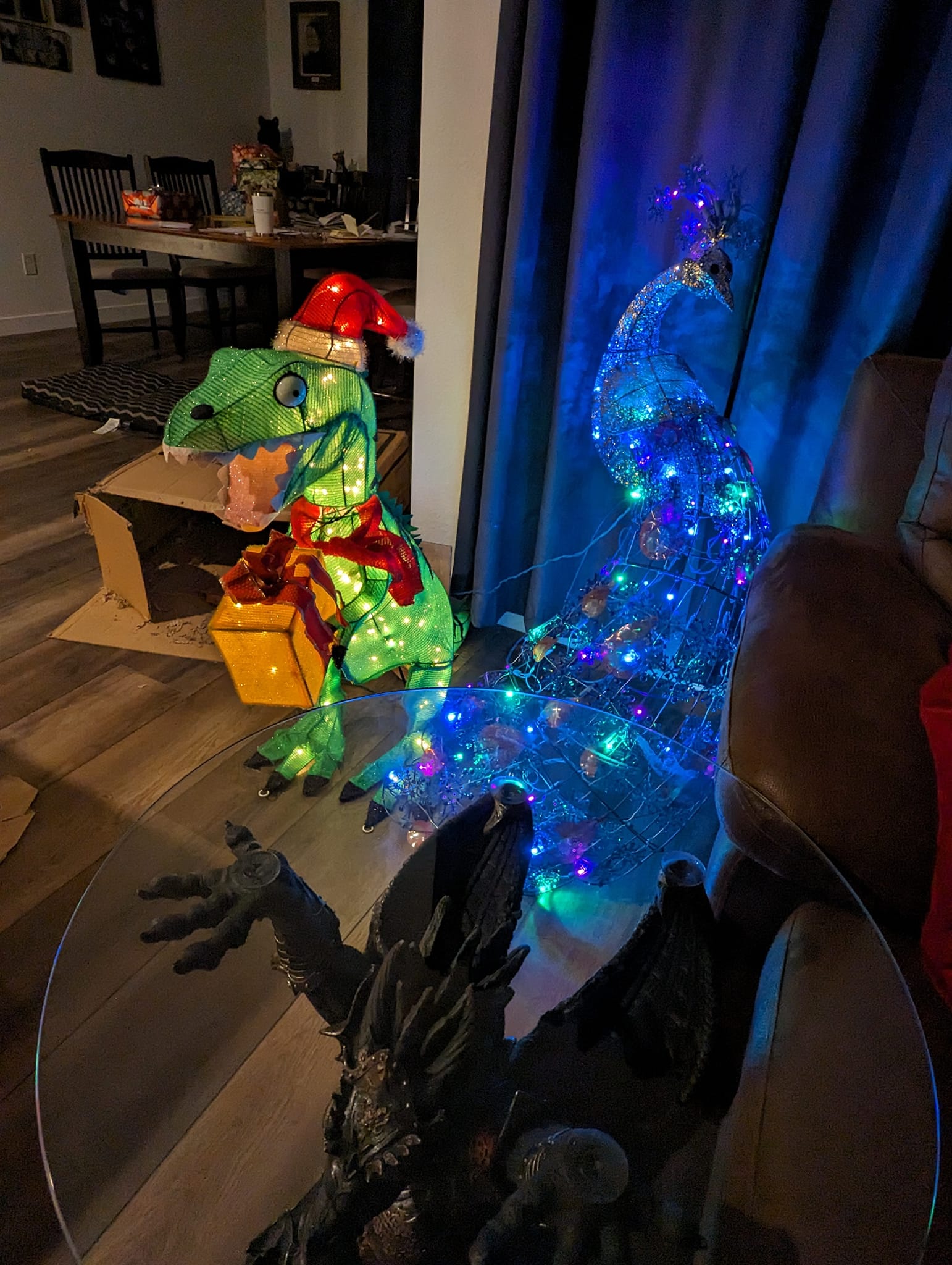 For everyone else, some of you may remember I am in Christmas decoration parole and have to do annual check-ins to prove the chicken didn't have "an accident". Many years ago, the family used to do an ornament exchange for Christmas Eve. I drew a box from Rob, containing a fancy chicken. I was um... nonplussed. But no one would trade with me, so it became mine. After we got home, I put it on our tree, and somewhere in the timeline, the fancy chicken suffered an accident through which it became decapitated. An honest accident. That's my story and has always been my story. Rob said the good news was that the store still had more. So, the replacement arrived with an annual health check requirement, including that he be placed in a visible part of the tree so the health check could be verified. ????????