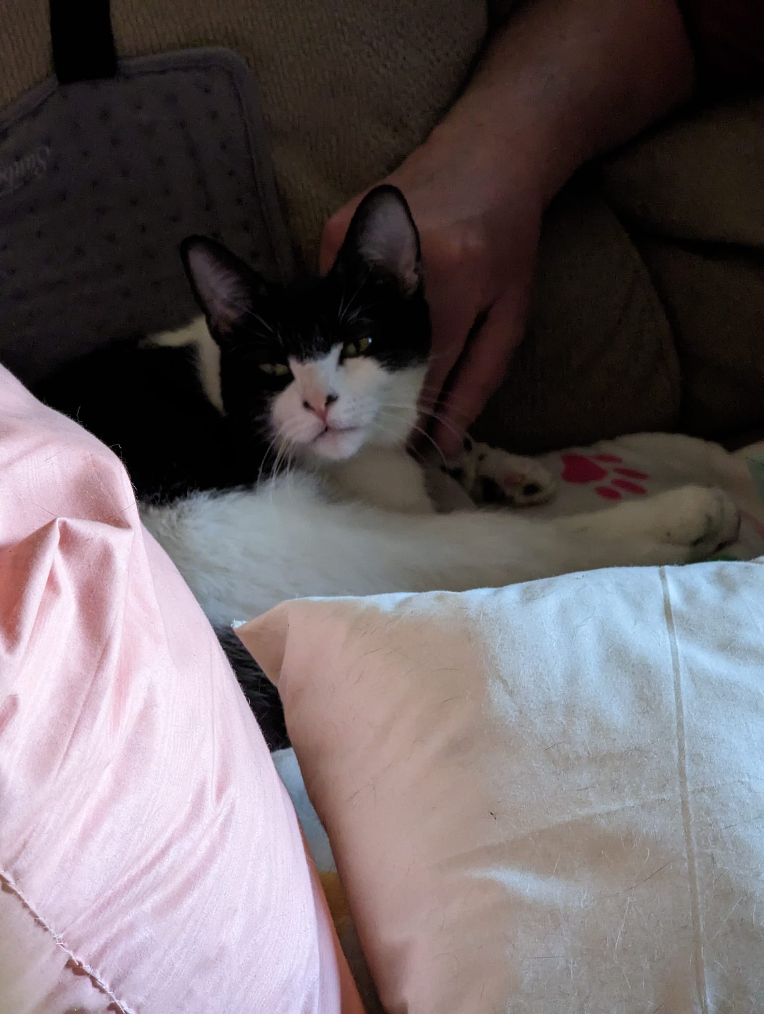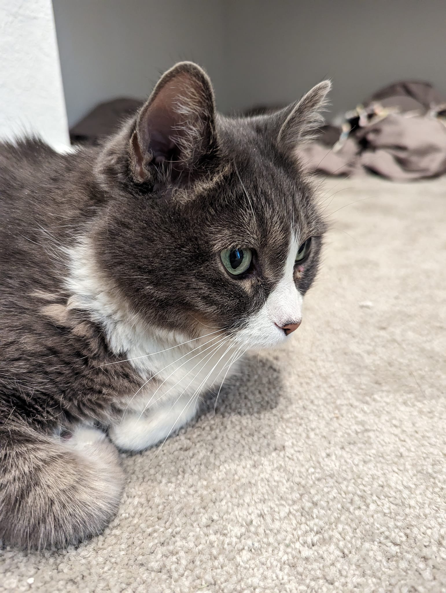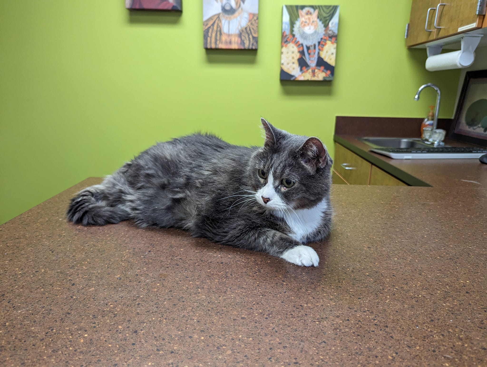 We went to the regular vet today. They did some chest x-rays and drew blood to test for pancreatitis. Results early next week. The X-rays revealed an arthritis hitch in her back. So, they did a laser pain therapy session on that and another water pack. She has definitely perked up and resumed normal eating and litter habits. The pain treatment is supposed to last 3 days.