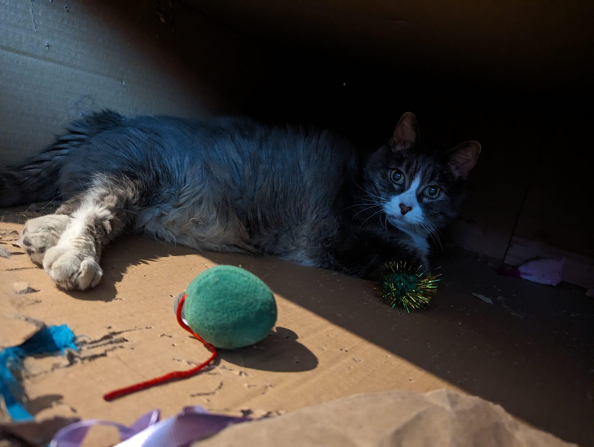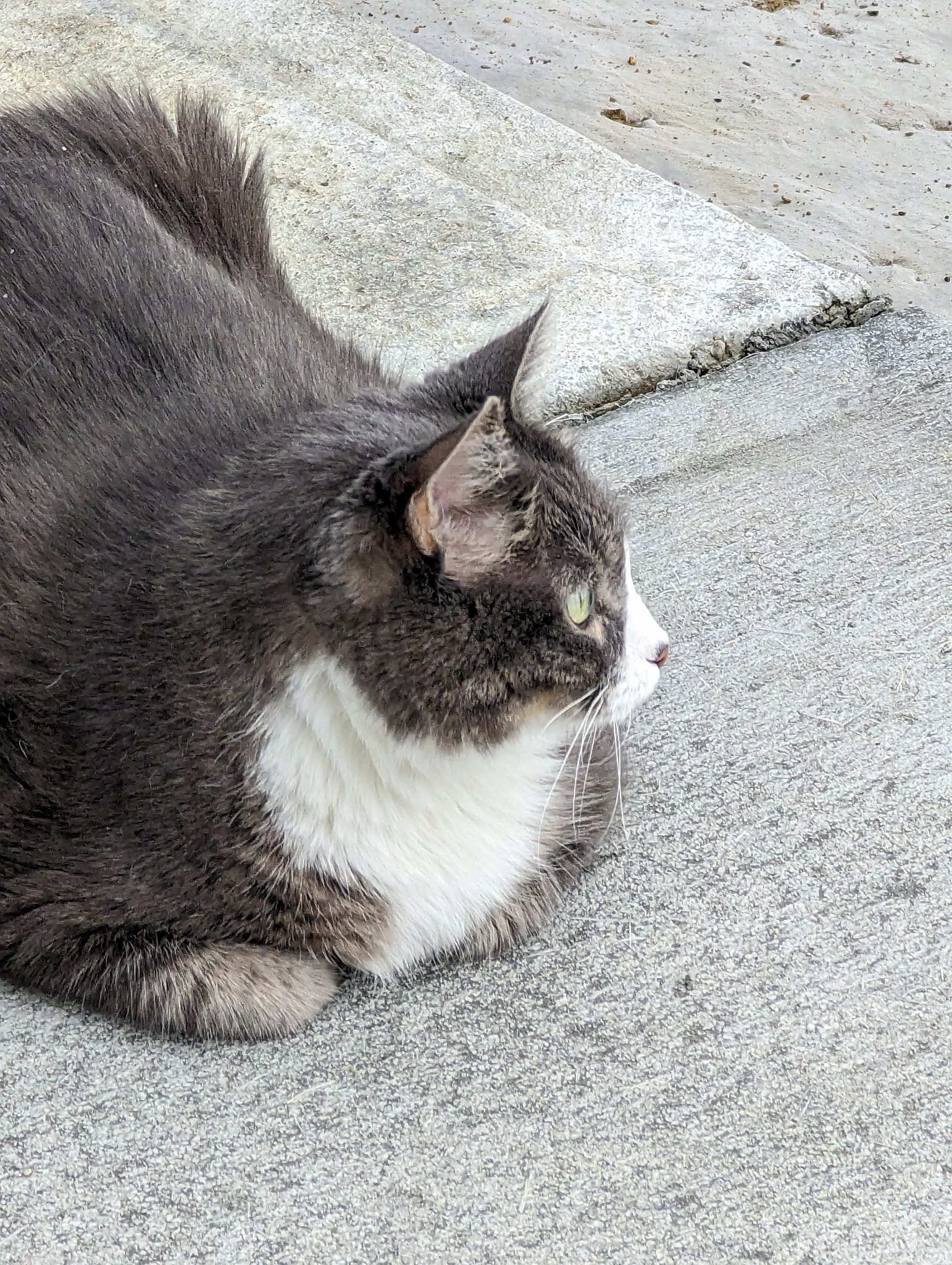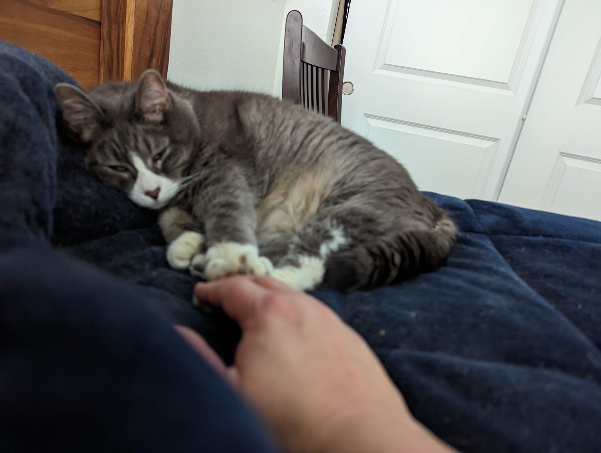 We went to the regular vet today. They did some chest x-rays and drew blood to test for pancreatitis. Results early next week. The X-rays revealed an arthritis hitch in her back. So, they did a laser pain therapy session on that and another water pack. She has definitely perked up and resumed normal eating and litter habits. The pain treatment is supposed to last 3 days.