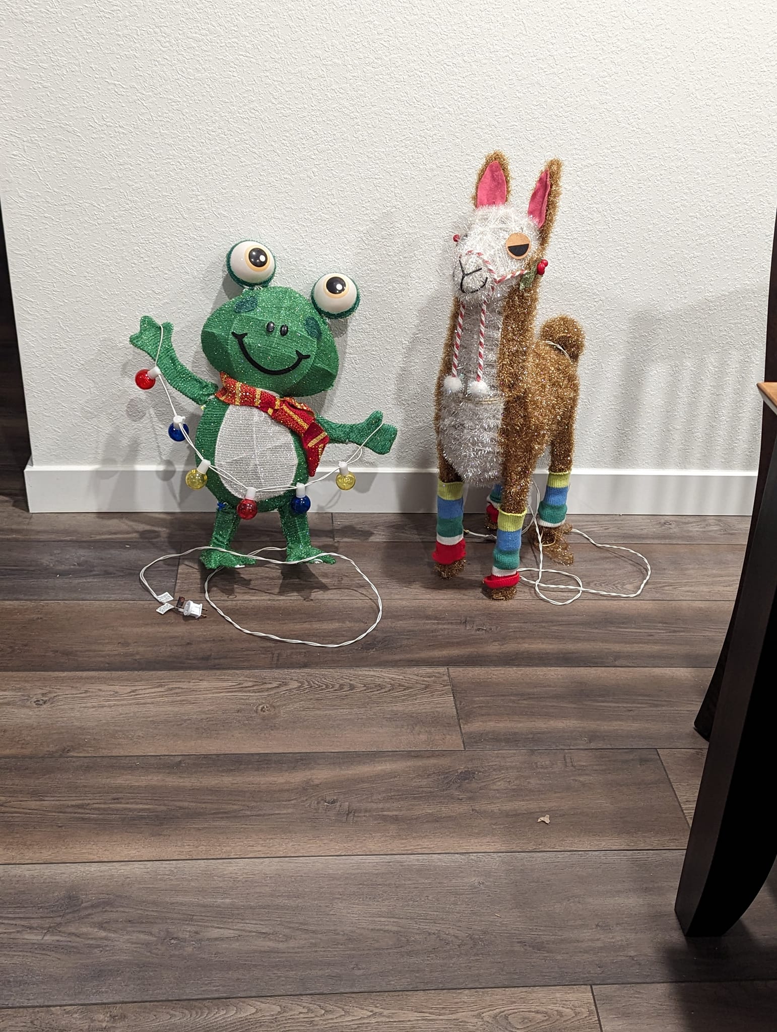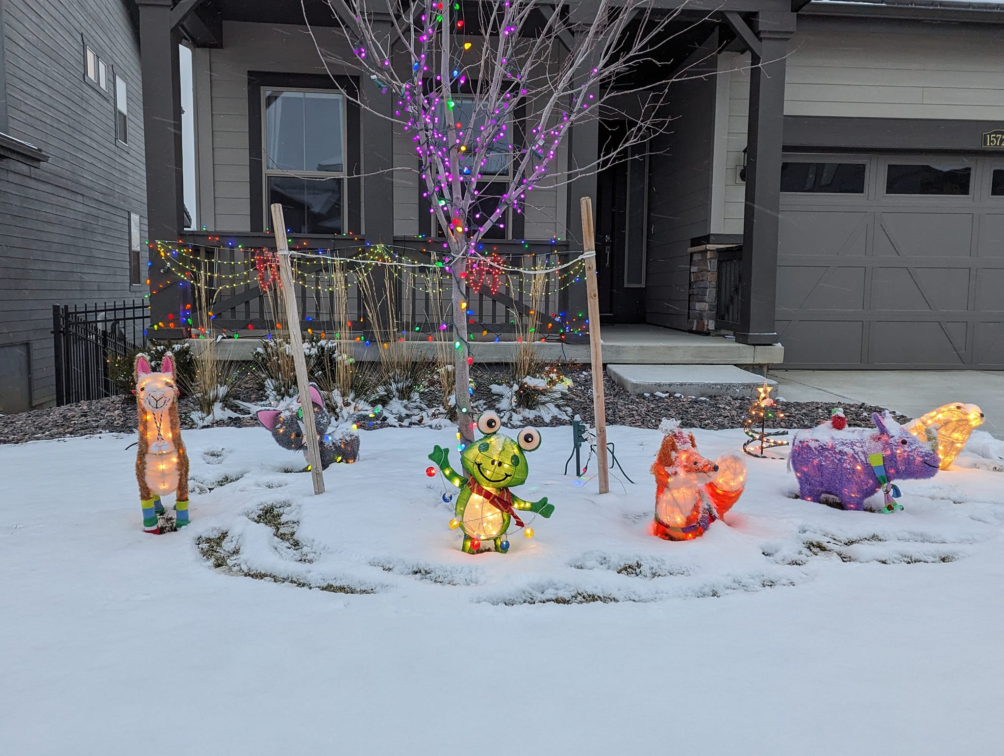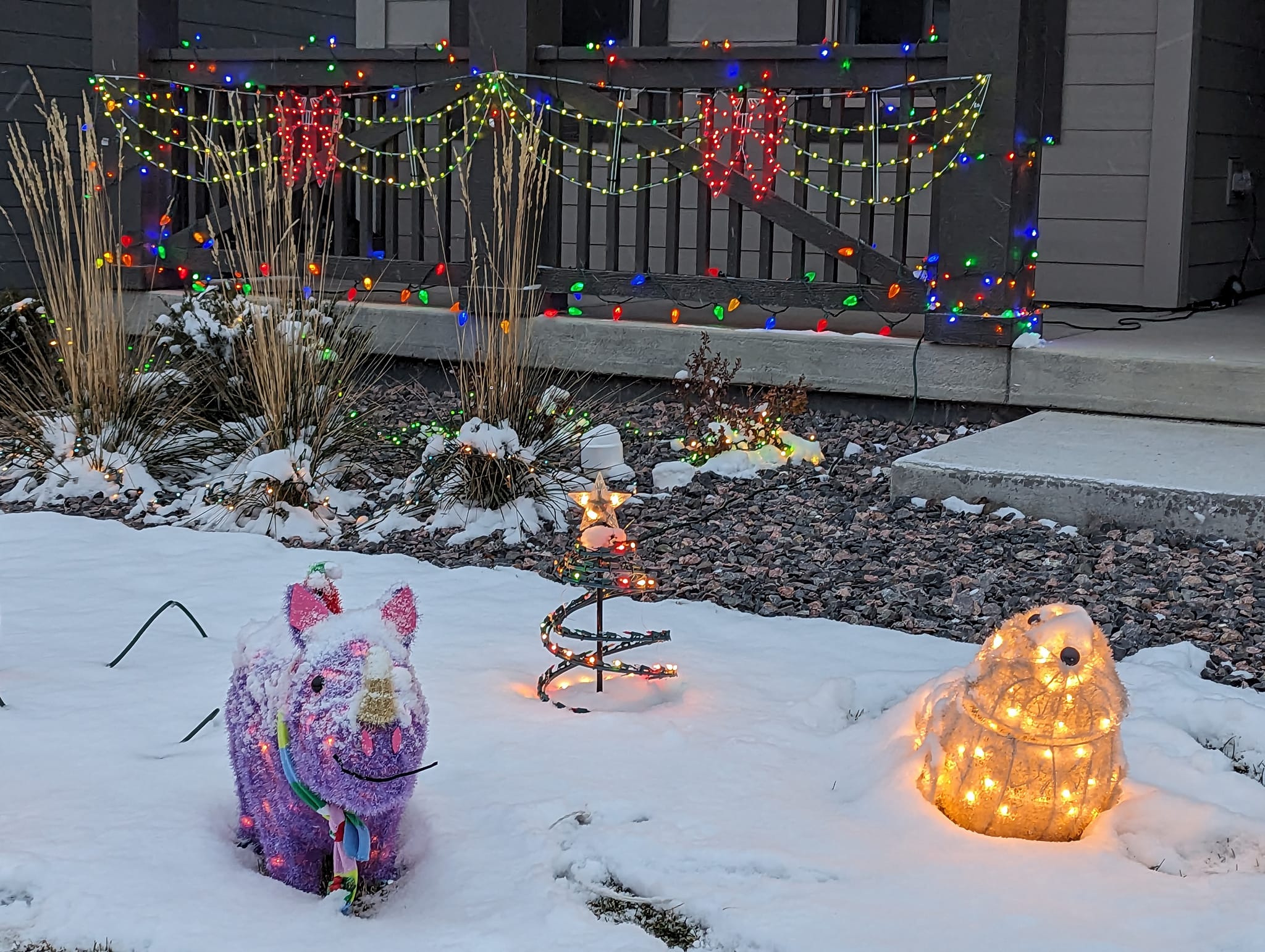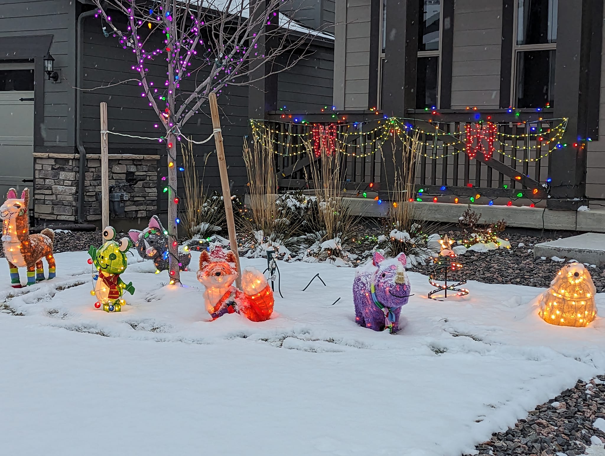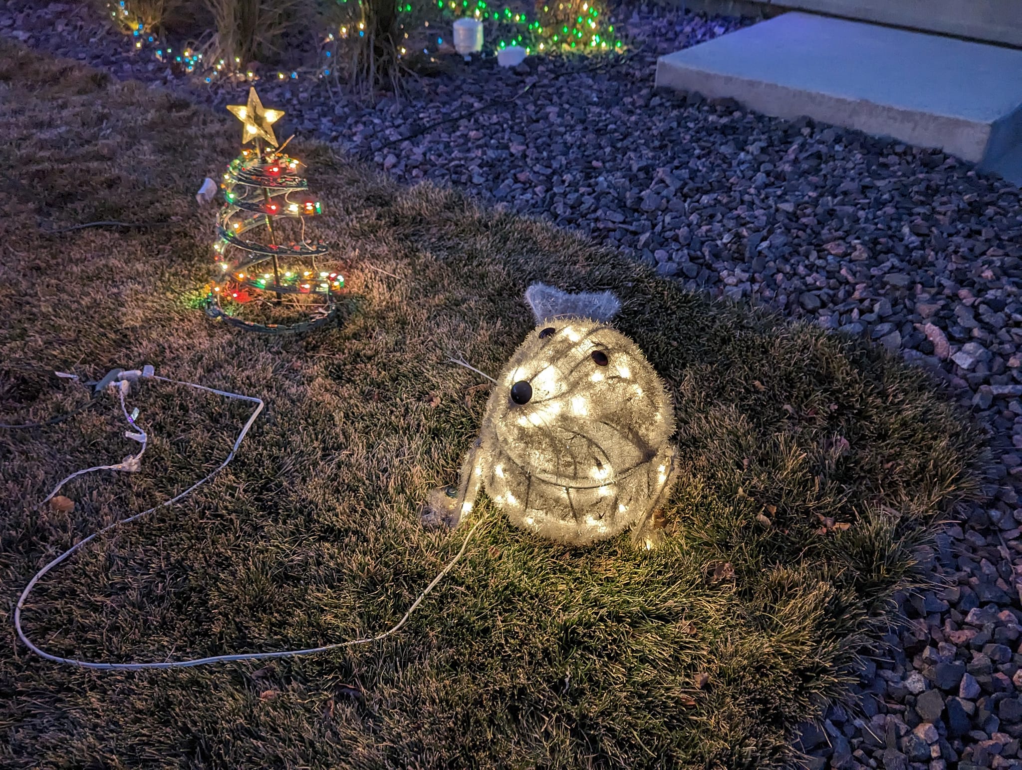 And then there were 3. The wind did a number on one of my old extension cords... Really peeled back the protective cover. Glad I saw it before the snow. Ziggy's decoration is also happy.