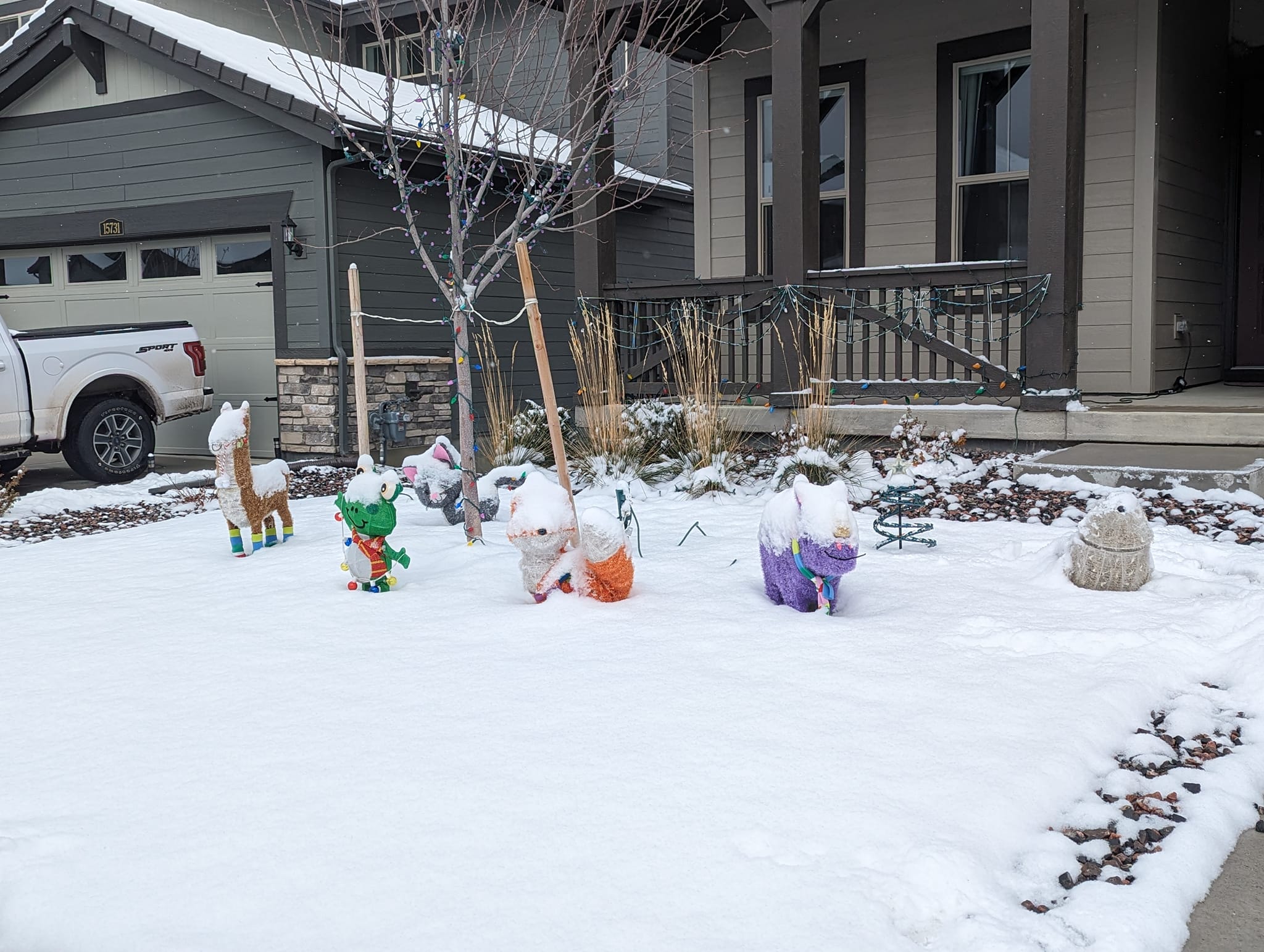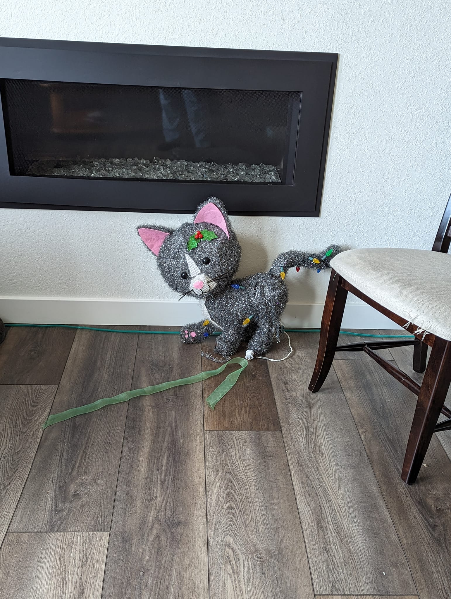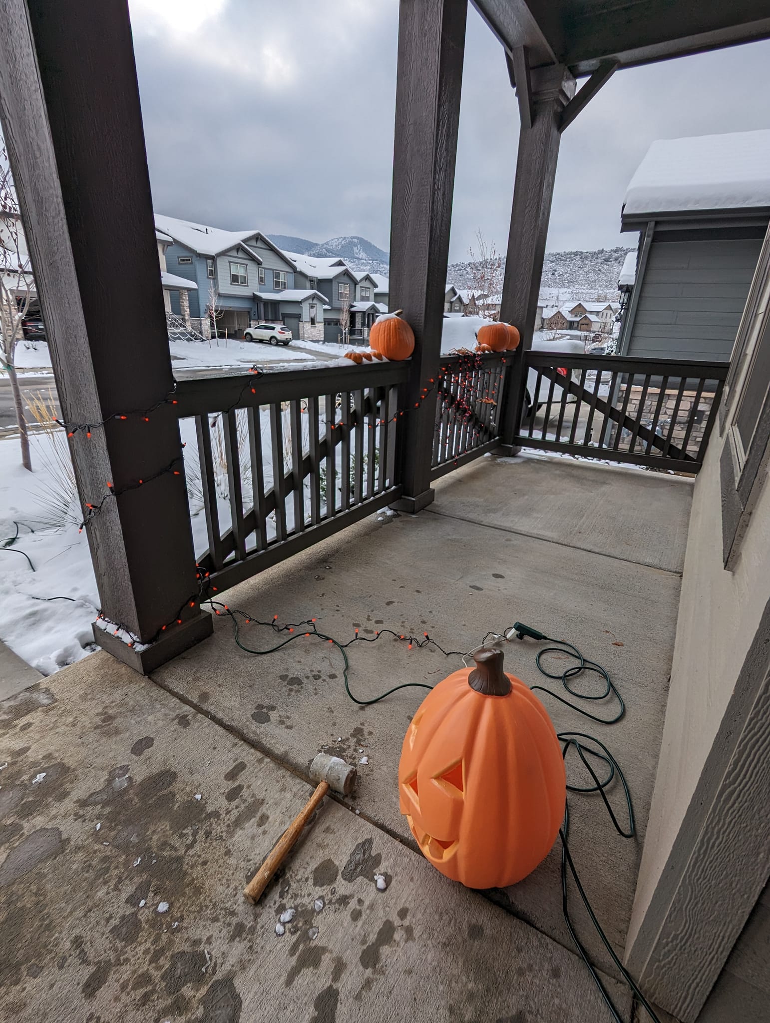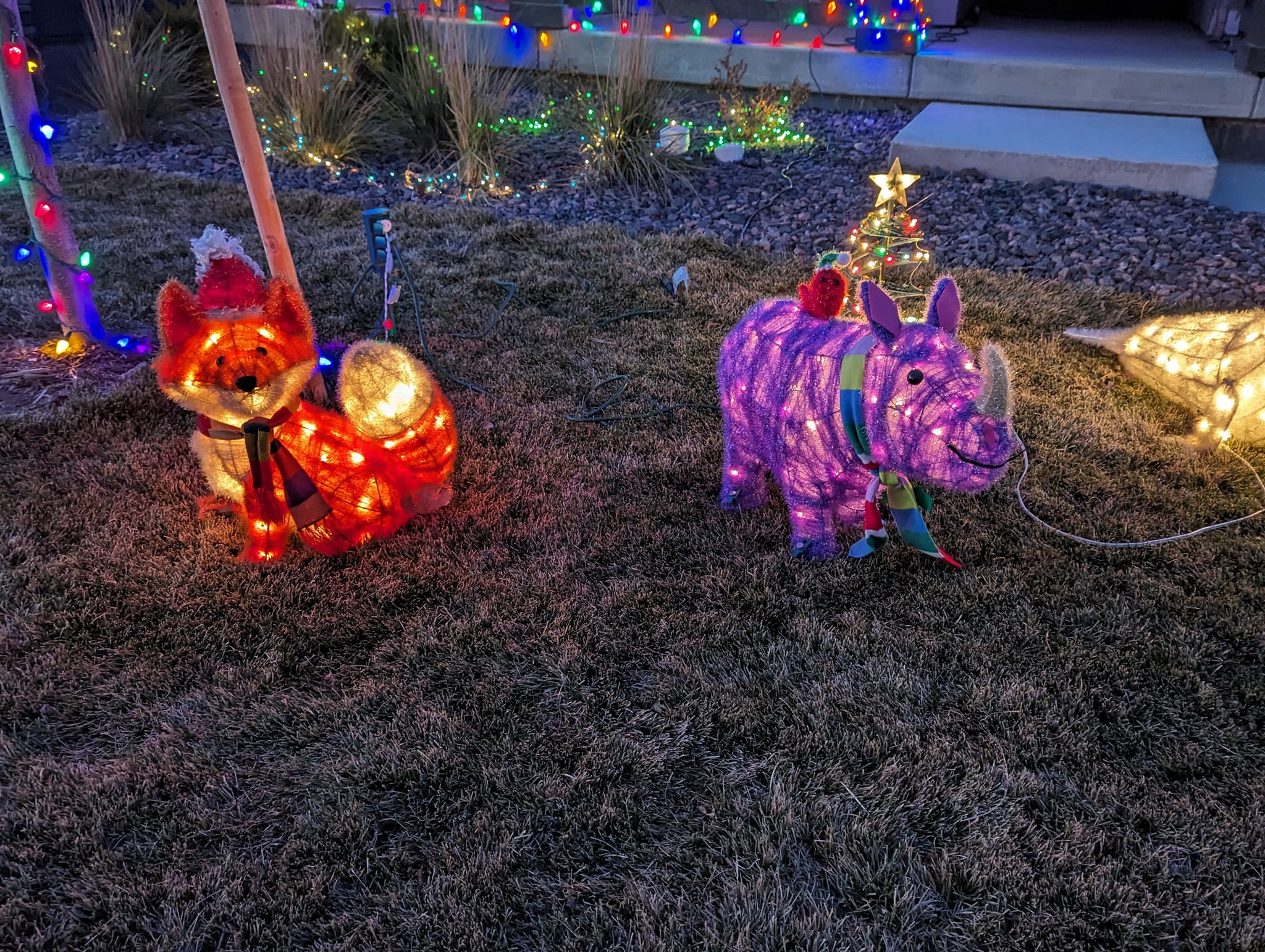 And then there were 3. The wind did a number on one of my old extension cords... Really peeled back the protective cover. Glad I saw it before the snow. Ziggy's decoration is also happy.