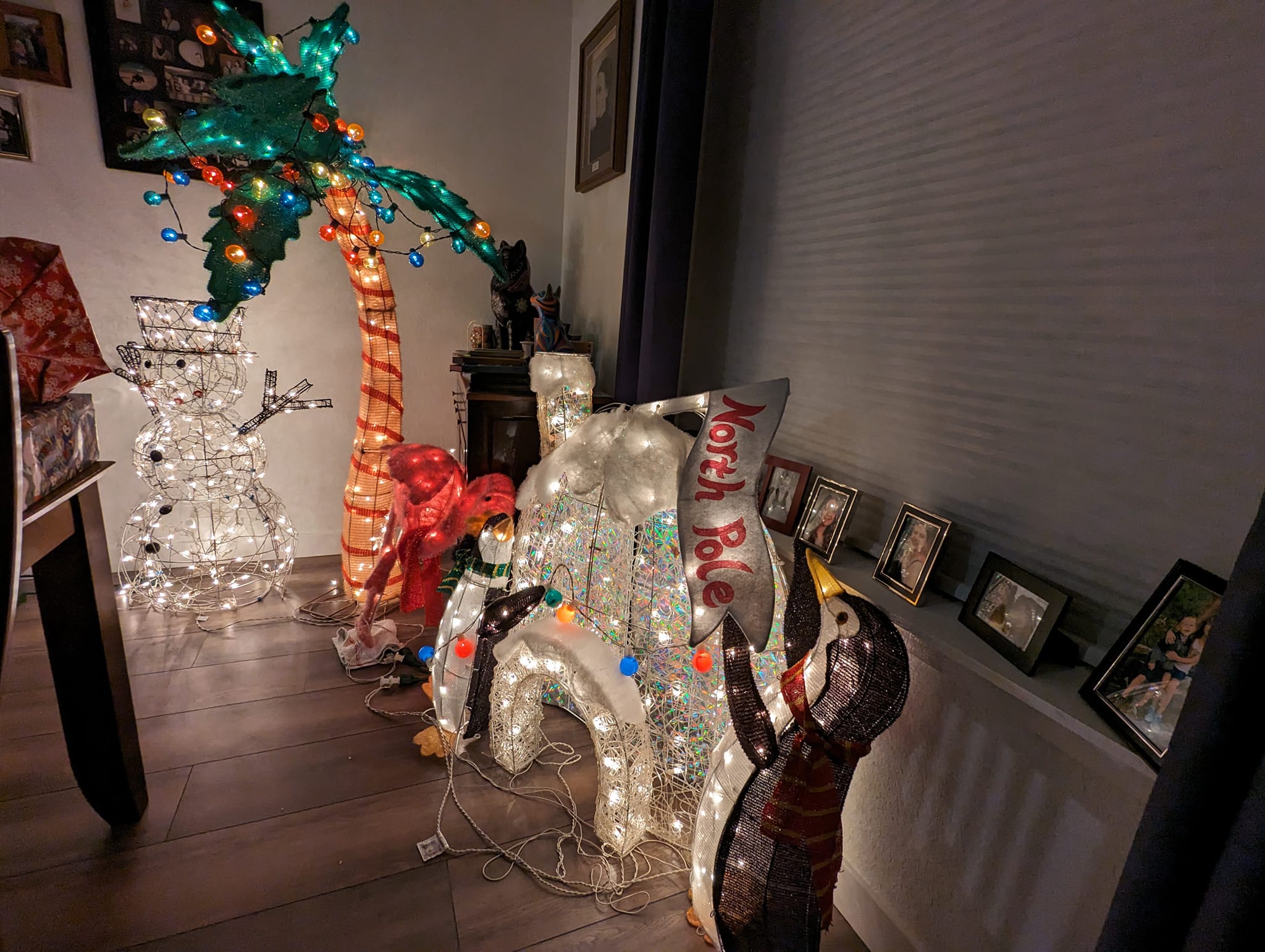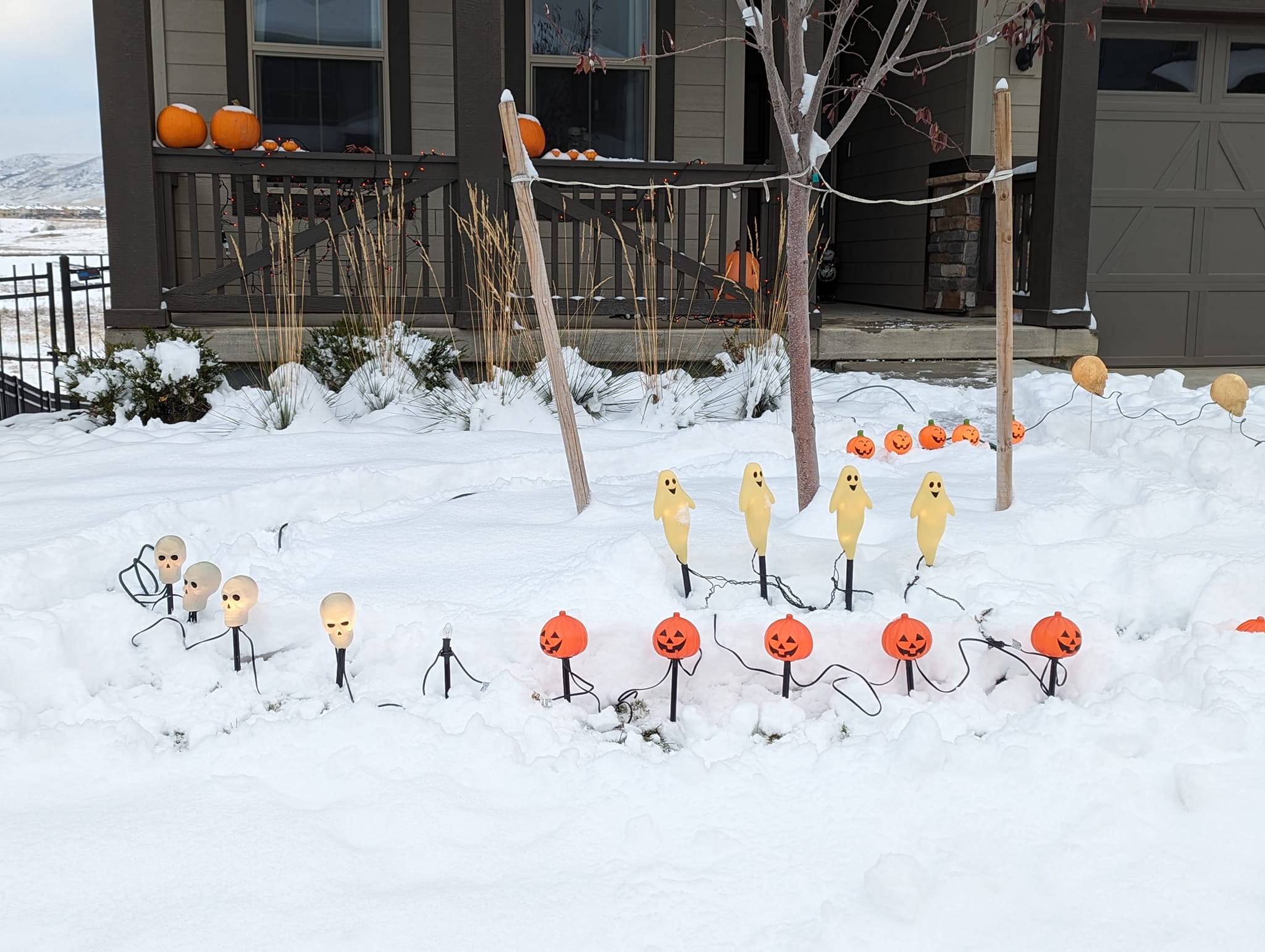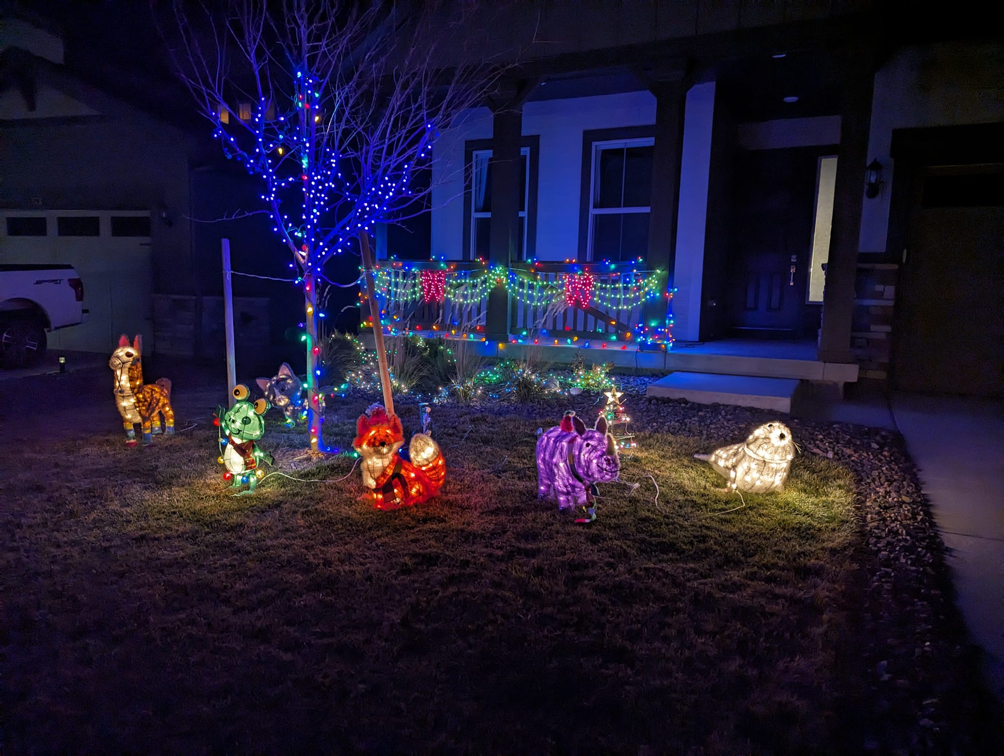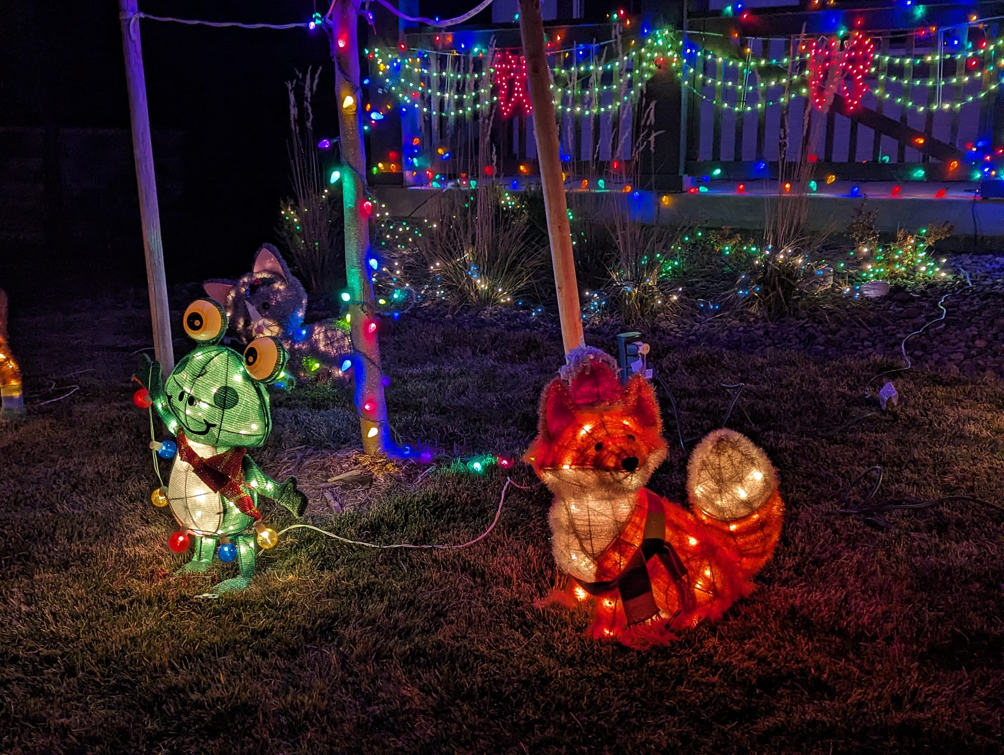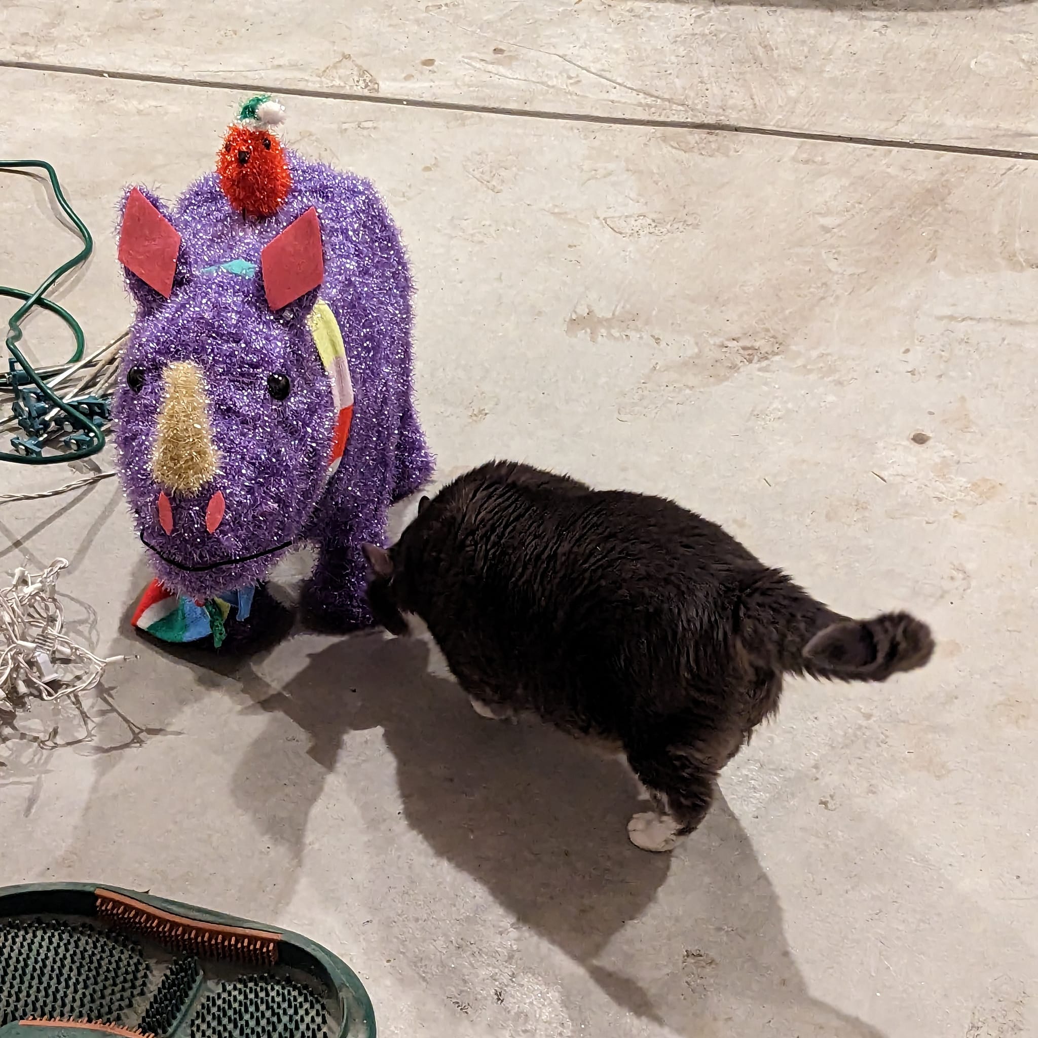 And then there were 3. The wind did a number on one of my old extension cords... Really peeled back the protective cover. Glad I saw it before the snow. Ziggy's decoration is also happy.